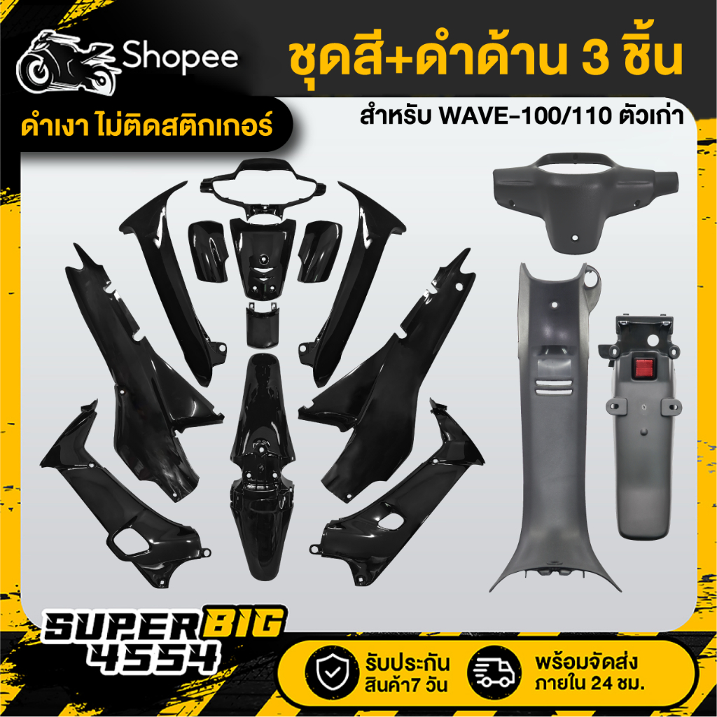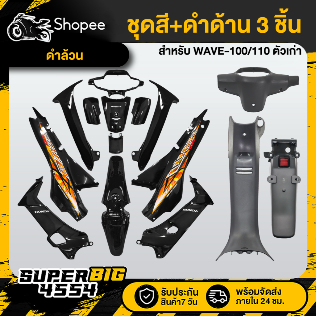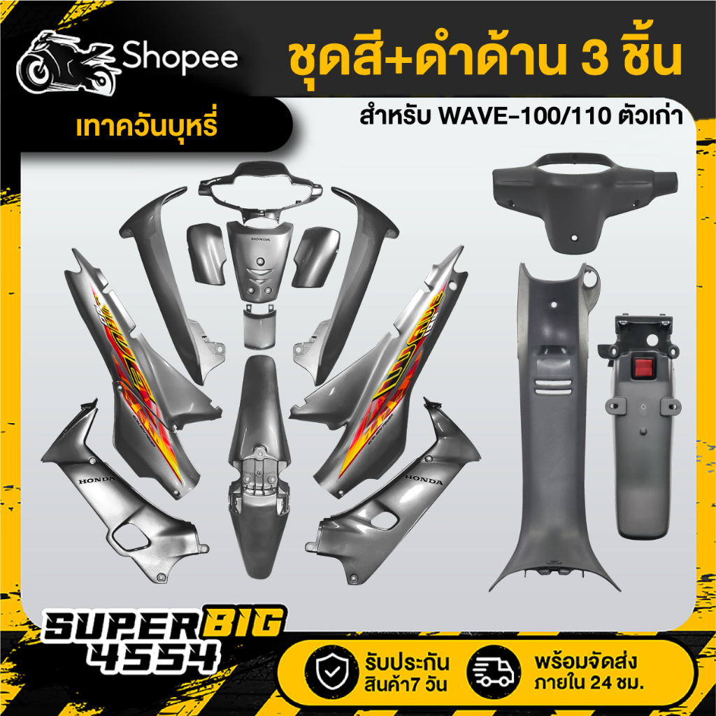 [เลือกสีด้านใน] ชุดสี WAVE-100 WAVE-110 ตัวเก่า ไฟ2 ตา ดิสเบรค เวฟ110 ดิสเบรค ติดสติกเกอร์เรียบร้อย สี 2K โทนเทา/ดำ+หน้ากากหลัง+คอนโซนกลาง+บังโคลนหลัง (ดำด้าน3ชิ้น)