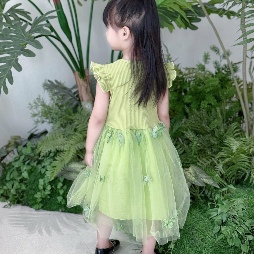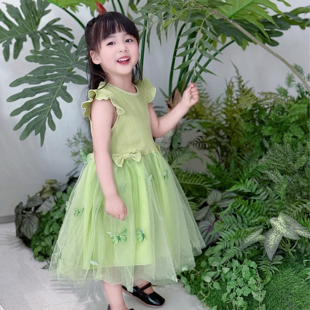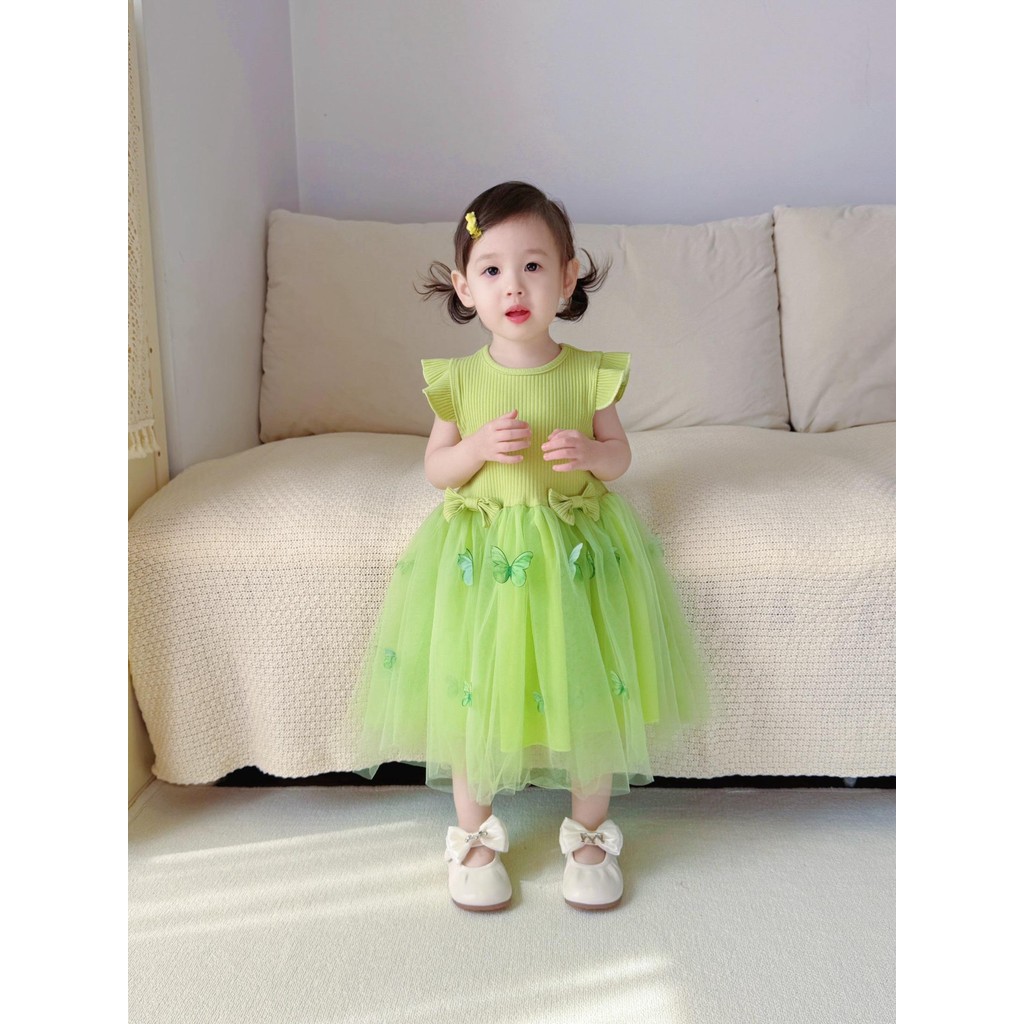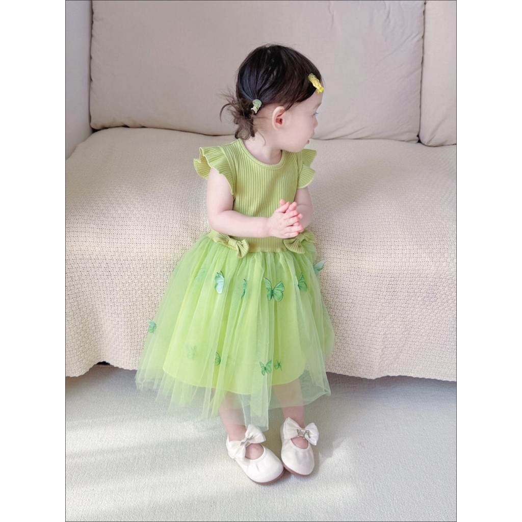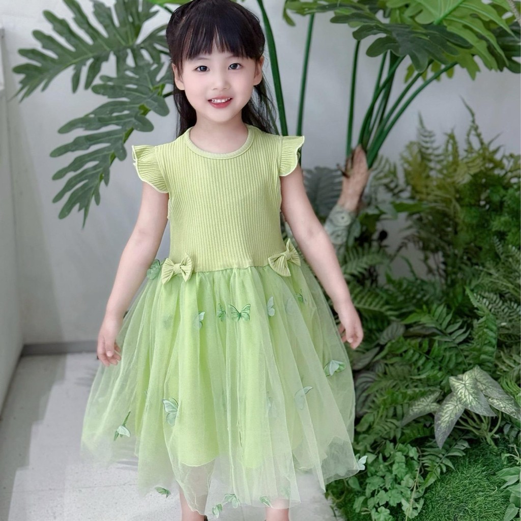 ชุดเดรสเด็กหญิง 1 2 3 4 5 6 ขวบ แขนสั้น ผ้าฝ้าย ลูกไม้ 3D ผีเสื้อ นูน