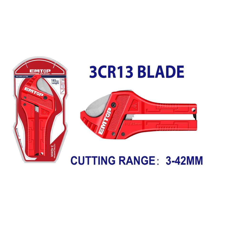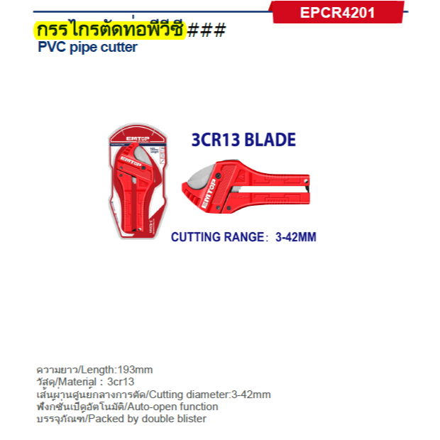EMTOP รุ่น EPCR4201 กรรไกรตัดท่อพีวีซี สำหรับตัดท่อ 3-42mm ความยาว 193mm. คีมตัดพีวีซี กรรไกรตัดท่อ