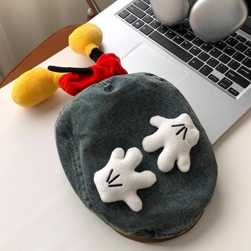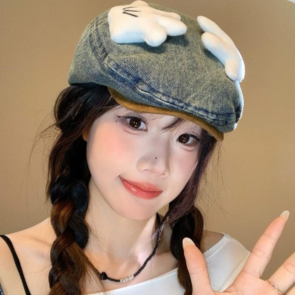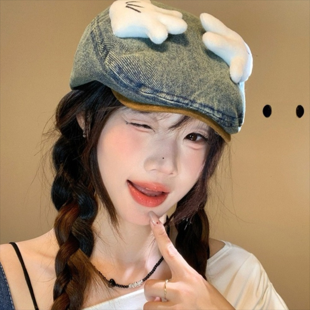 หมวกเบเร่ต์ยีนส์มิกกี้เคน สไตล์วินเทจและเกาหลี หมวกทรงแบนสำหรับสาวๆ