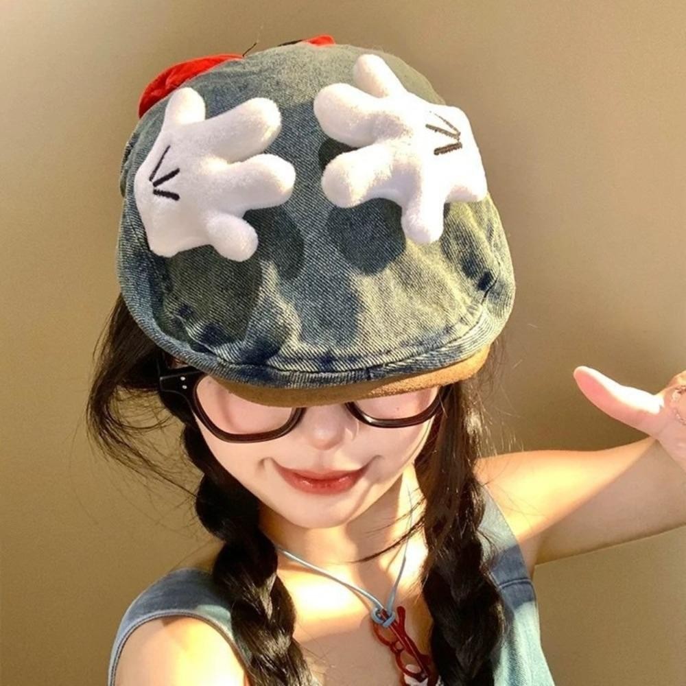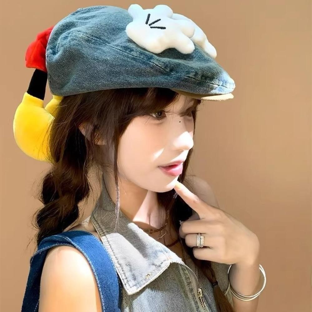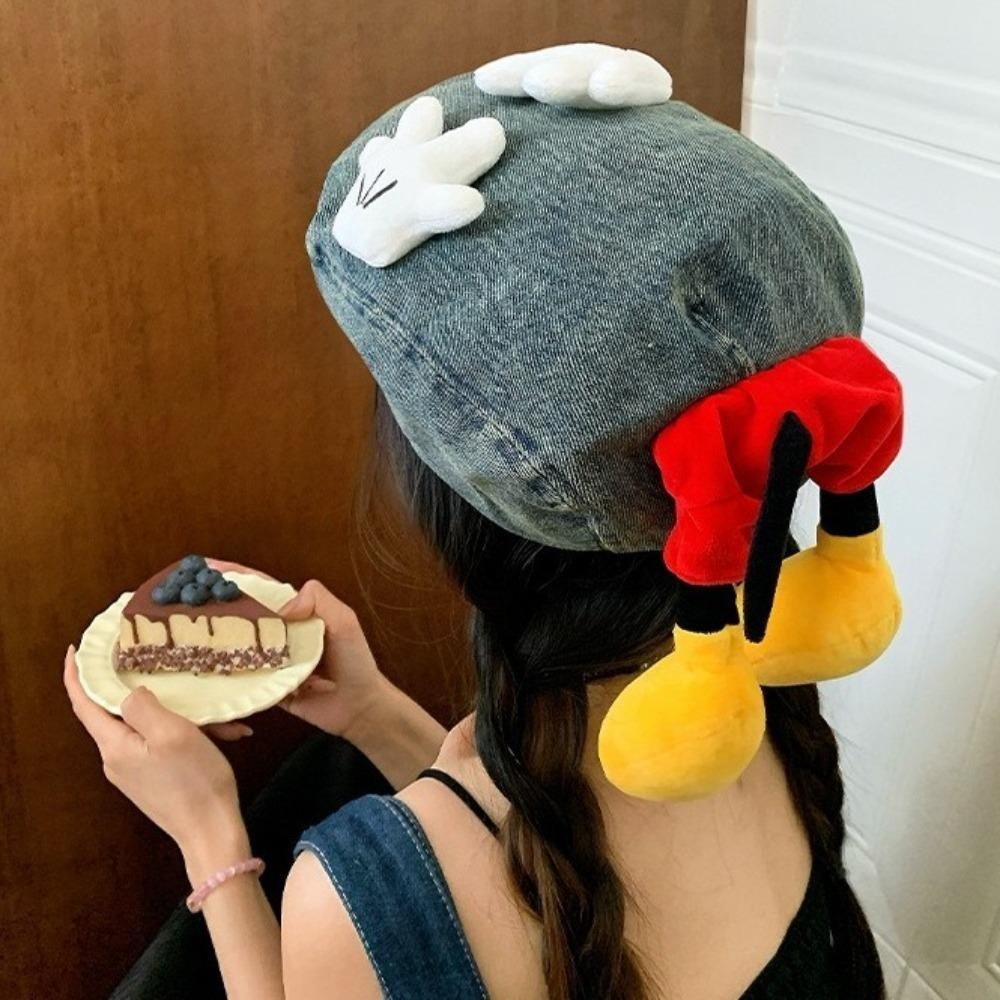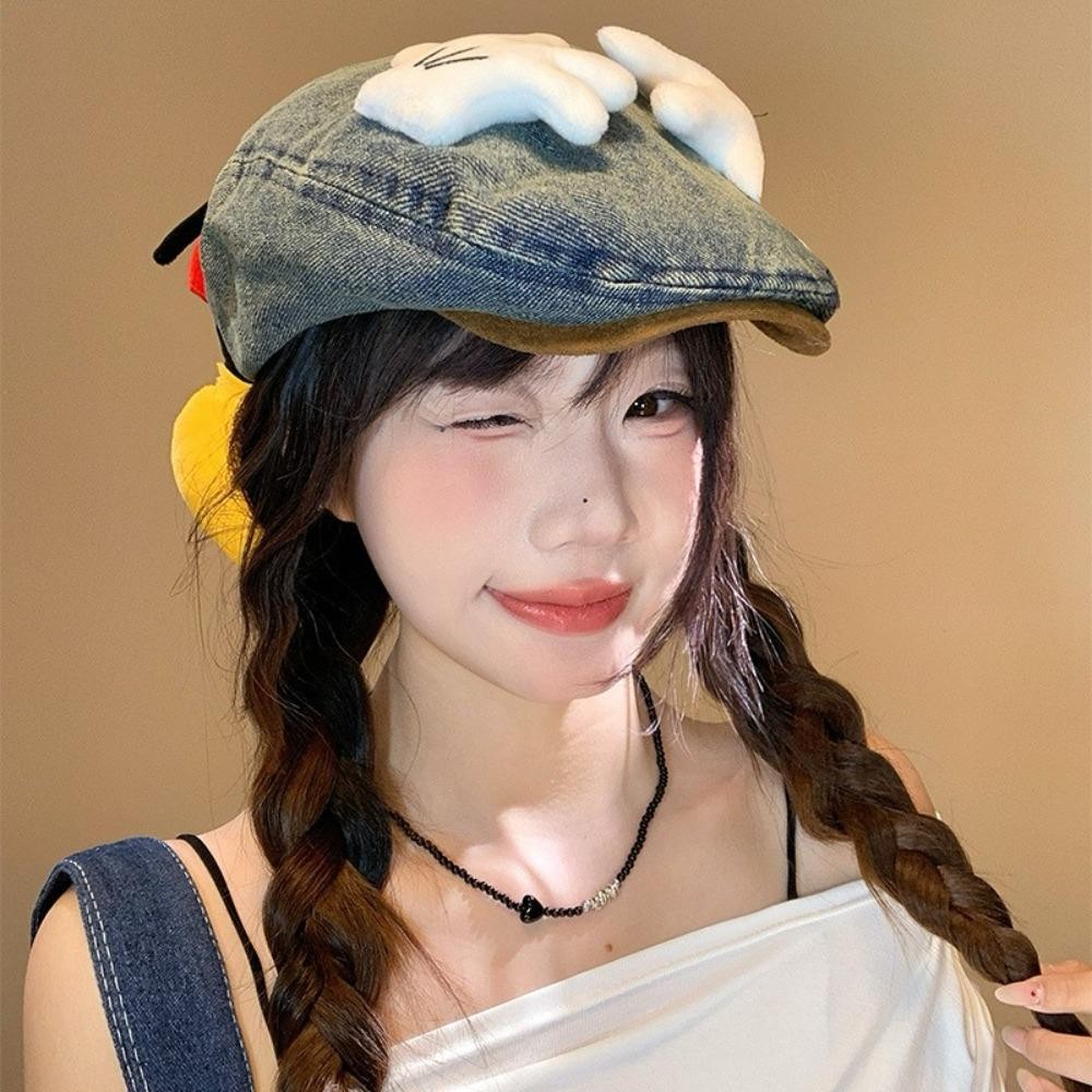 หมวกเบเร่ต์ยีนส์มิกกี้เคน สไตล์วินเทจและเกาหลี หมวกทรงแบนสำหรับสาวๆ