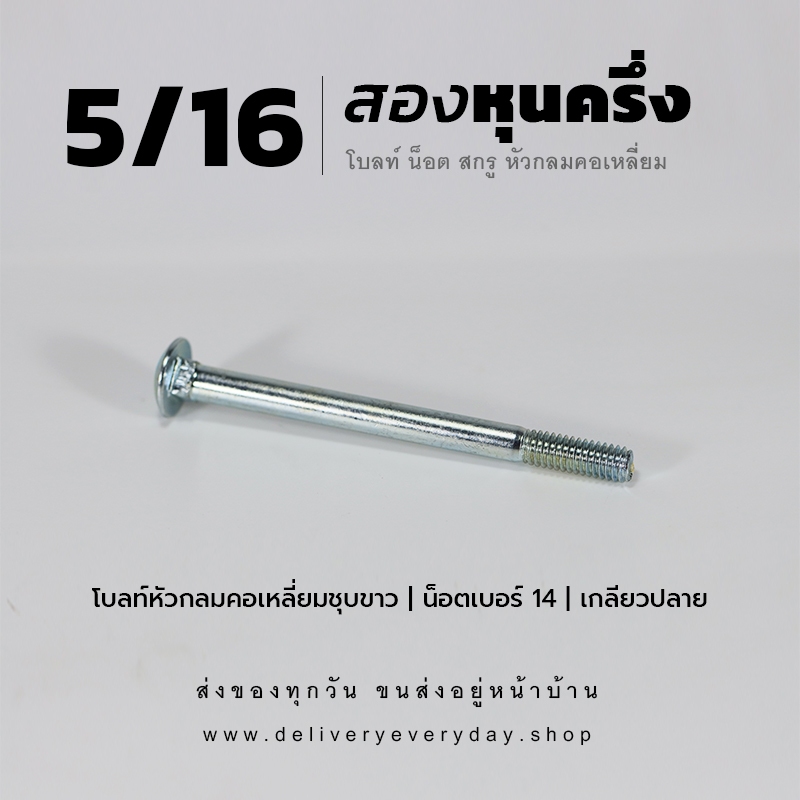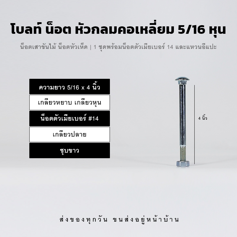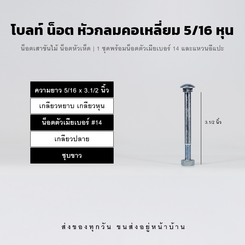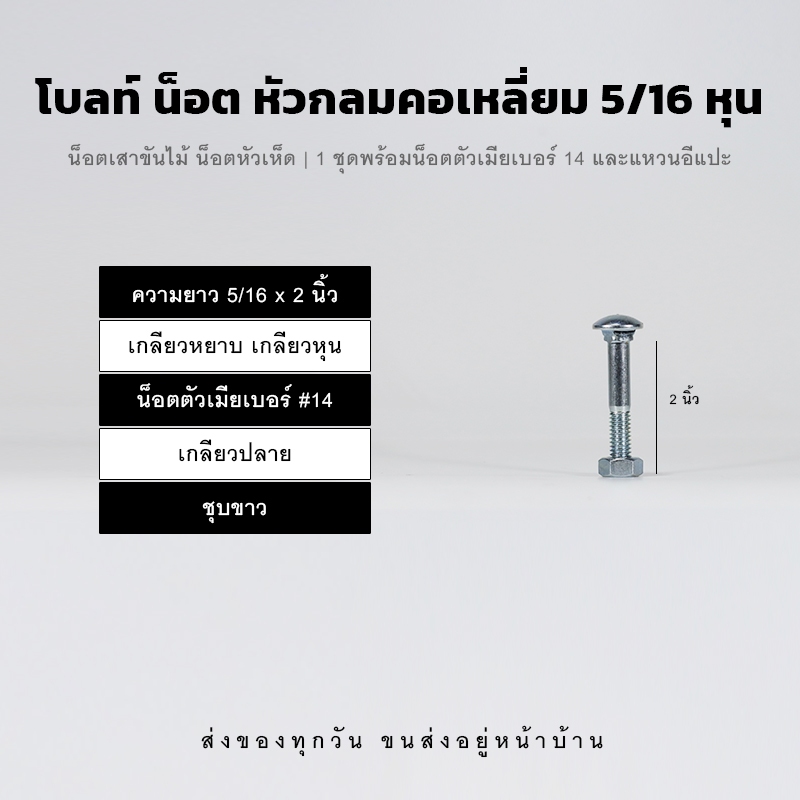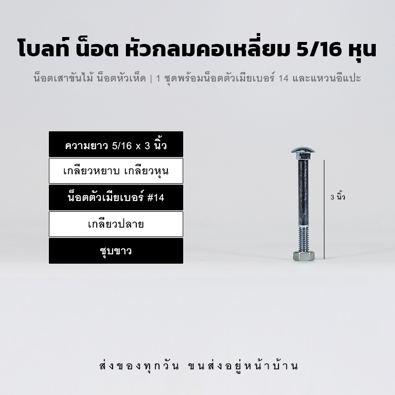 โบลท์ น็อตเสาขันไม้ ขนาด 5/16 (2 หุนครึ่ง) น็อตขาวชุบซิงค์ หัวเห็ด หัวกลมคอเหลี่ยม เกลียวปลาย พร้อมหัวน็อตและแหวนอีแปะ