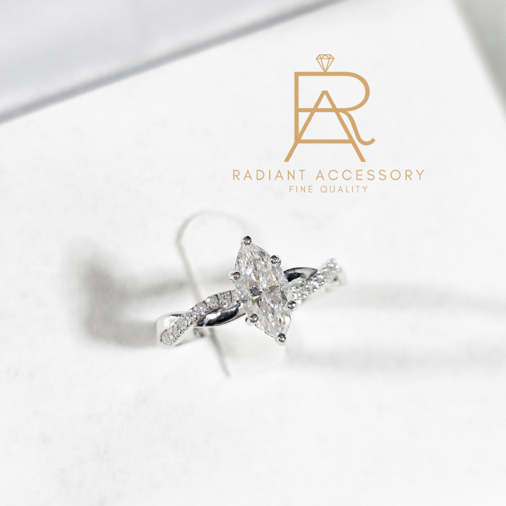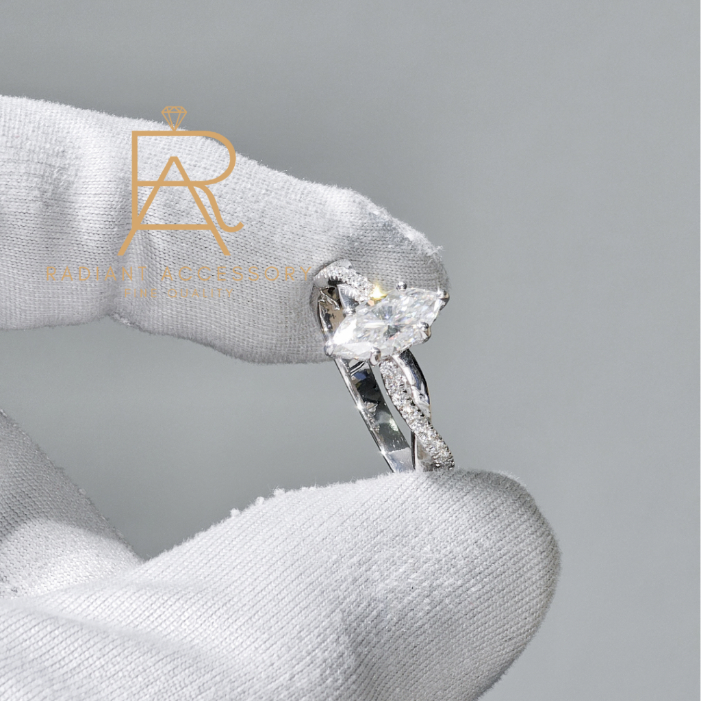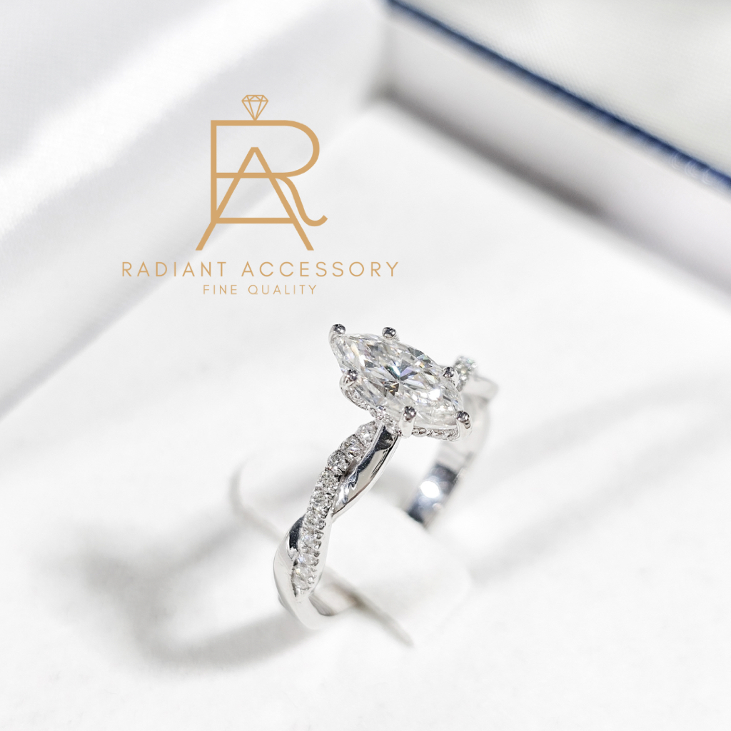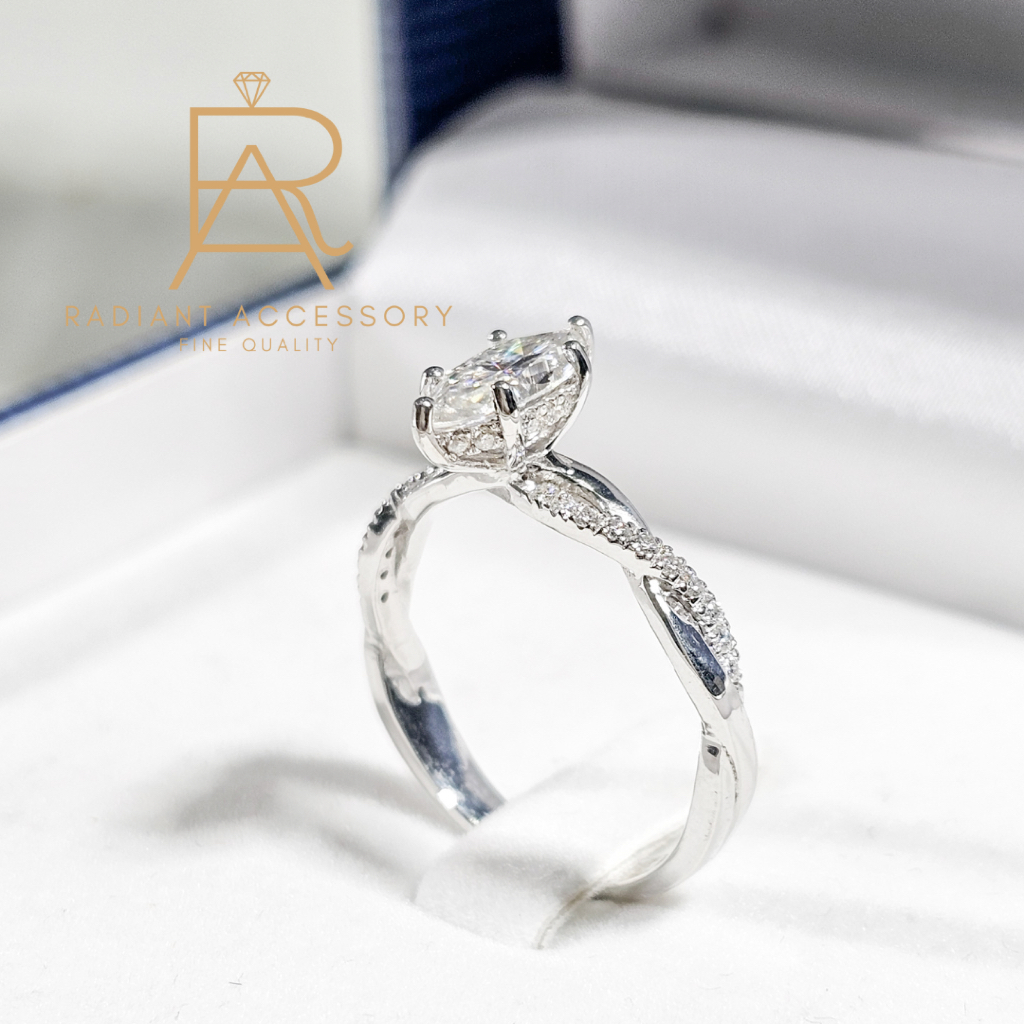 แหวนเงินแท้เม็ดชูฝังเพชร Moissanite 1 กะรัต Marquise cut ก้านลายถัก ฝังบ่าข้าง และ ใต้ฐานชุบทองคำขาว