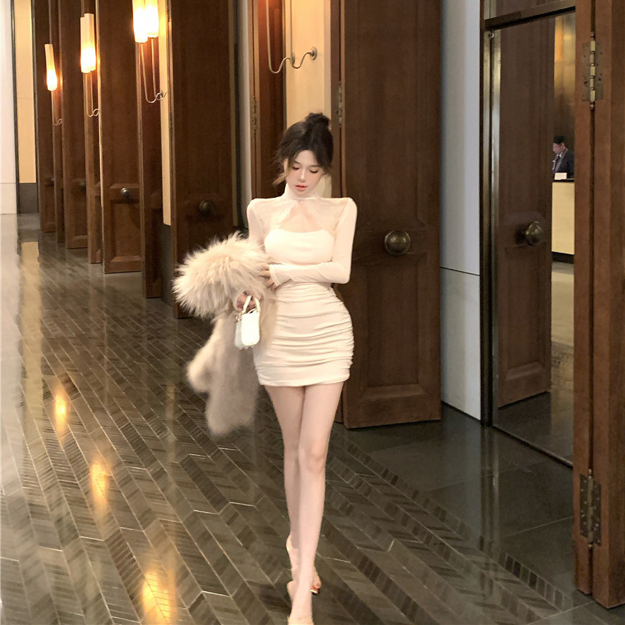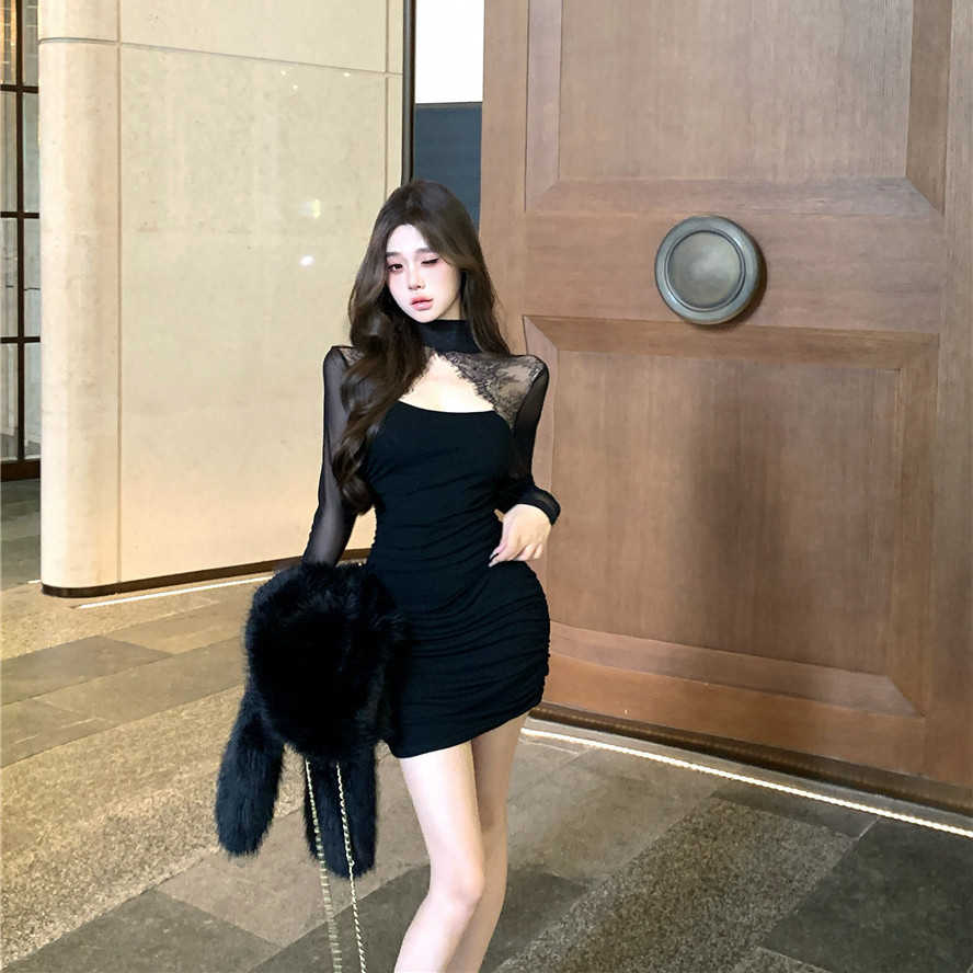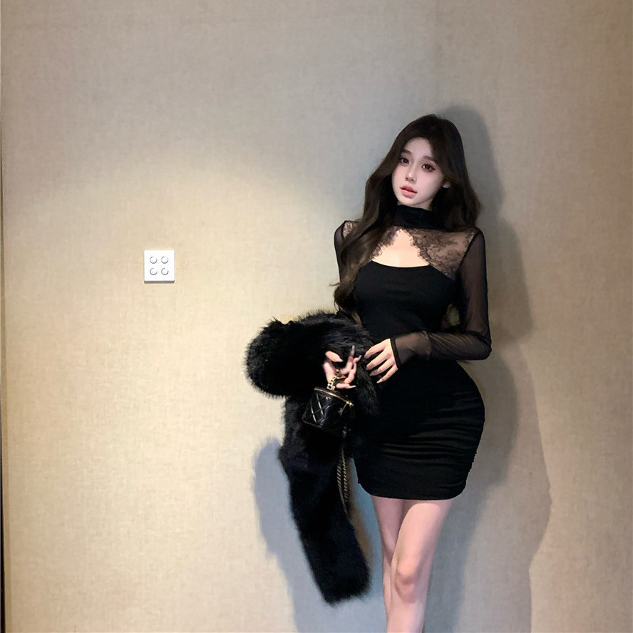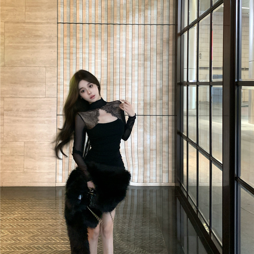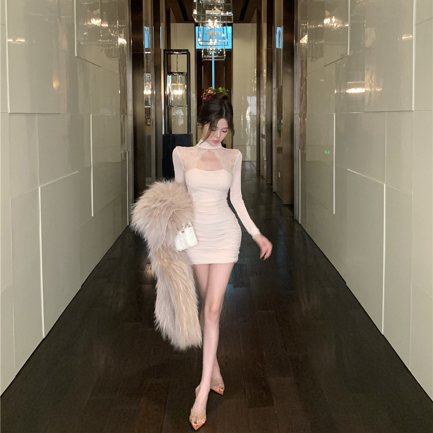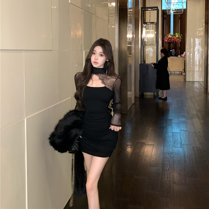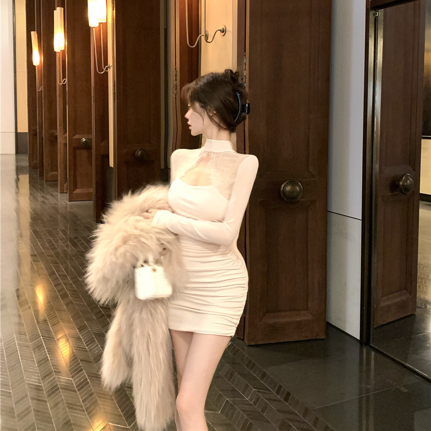 Tempting สไตล์หวานลูกไม้เย็บออกแบบชุดคอสูง Slim-fit Slimmer ดู Hollow Design แขนยาวกระโปรงแน่นผู้หญิง