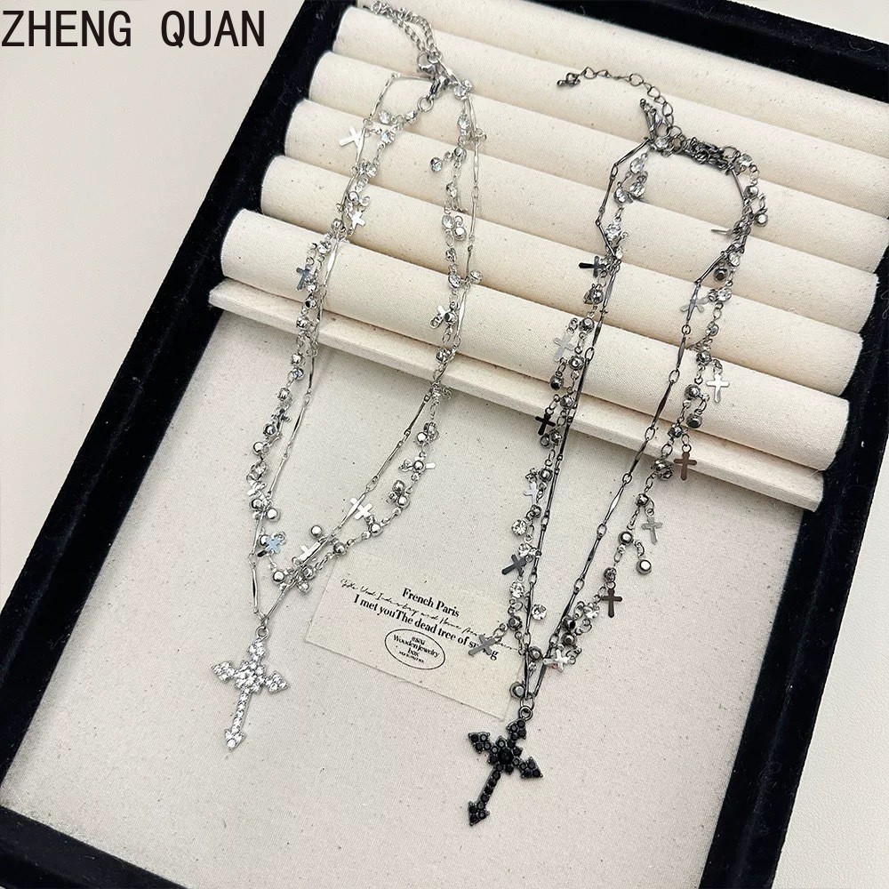 2 ชิ้น/เซ็ต Gothic Punk Cross สร้อยคอ Rhinestone Multilayer สร้อยคอ Clavicle Chain พู่ Choker สําหรับผู้หญิงแฟชั่นเครื่องประดับวันหยุดของขวัญอุปกรณ์เสริมอินเทรนด์สีดํา