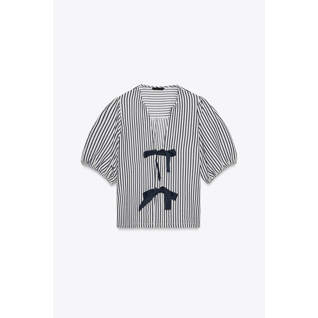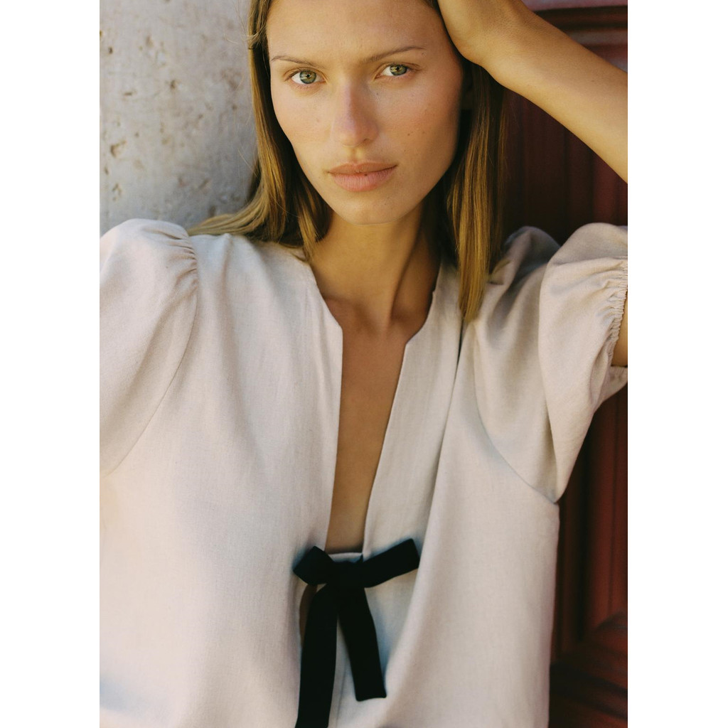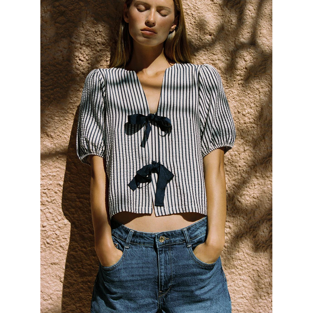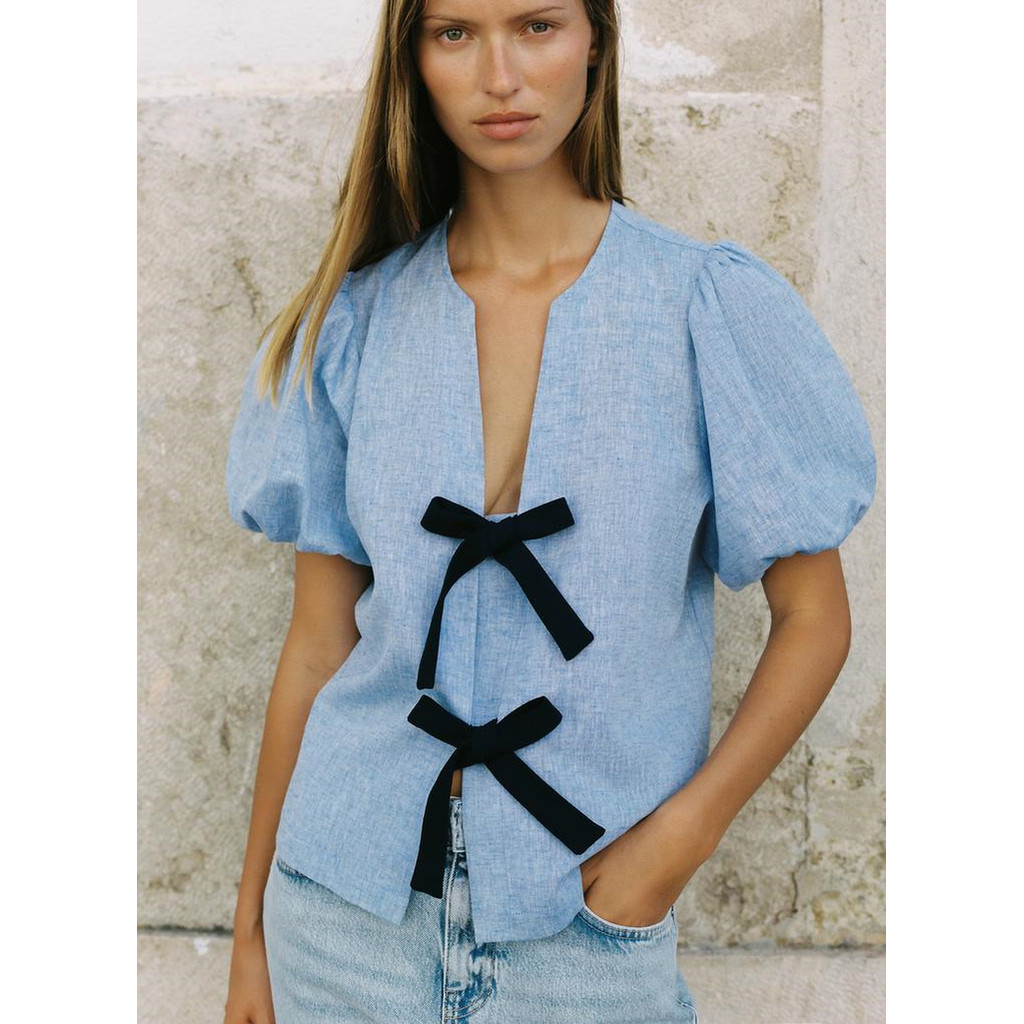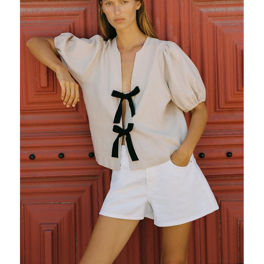 2025 เสื้อเชิ้ตสั้นลินินผสมโบว์ผู้หญิงในช่วงฤดูร้อน 8310789