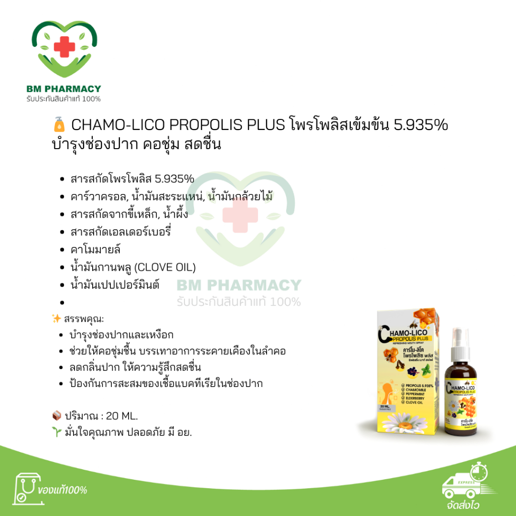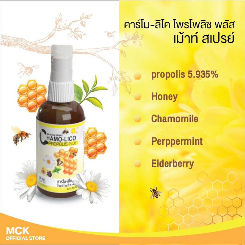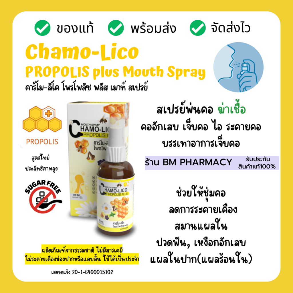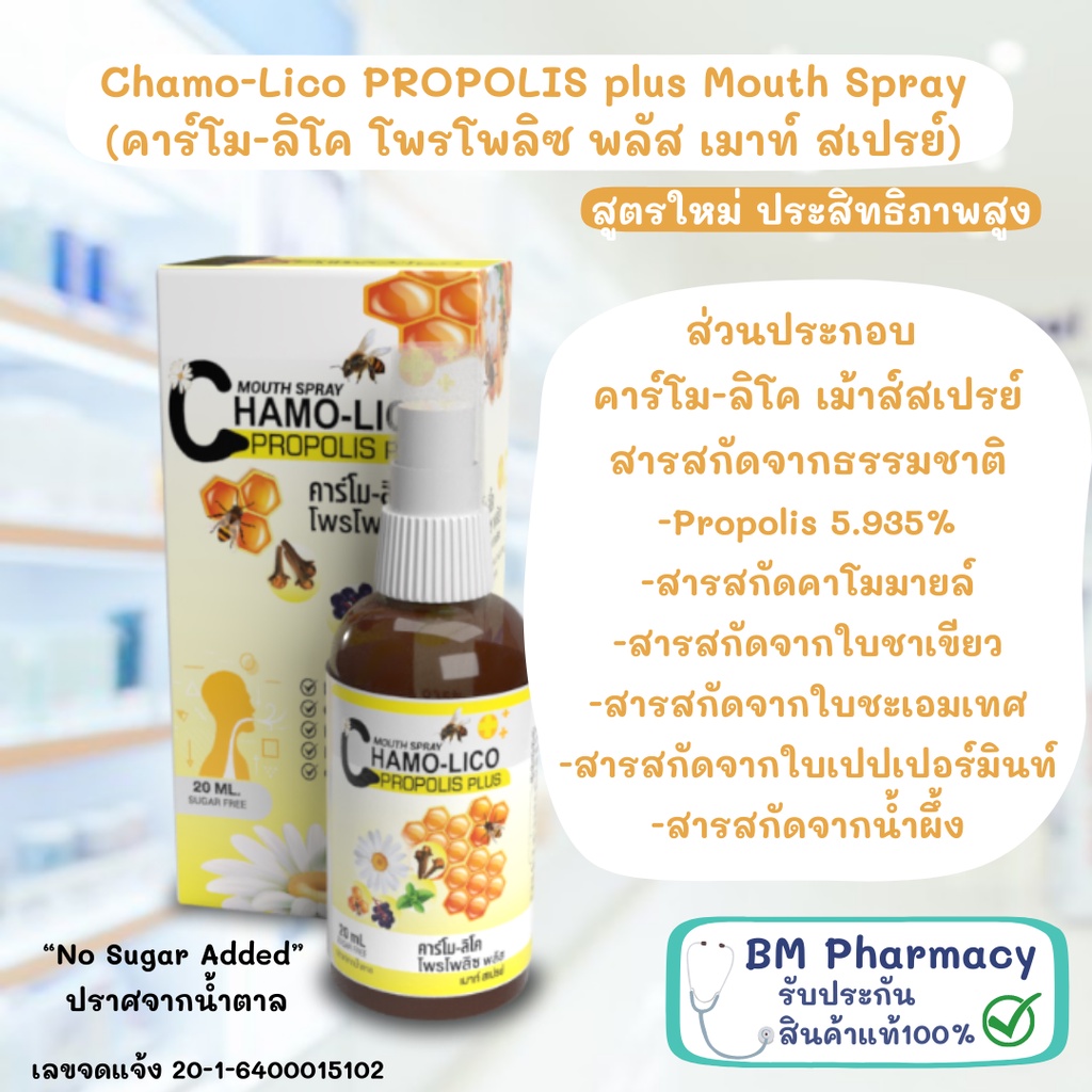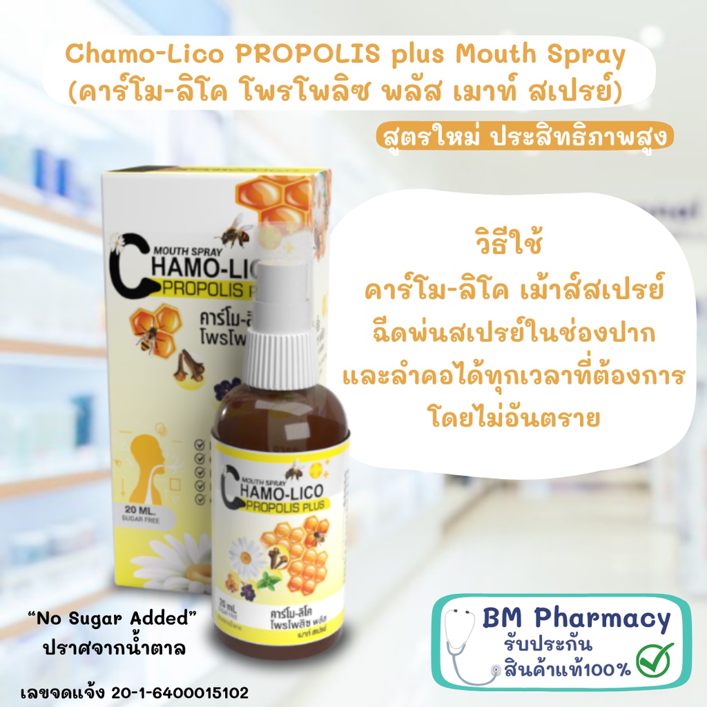 โพรโพลิซ Chamo-lico propolis plus คาร์โม ลิโค โพรโพลิซ พลัส เม้าส์สเปรย์ สเปรย์แก้ไอ เสมหะ เจ็บคอ 20 ml.