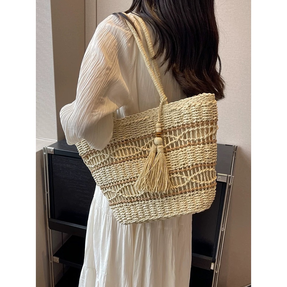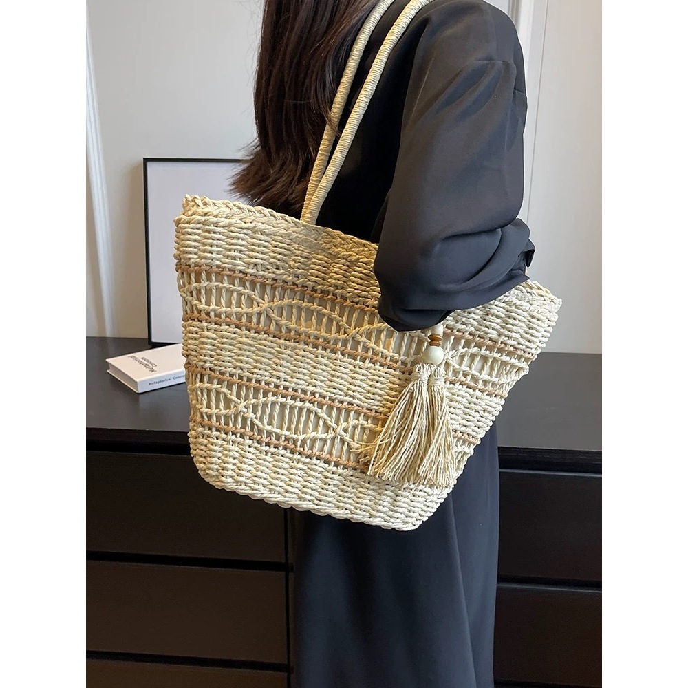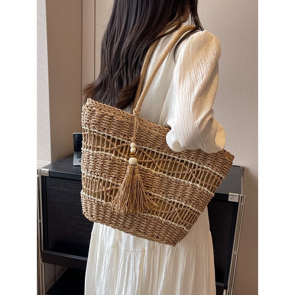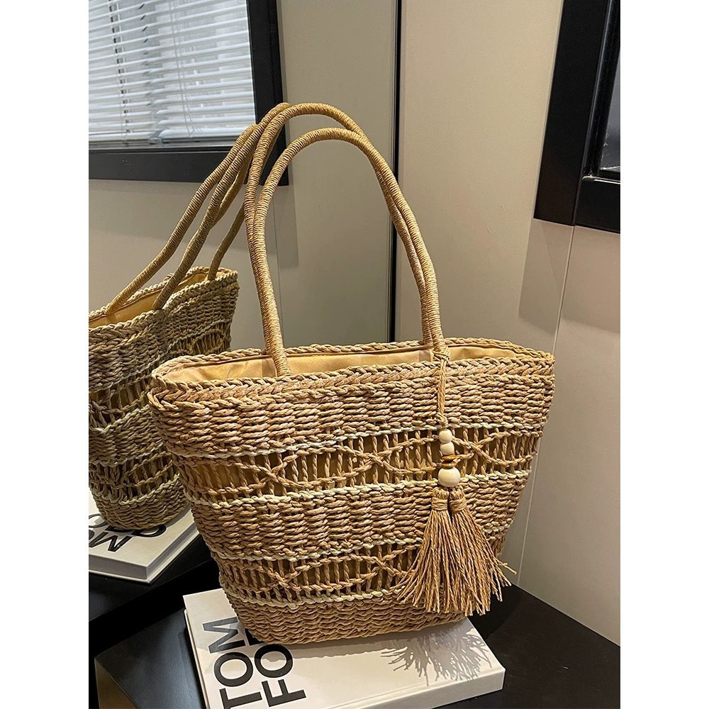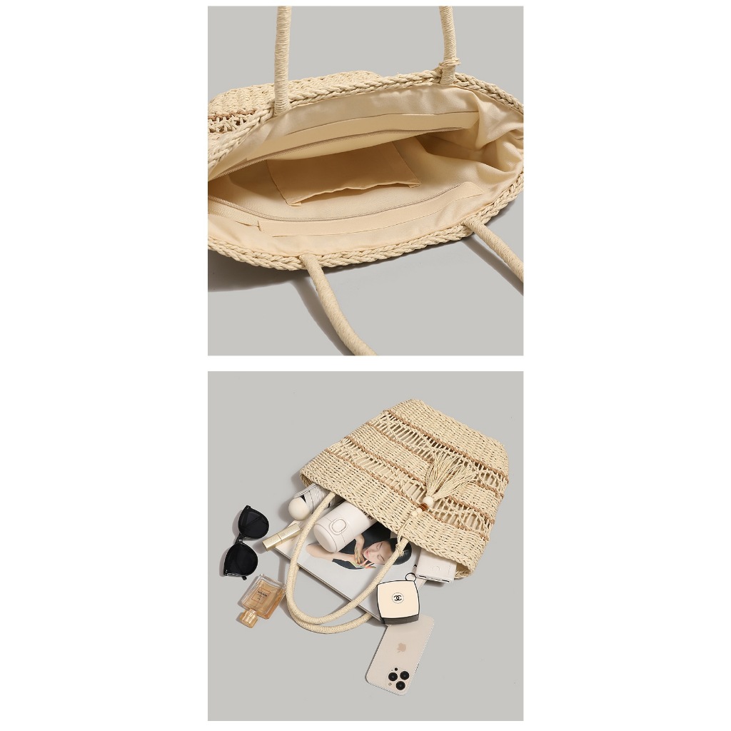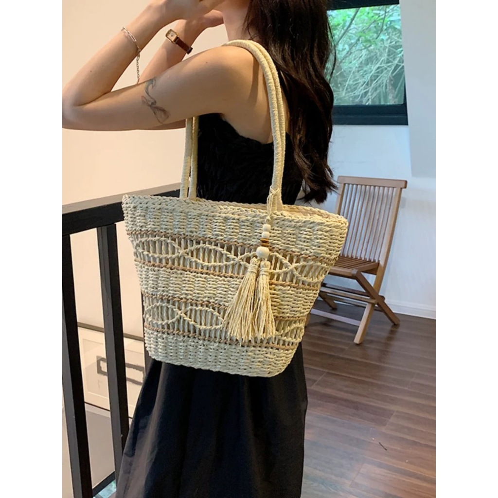 กระเป๋าสาน ห้อยพู่ ทรงshopping bag สานลาย มีซับใน B133 พร้อมส่ง 2 สี(จัดส่งจากกรุงเทพ)