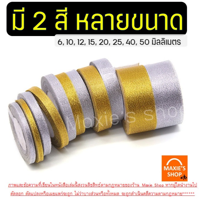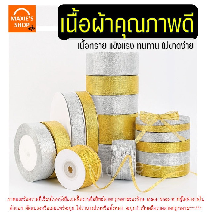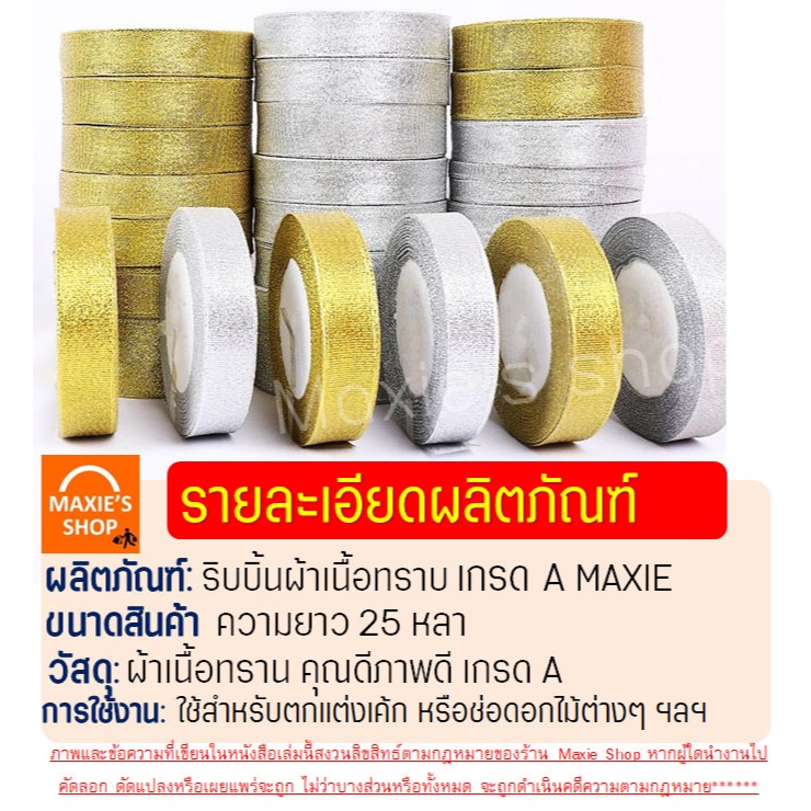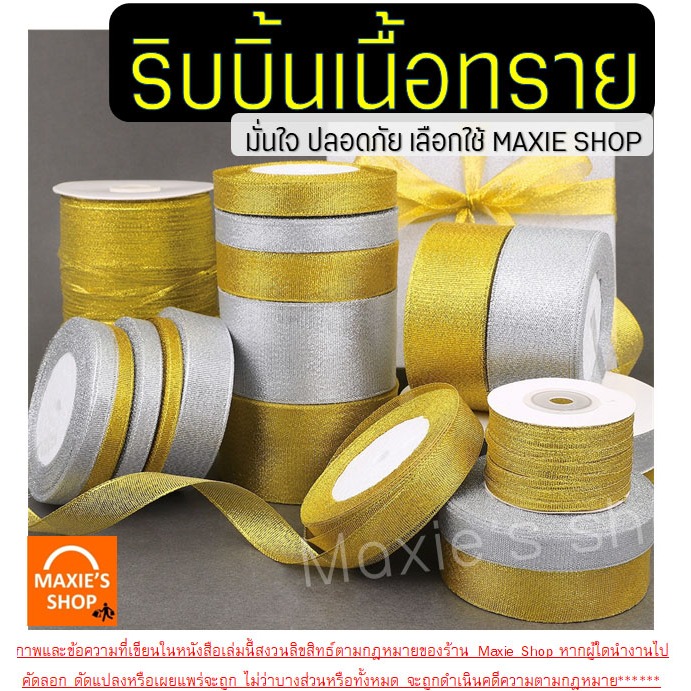 ริบบิ้นเนื้อทราย เกรด A MAXIE มีให้เลือกซื้อ 2 สี (สีเงิน และ สีทอง) และ 9 ขนาด ได้แก่ 0.6, 1, 1.2, 1.5, 2, 2.5, 3, 4 และ 5 เซนติเมตร ตามลำดับ ความยาว 25 หลา