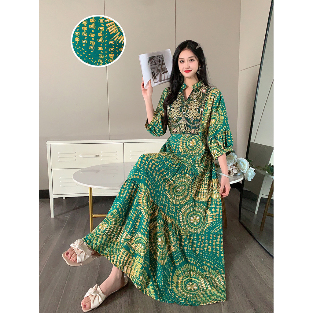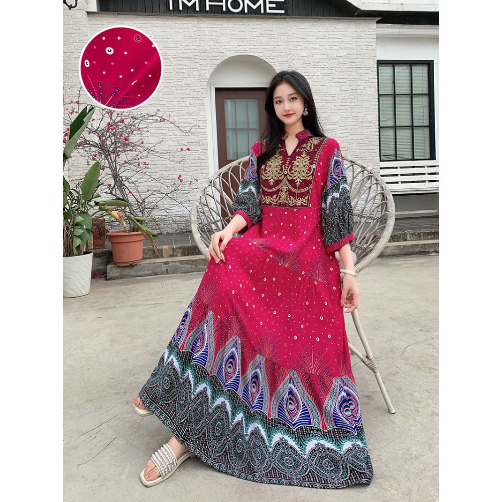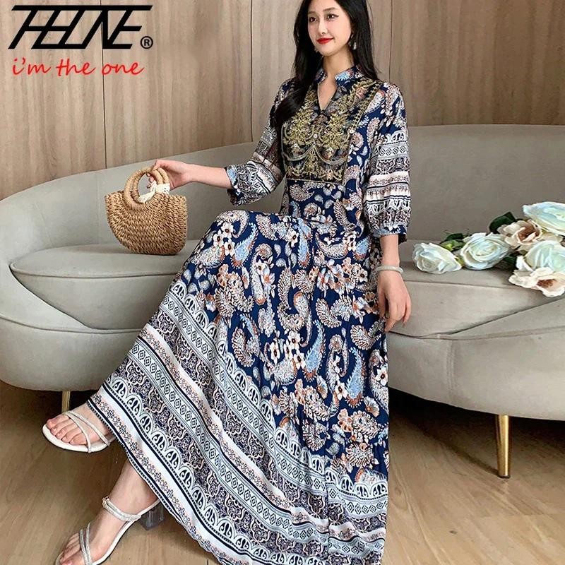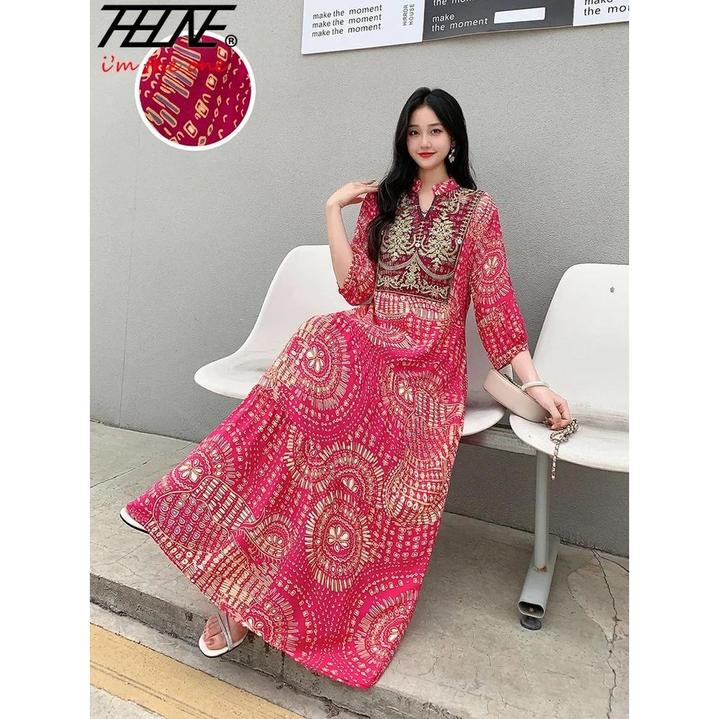 Thhone ฤดูใบไม้ผลิฤดูใบไม้ร่วง Guan Maxi ชุดยาวผู้หญิงเสื้อผ้าอินเดียเย็บปักถักร้อย Boho ผ้าฝ้ายผ้าไหมครึ่งแขนพิมพ์ดอกไม้สไตล์เกาหลีแฟชั่นสบายๆ Vestido Largos