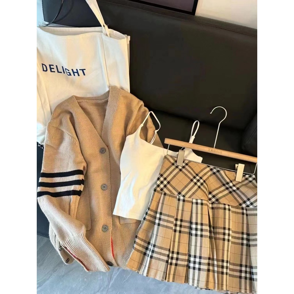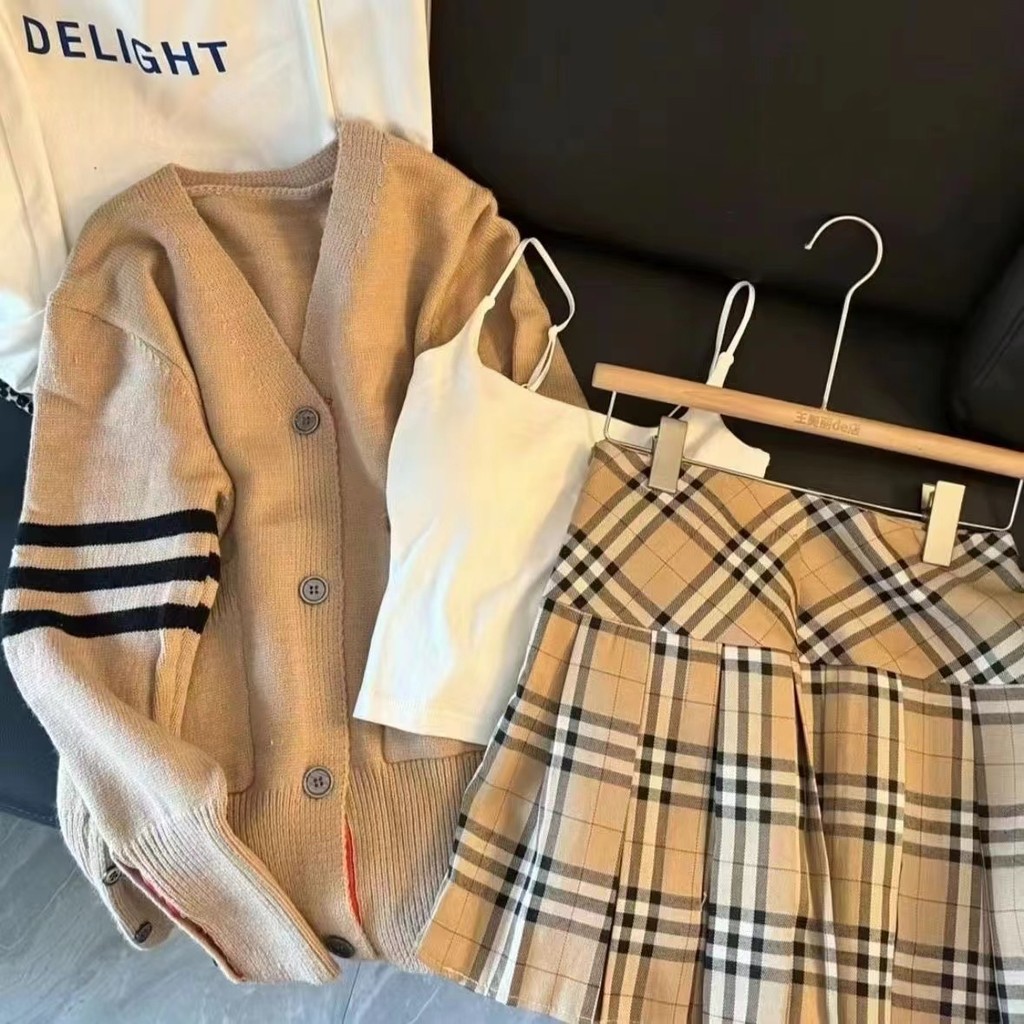 สินค้าใหม่มีสต็อกใหม่ช่วงต้นฤดูใบไม้ร่วงเกาหลีลดอายุแขนยาวถักเสื้อสเวตเตอร์ถักเสื้อสเวตเตอร์ถักกระโปรงลายสก๊อตชุดสามชิ้นสำหรับผู้หญิง ouwe