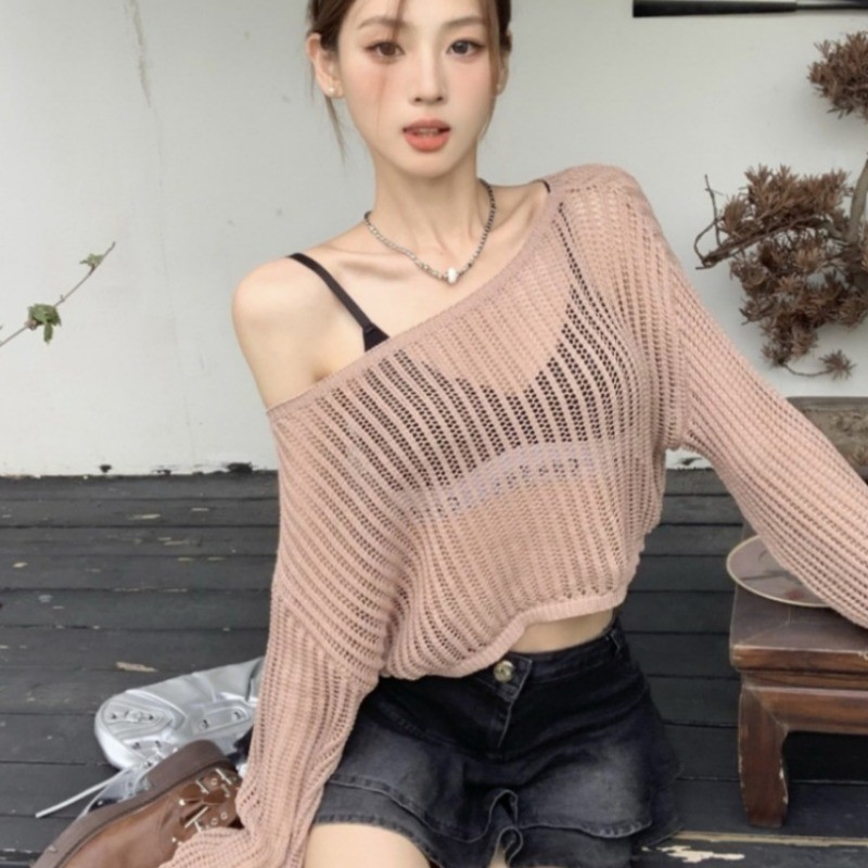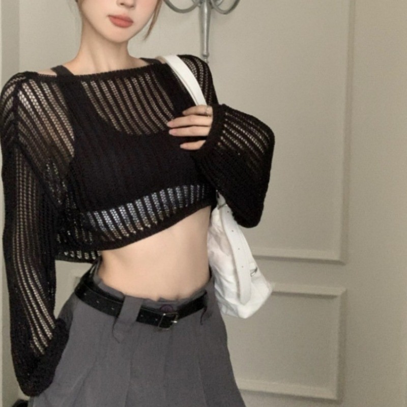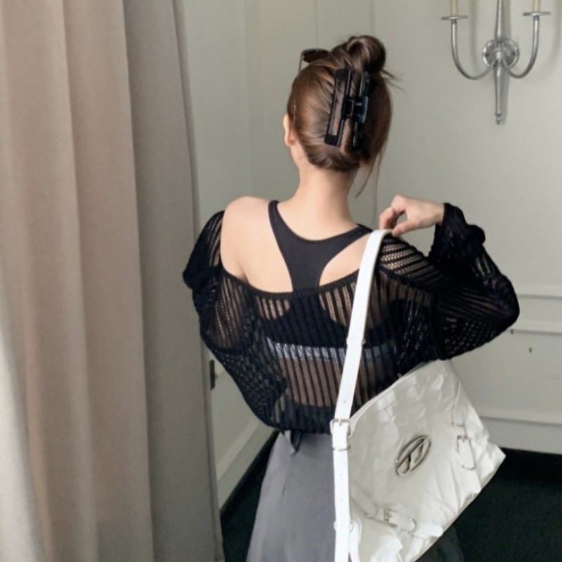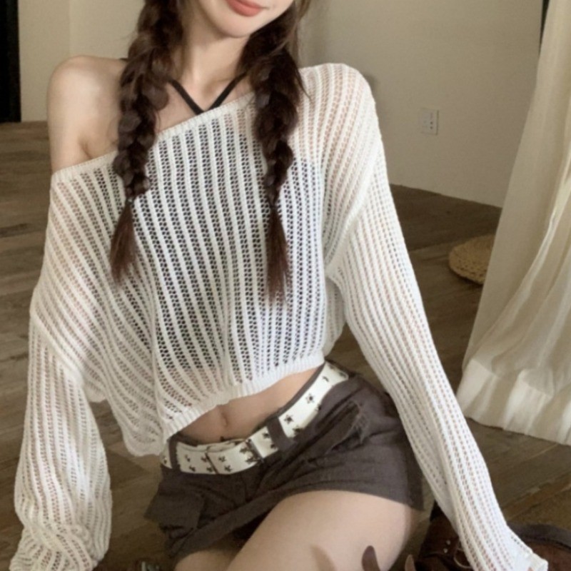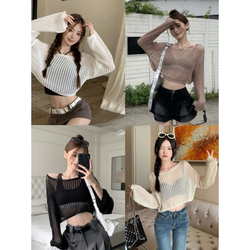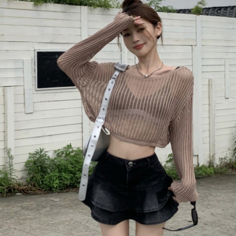 บางหลวมกลวงถักเสื้อครีมกันแดดสําหรับฤดูใบไม้ผลิฤดูร้อนผู้หญิงสั้นแขนยาวสีทึบคาร์ดิแกนเกาหลี