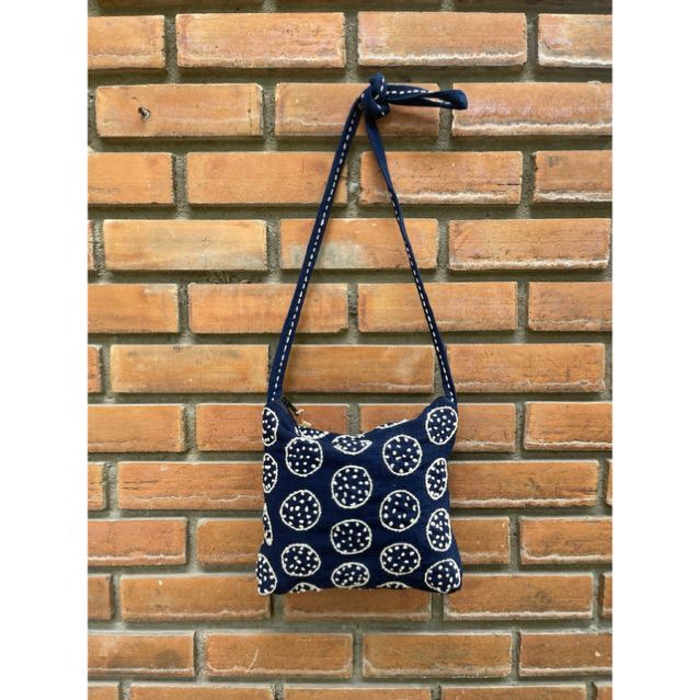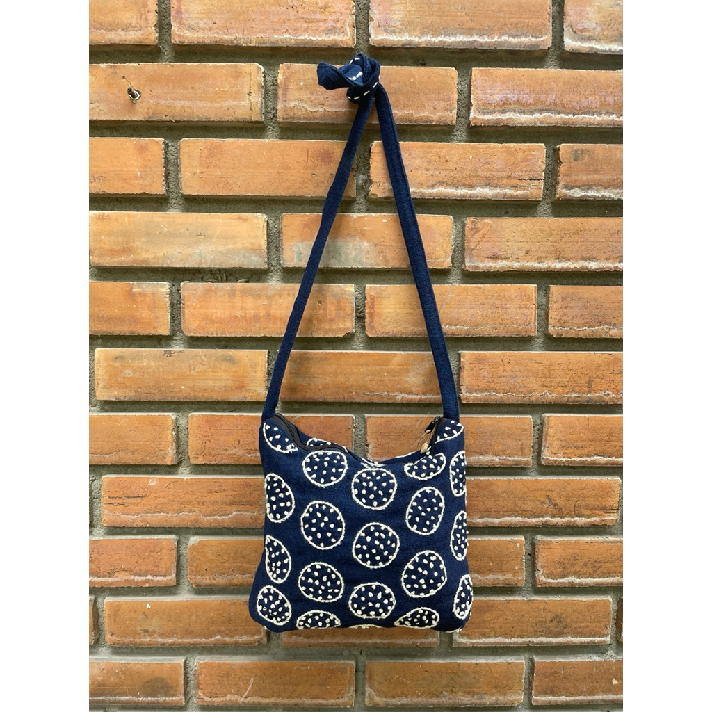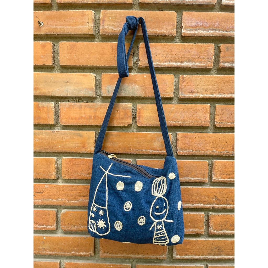 กระเป๋าผ้าปักมือ สะพายขึ้นไหล่ได้ ปักลายทั้ง 2 ด้าน สายสะพายปรับความยาวได้ด้วยการมัดปม