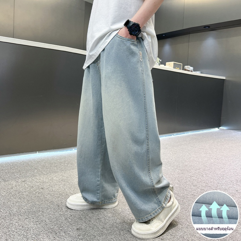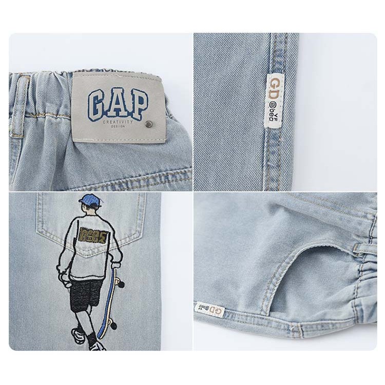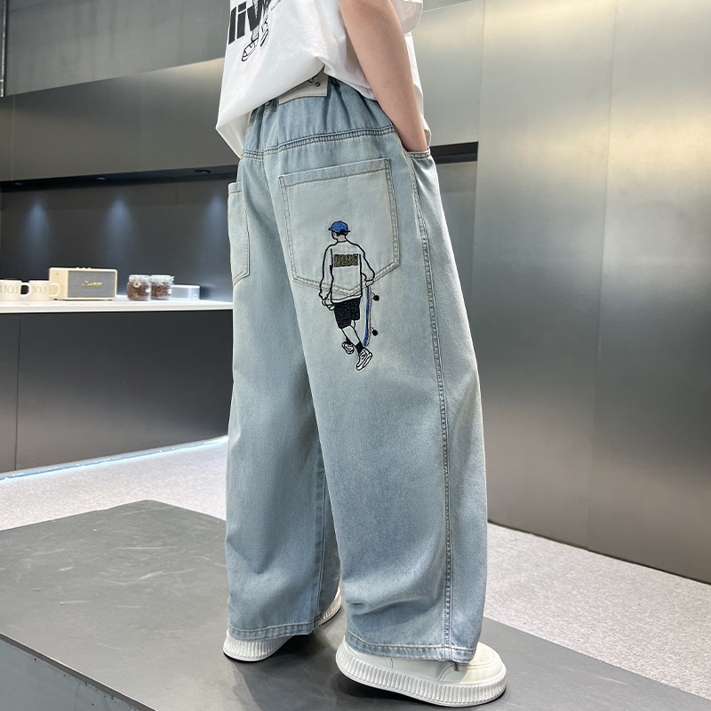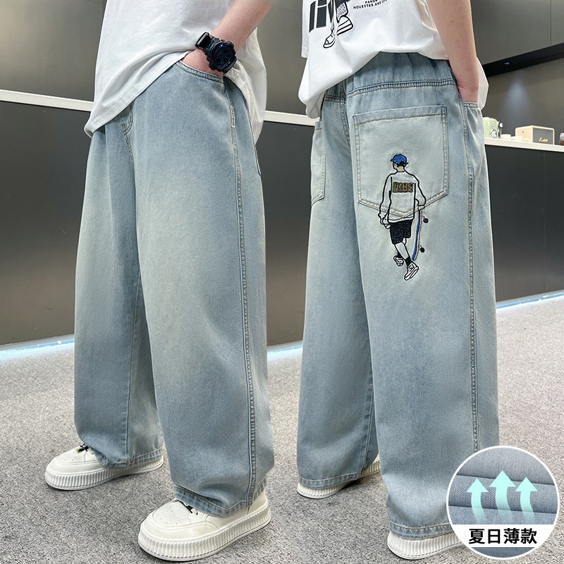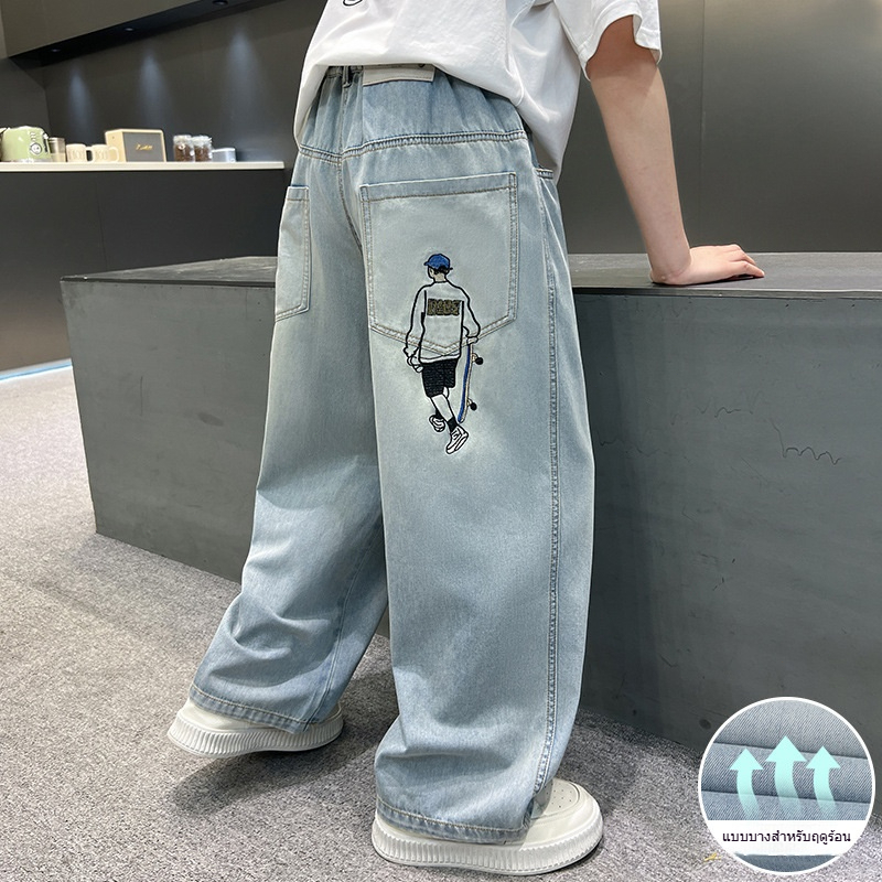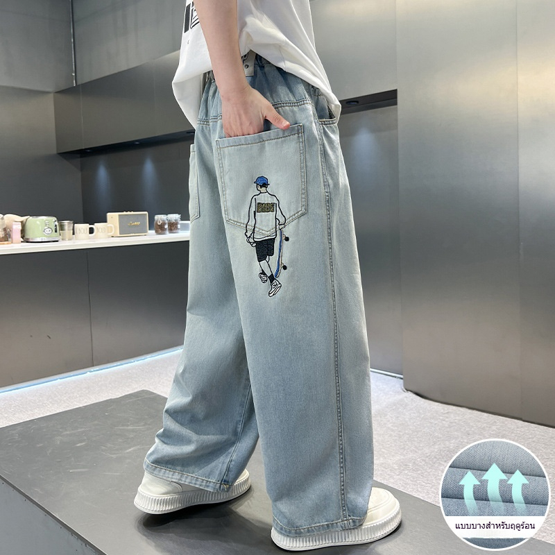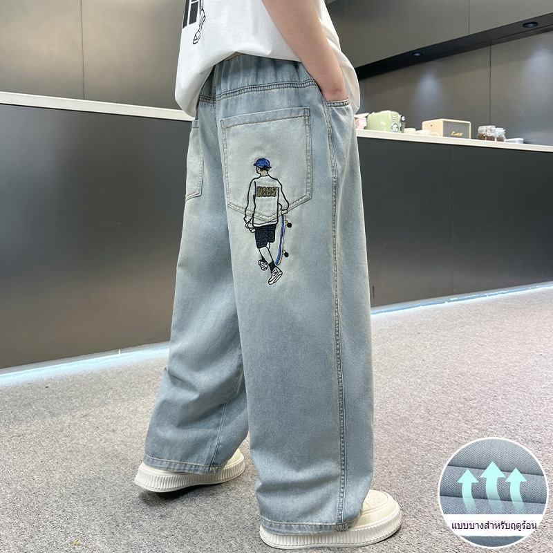 กางเกงยีนส์เด็ก กางเกงขายาว เอวยางยืด เย็บปักถักร้อยเด็กชายสเก็ตบอร์ด ฤดูร้อน พักผ่อน แฟชั่น เทรนด์ 6-12 ปี