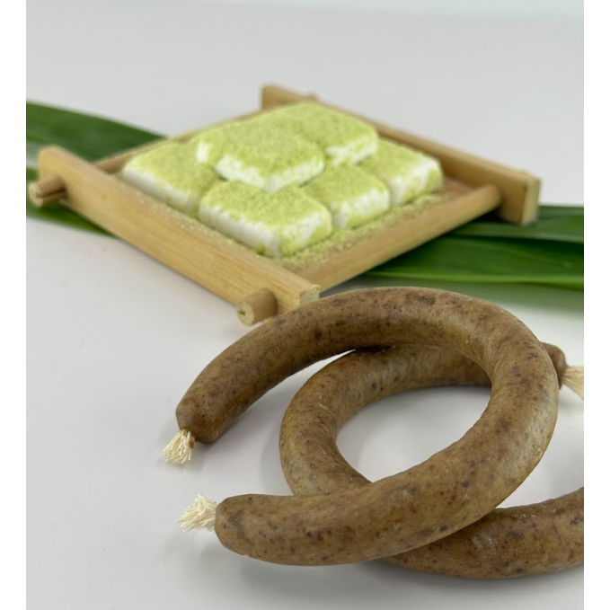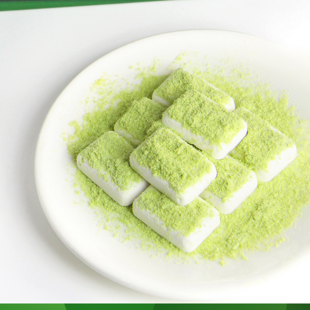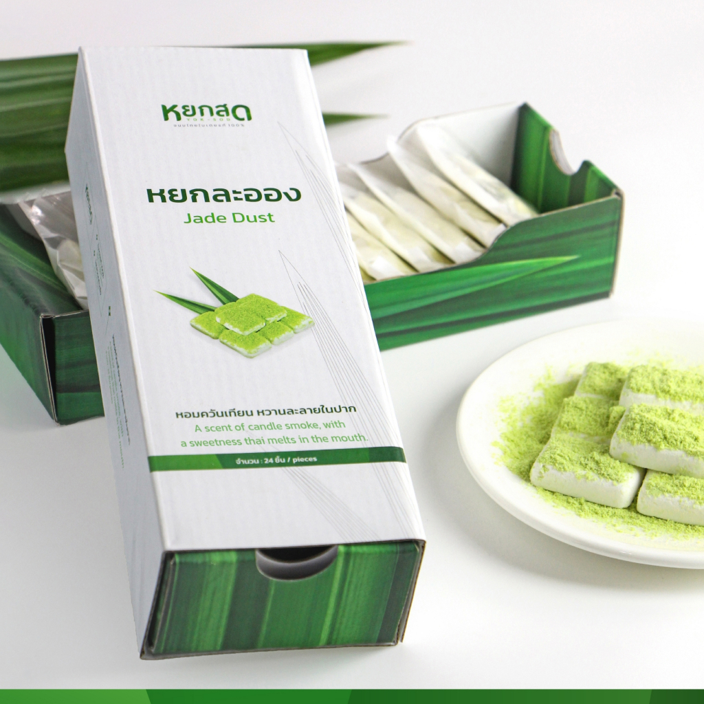 “หยกละออง” ทางหยกสดได้รับแรงบรรดาลใจจากขนมไทยโบราณอย่างขนมสัมปันนี โดยได้พัฒนาสูตรขนมและกระบวนการผลิตที่ปราณีต โดยนำแป้งมันส