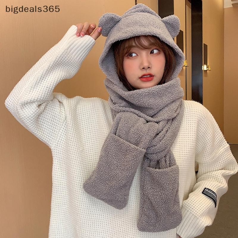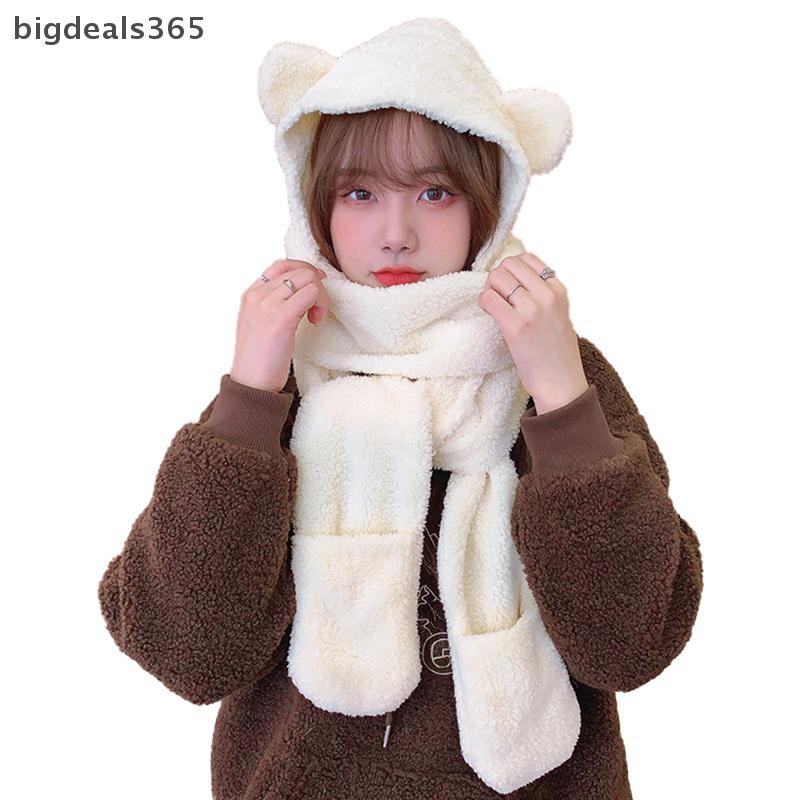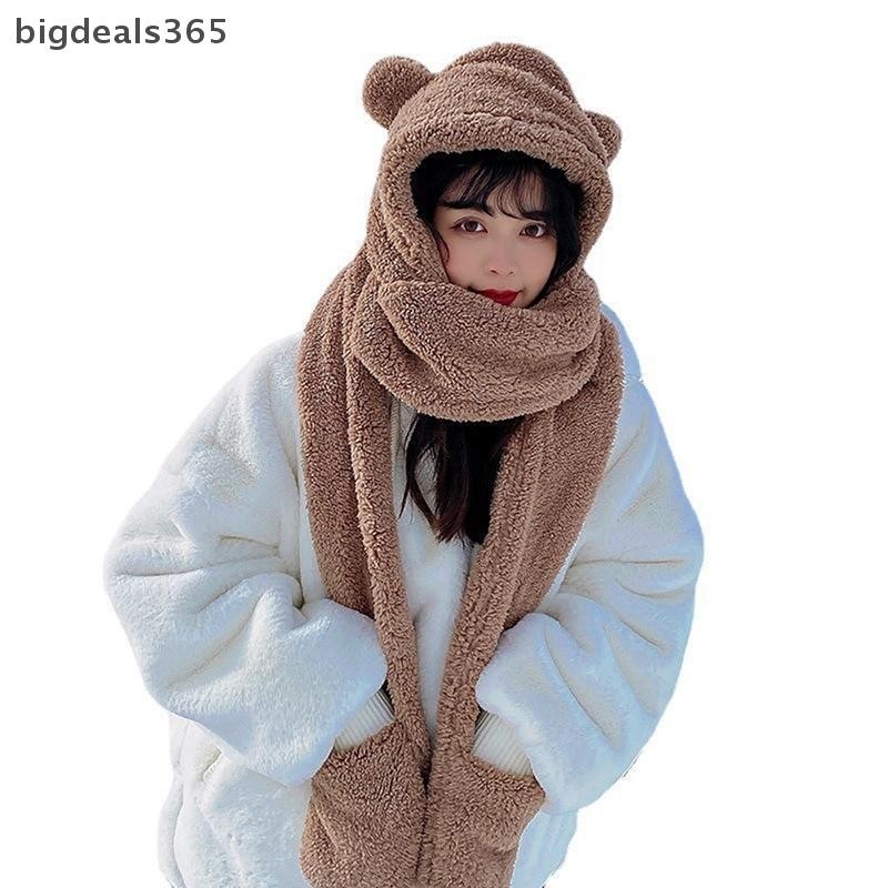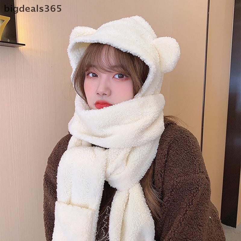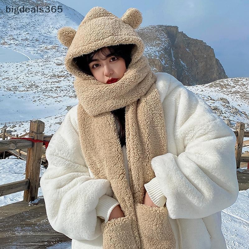 [bigdeals365] 1ชิ้นหูหมีน่ารักหมวกผ้าพันคอถุงมือ3-in-1ฤดูหนาวที่อบอุ่นhedgingหมวกผู้หญิงwindproofตุ๊กตาหมวกผ้าพันคอหุ้นใหม่