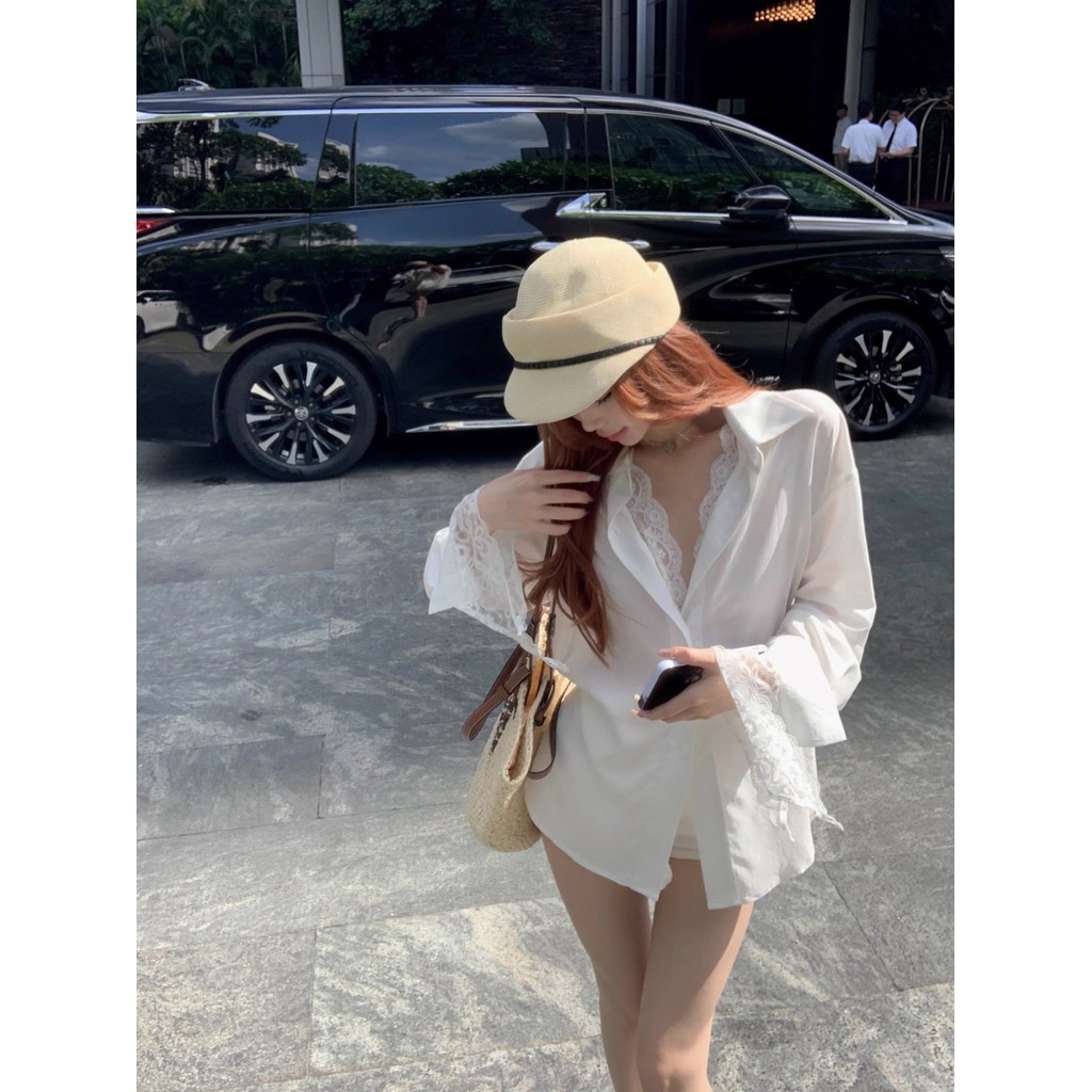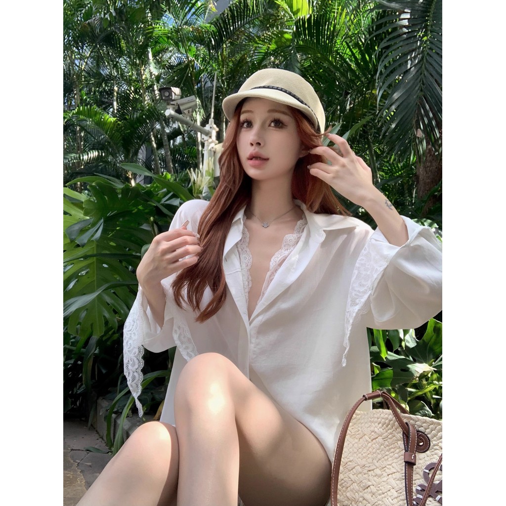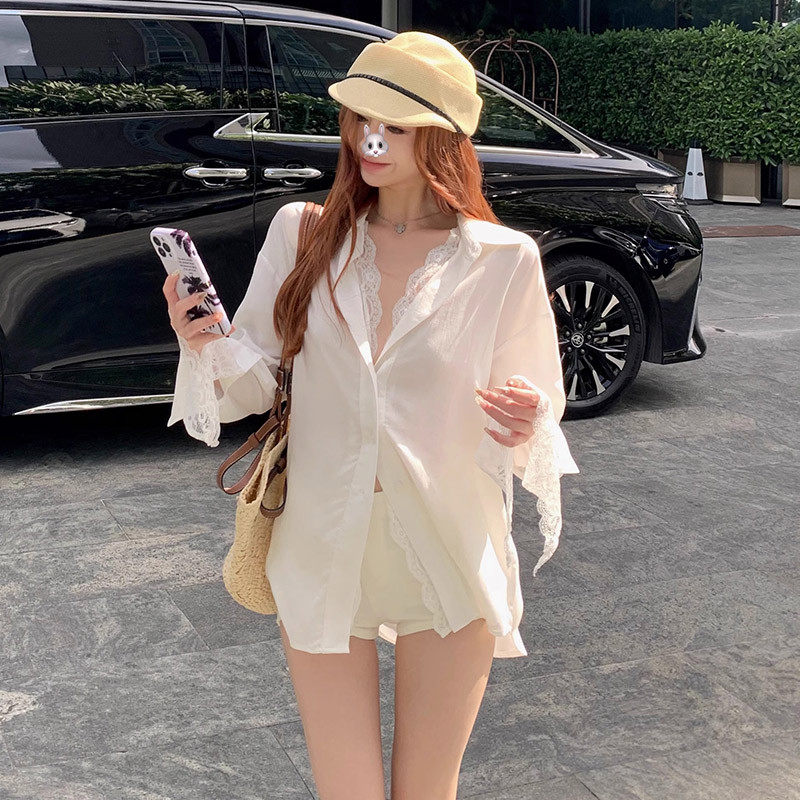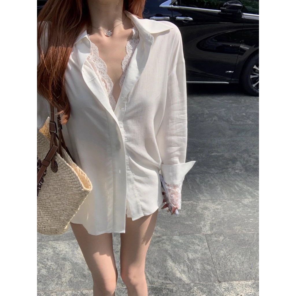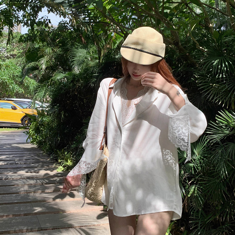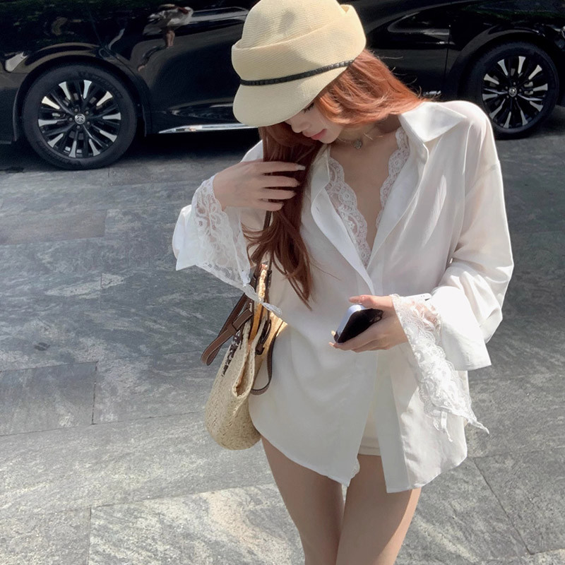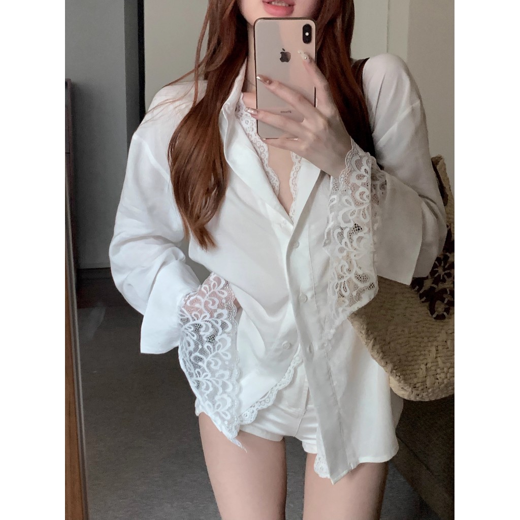 แขนยาวหลวมเหมาะสมเสื้อสตรีฤดูใบไม้ร่วงเสื้อลูกไม้กลางความยาวท็อปส์ 241022