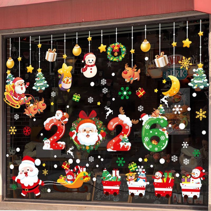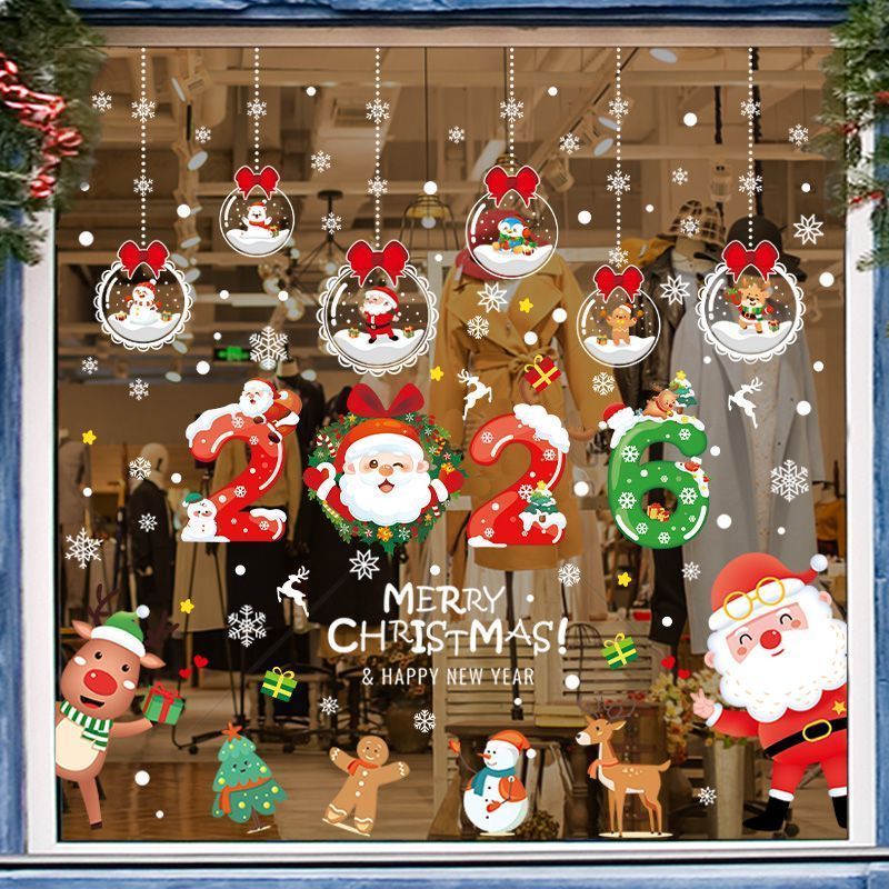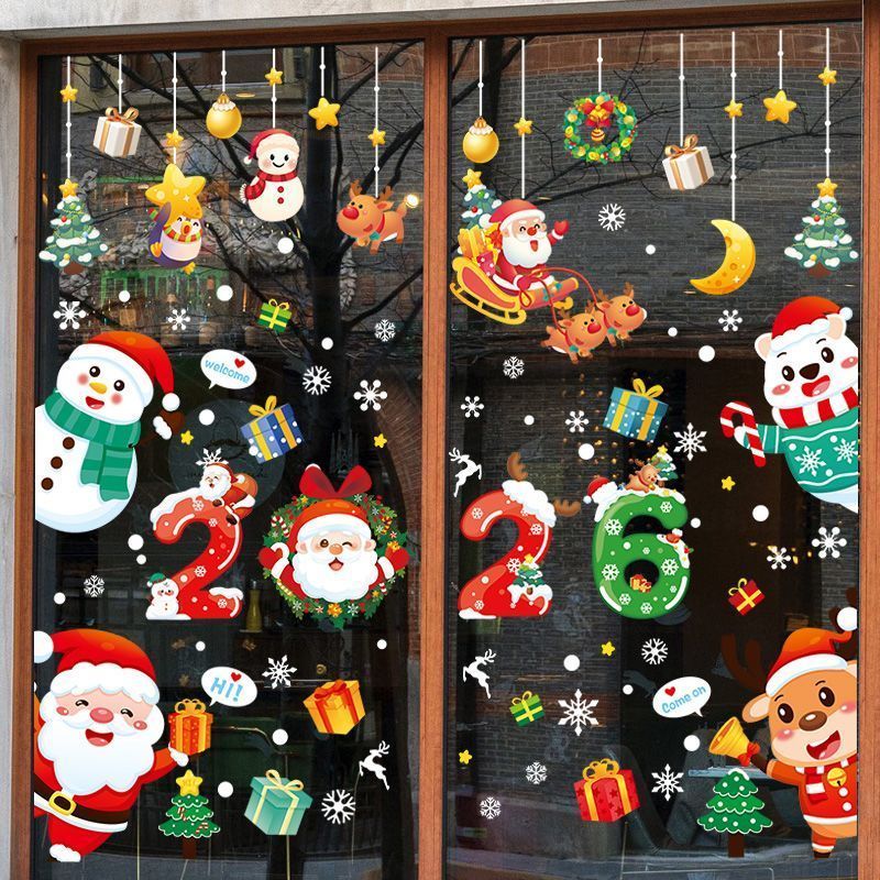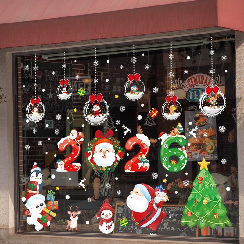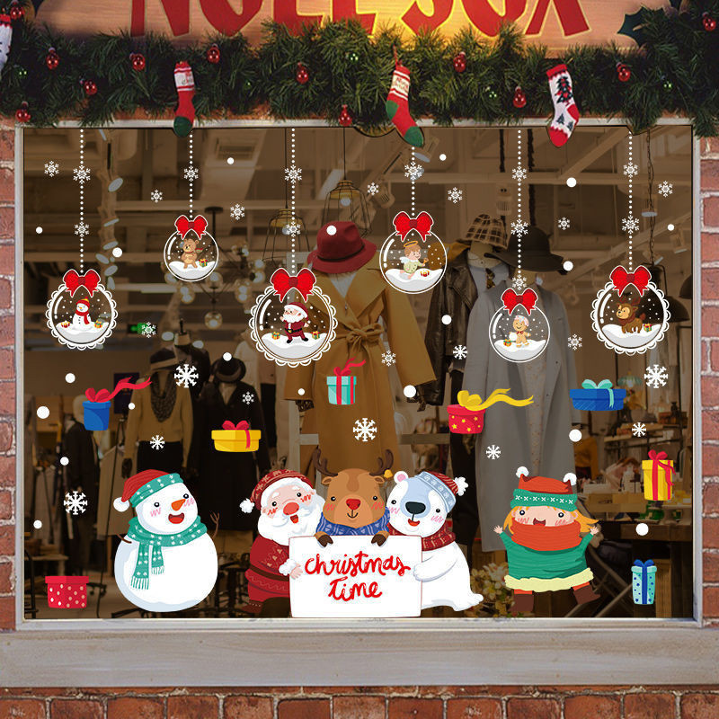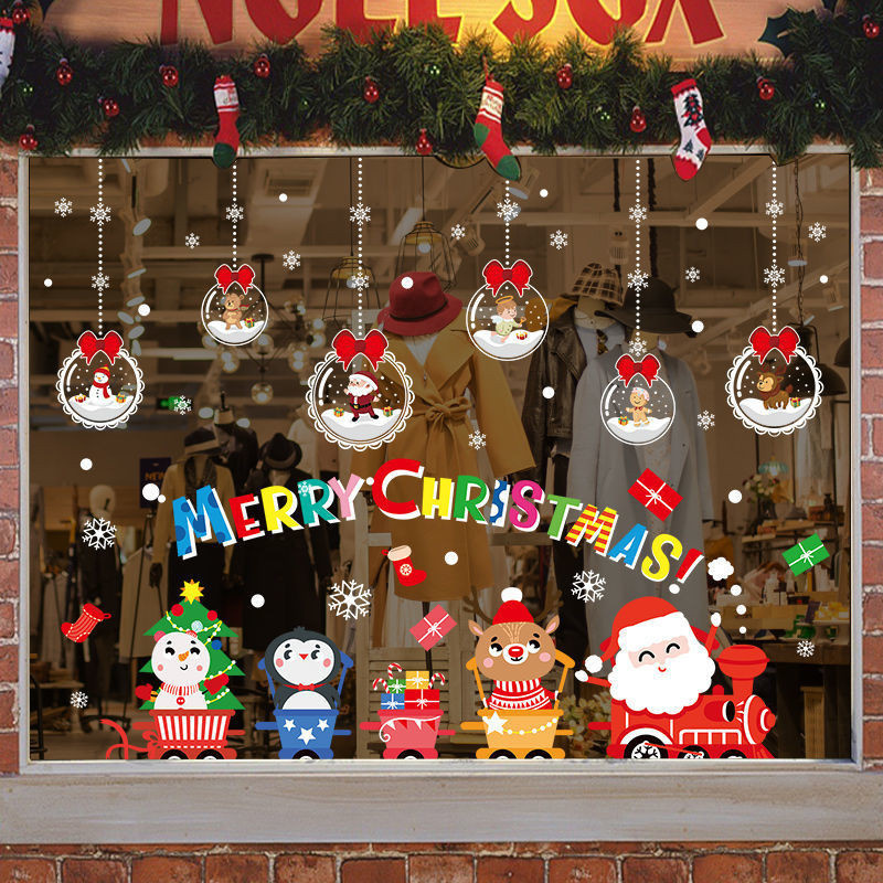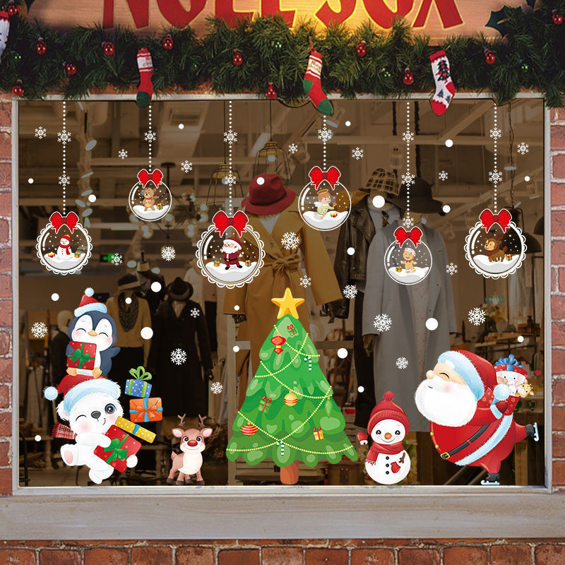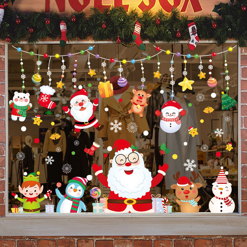 คริสต์มาสสติกเกอร์ไฟฟ้าสถิตประตูกระจกร้านตกแต่งโชว์ผลงานสติกเกอร์หน้าต่างห้างสรรพสินค้าเค้าโครงฉาก