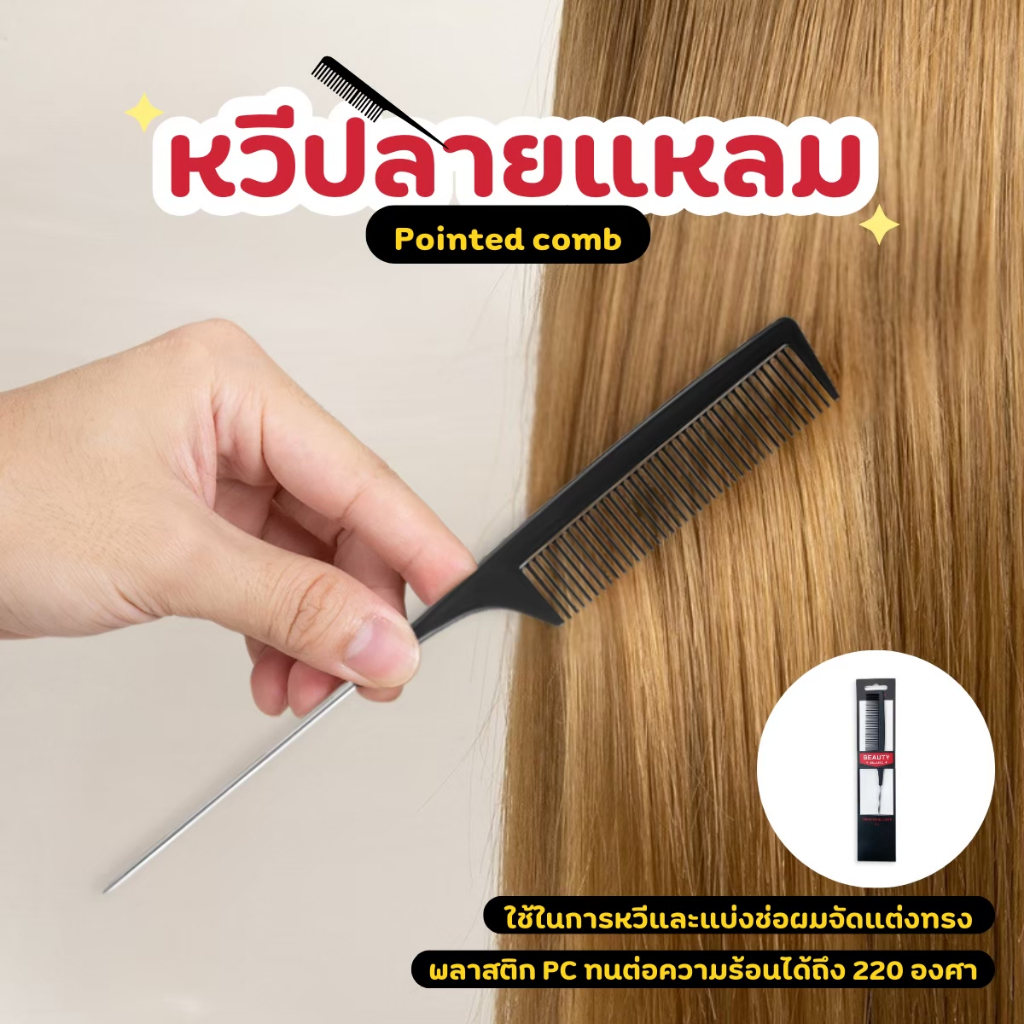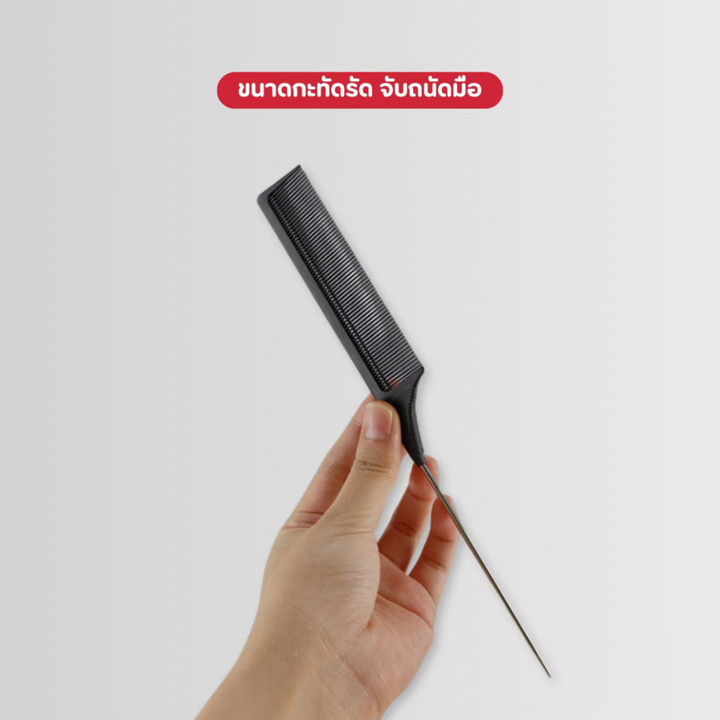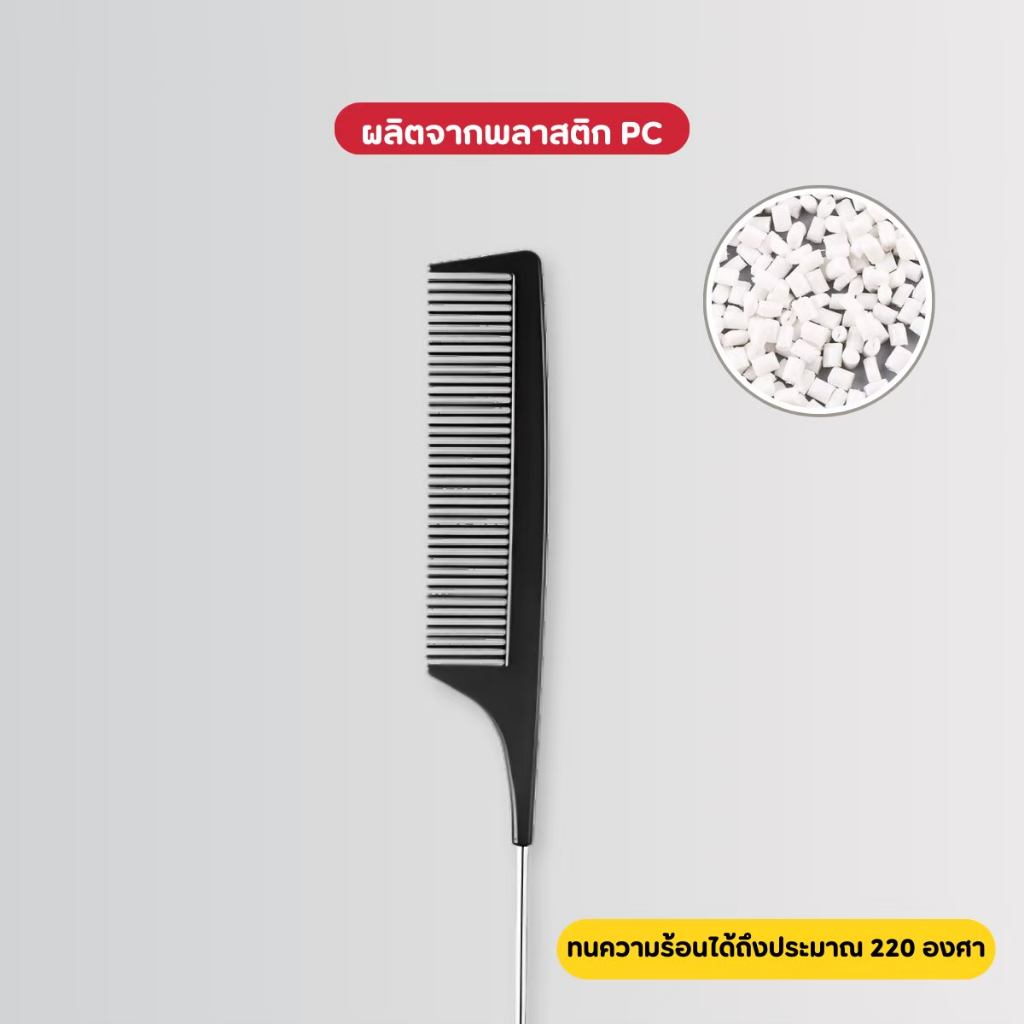 จุดเด่น : ผลิตจากพลาสติก PC แข็งแรง ทนต่อการใช้งาน ทนความร้อนได้ถึงประมาณ 220องศา การออกแบบให้ใช้งานได้อย่างสะดวก ซี่หวีมีความถี่ ตัวด้ามผลิตจากสแตนเลสรูปทรงกลมยาวปลายแหลม ทำให้การจัดแต่งทรงทรงได้ง่ายยิ่งขึ
