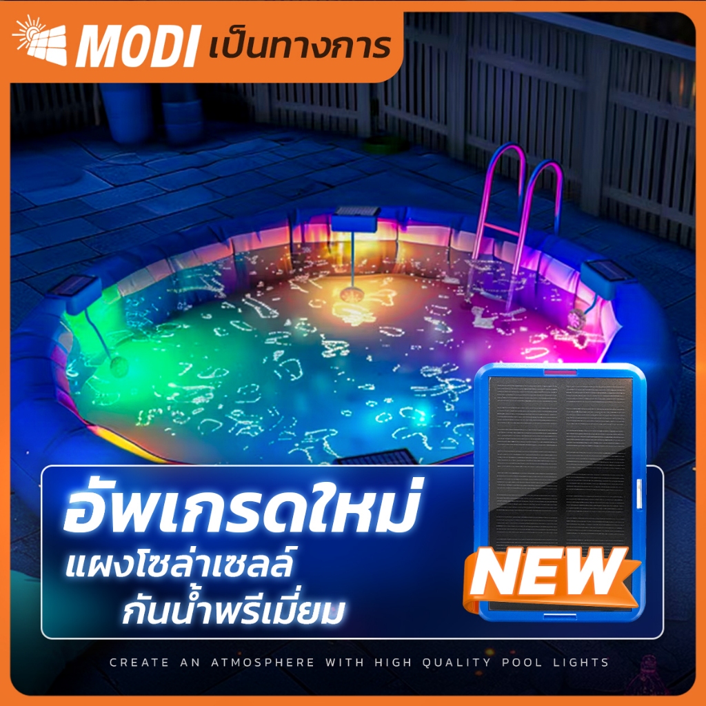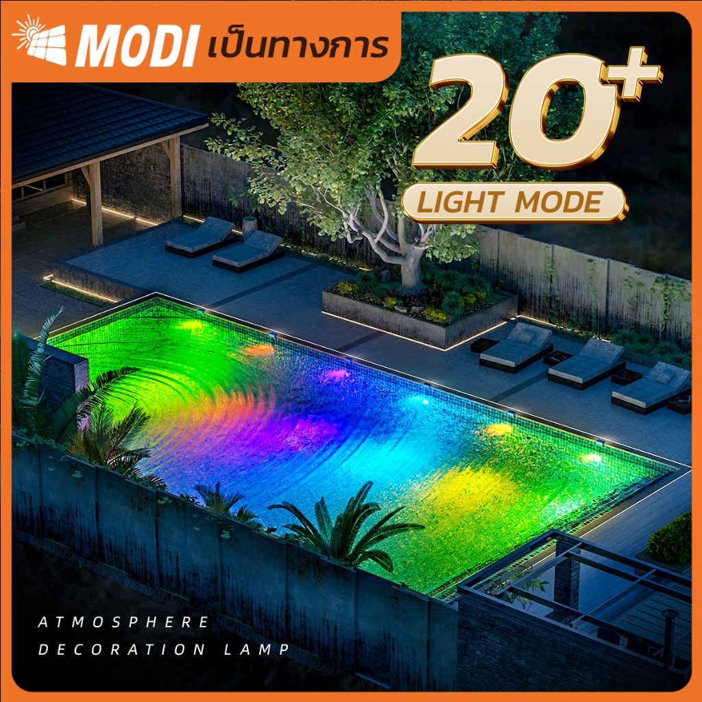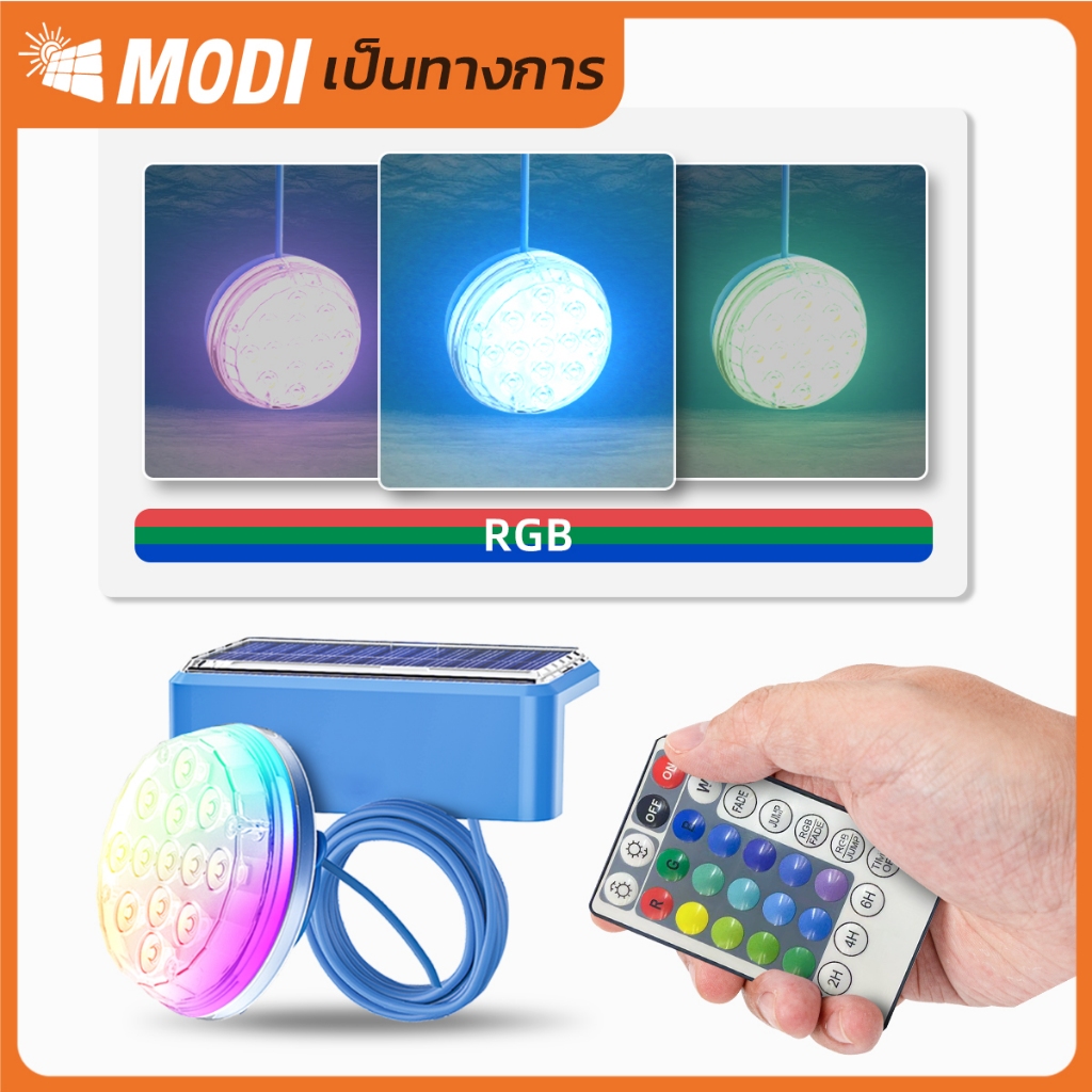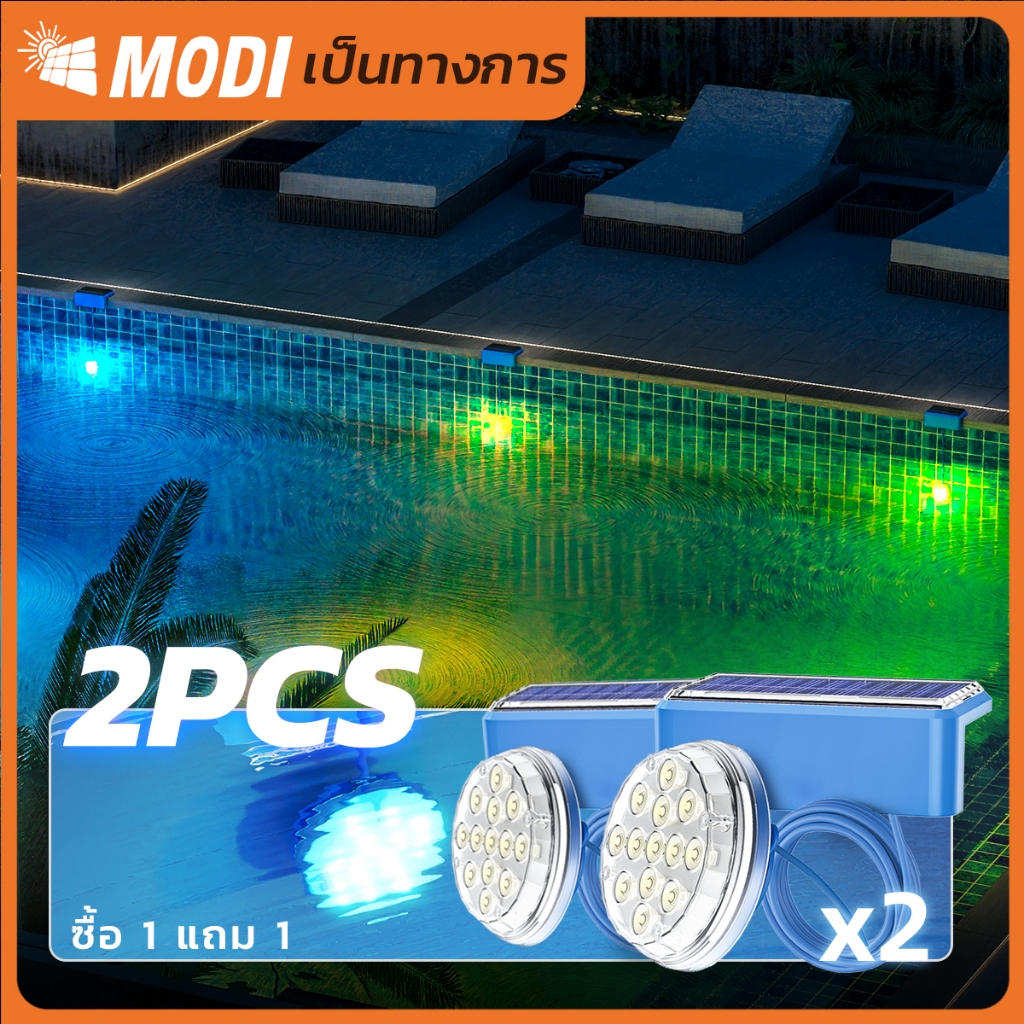 MODI โคมไฟสระว่ายน้ำโซล่าเซลล์ แพ็คคู่ สีRGB โคมไฟใต้น้ำ ระดับกันน้ำIP67 สายไฟยาว1เมตร หลากสี