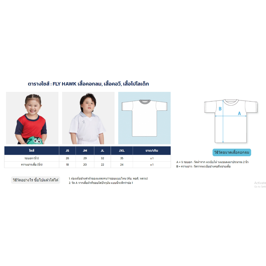FLY HAWK SPORT "THE BEST OF SPORT" เสื้อเด็ก ดีไซน์คอเก๋ๆ ทำให้เสื้อเด็กน่ารักทันสมัย ไม่น่าเบื่อ > สวมใส่สบาย > ระบายอากาศได้ดี > แห้งไว * สีมีทั้งหมด 8 สี * แดง, ชมพู, ฟ้า, น้ำเงิน, เขียว, เหลือง, ม่วง และส้ม * ตารางขนาดรอบอก-ความยาว * (หน่วยเป็น : นิ