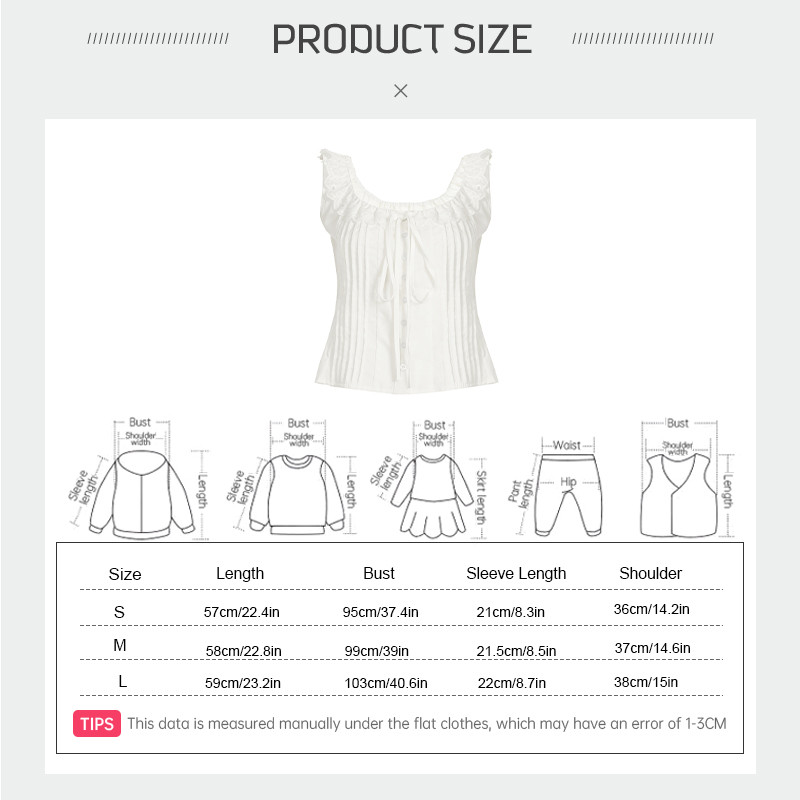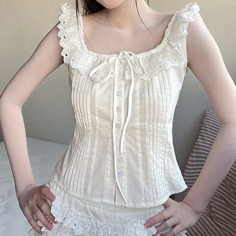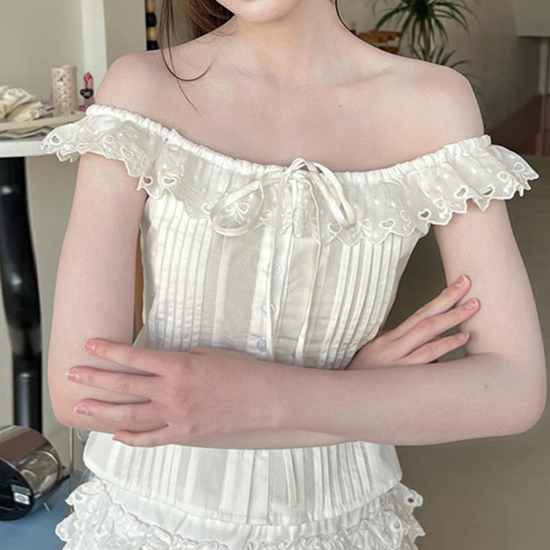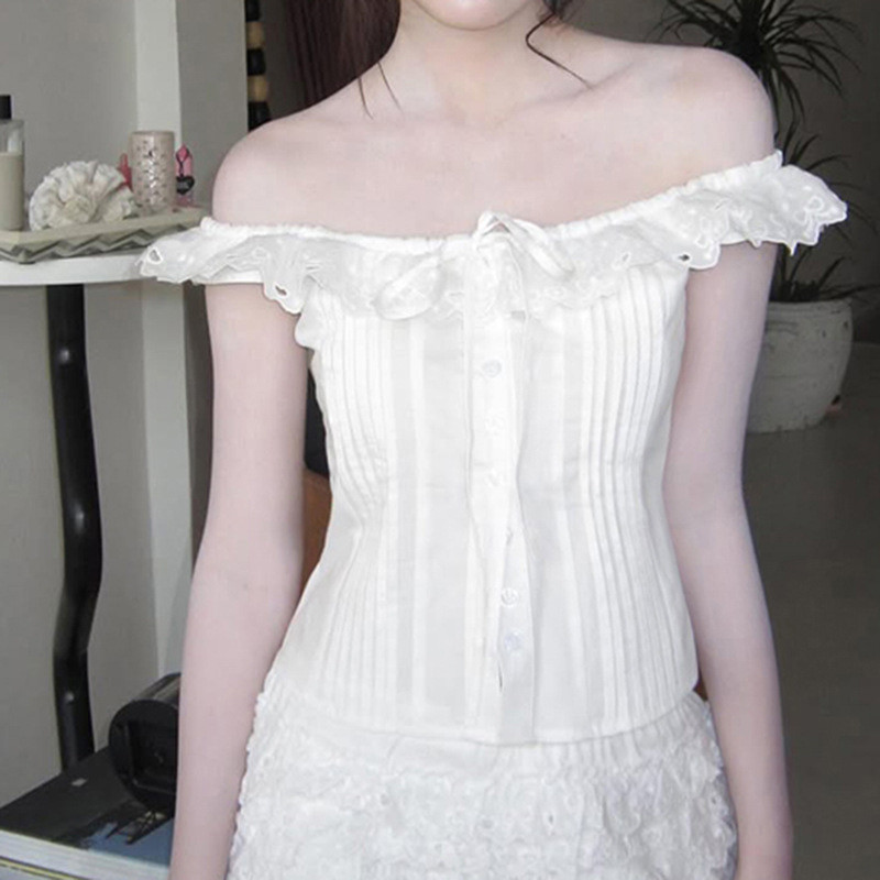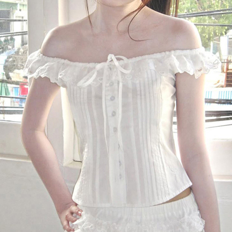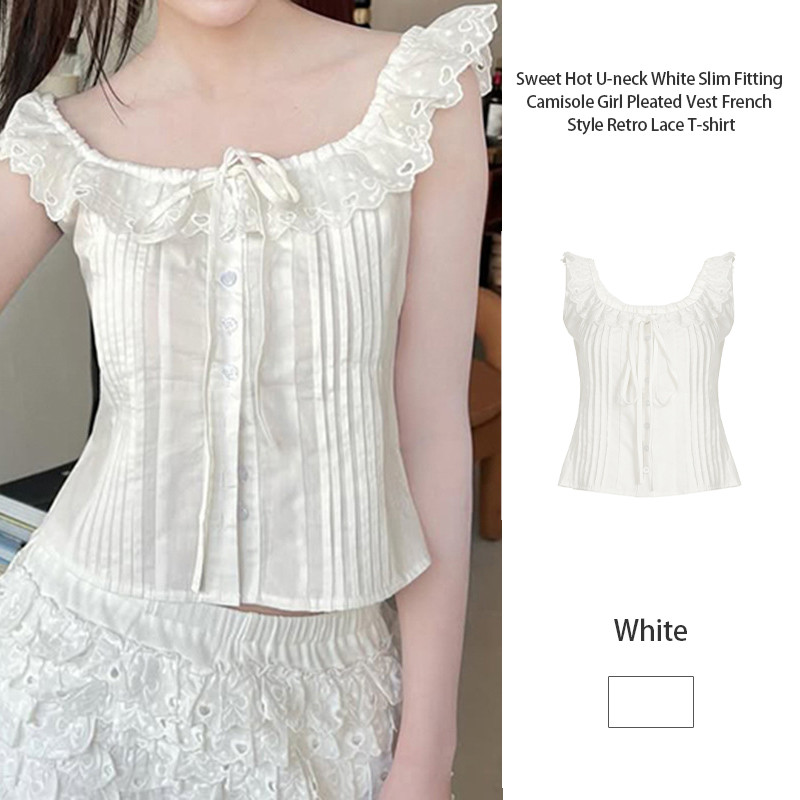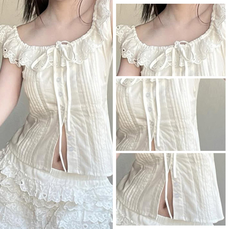 เสื้อยืดคอกลมสีขาวทรงเข้ารูปน่ารักสไตล์ฝรั่งเศสพร้อมจีบและเสื้อยืดลูกไม้สไตล์ย้อนยุค-MTY
