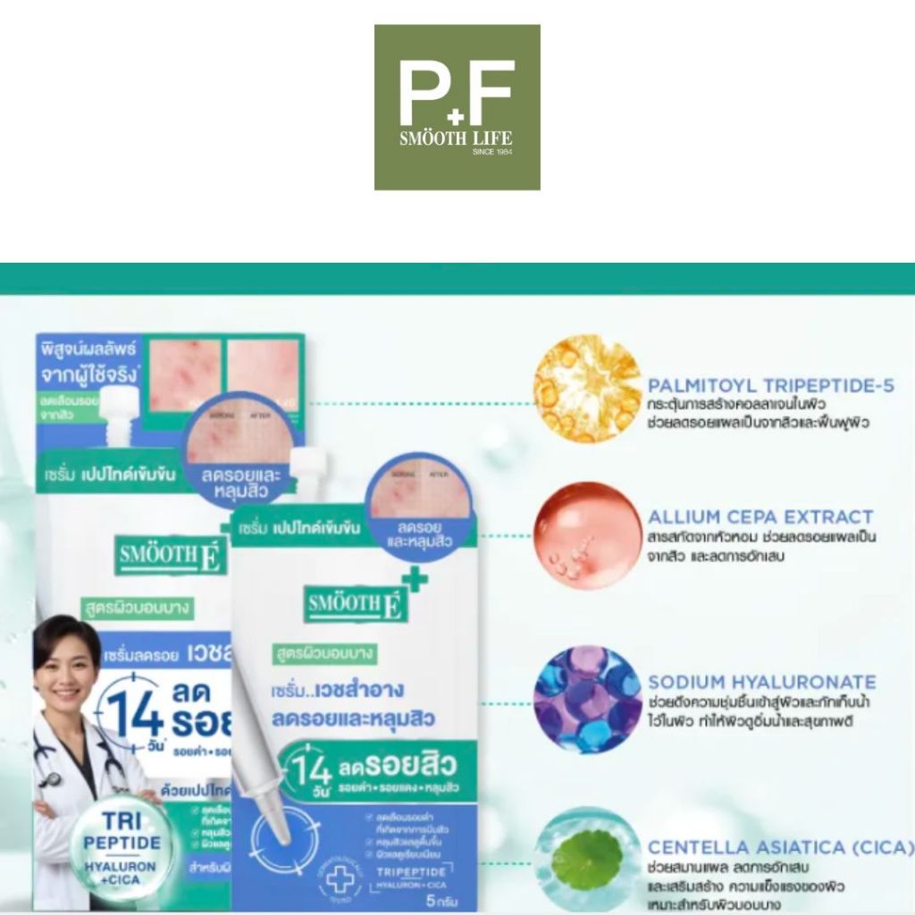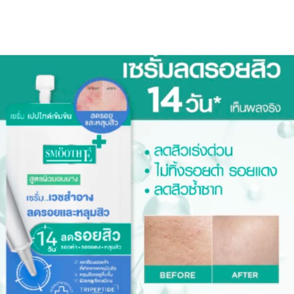 Smooth E ACNE SCAR SACHET 5 G. สมูทอี สการ์ แบบซอง 5 กรัม คุณสมบัติ เซรั่มลดรอยแผลเป็น ประกอบไปด้วย สารสกัดบริสุทธิ์จากธรรมชาติและเทคโนโลยีเปปไทด์ ซึ่งมีคุณสมบัติพิเศษช่วยลดรอยแผลเป็นในลักษณะต่าง ๆ สามารถใช้ได้ทั้งแผลเป็นที่เกิดจากสิว จุดด่างดำที่เกิดจาก