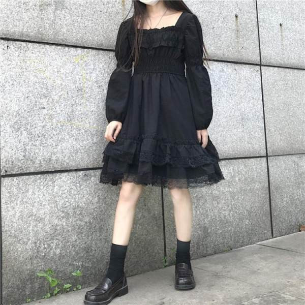 ชุดเดรสลูกไม้สีดำกระโปรงสั้นคอเหลี่ยมแขนยาวแบบใหม่สำหรับฤดูใบไม้ร่วงและฤดูหนาวของผู้หญิง