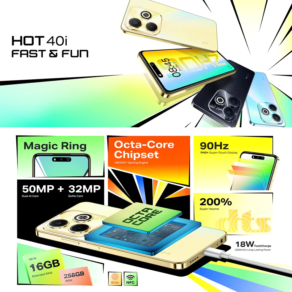 [NEW] Infinix hot 40i โทรศัพท์มือถือรุ่นดั้งเดิม สมาร์ทโฟน 8GB+256GB 90hz หน้าจอเจาะรู แบตเตอรี่ 5000 mAh COD