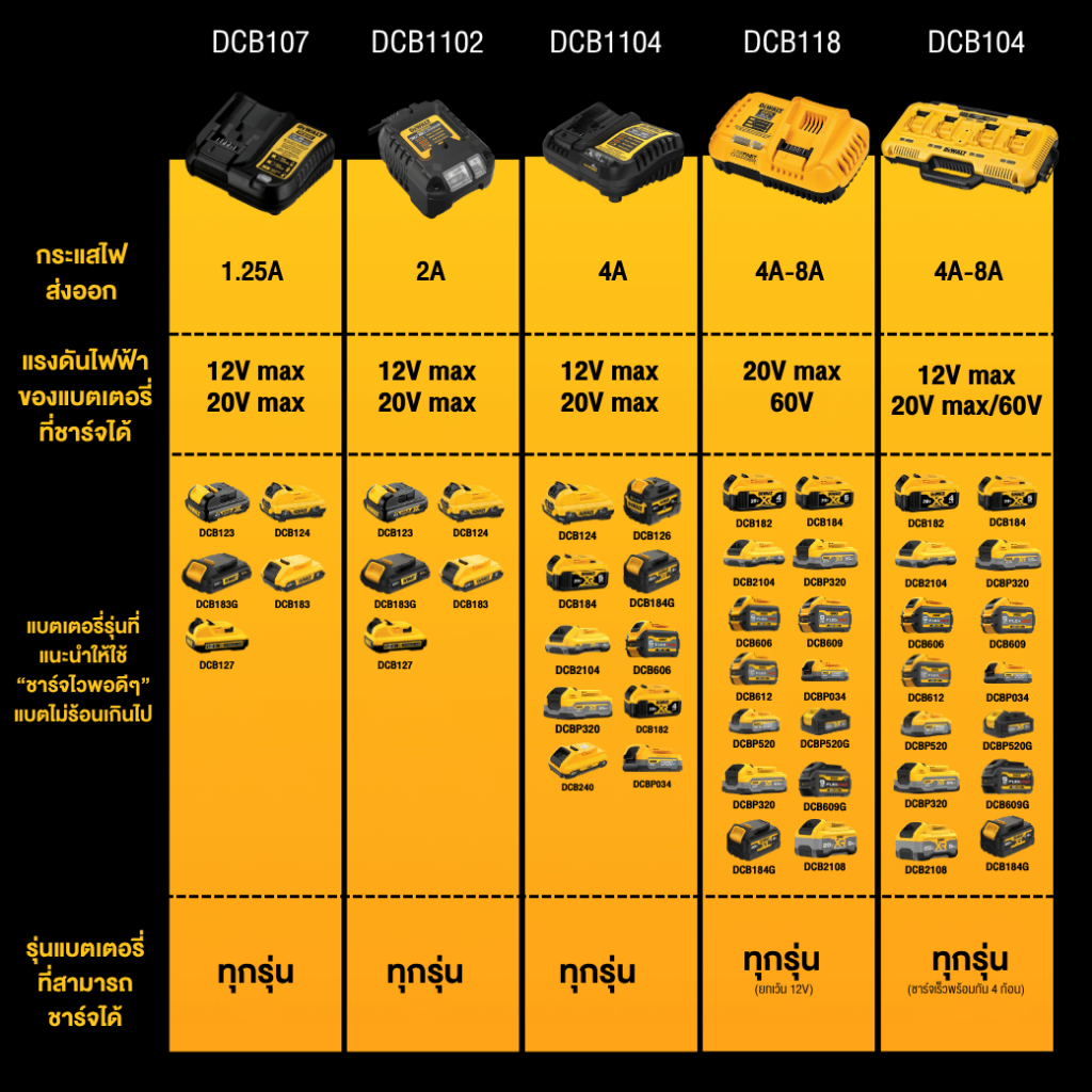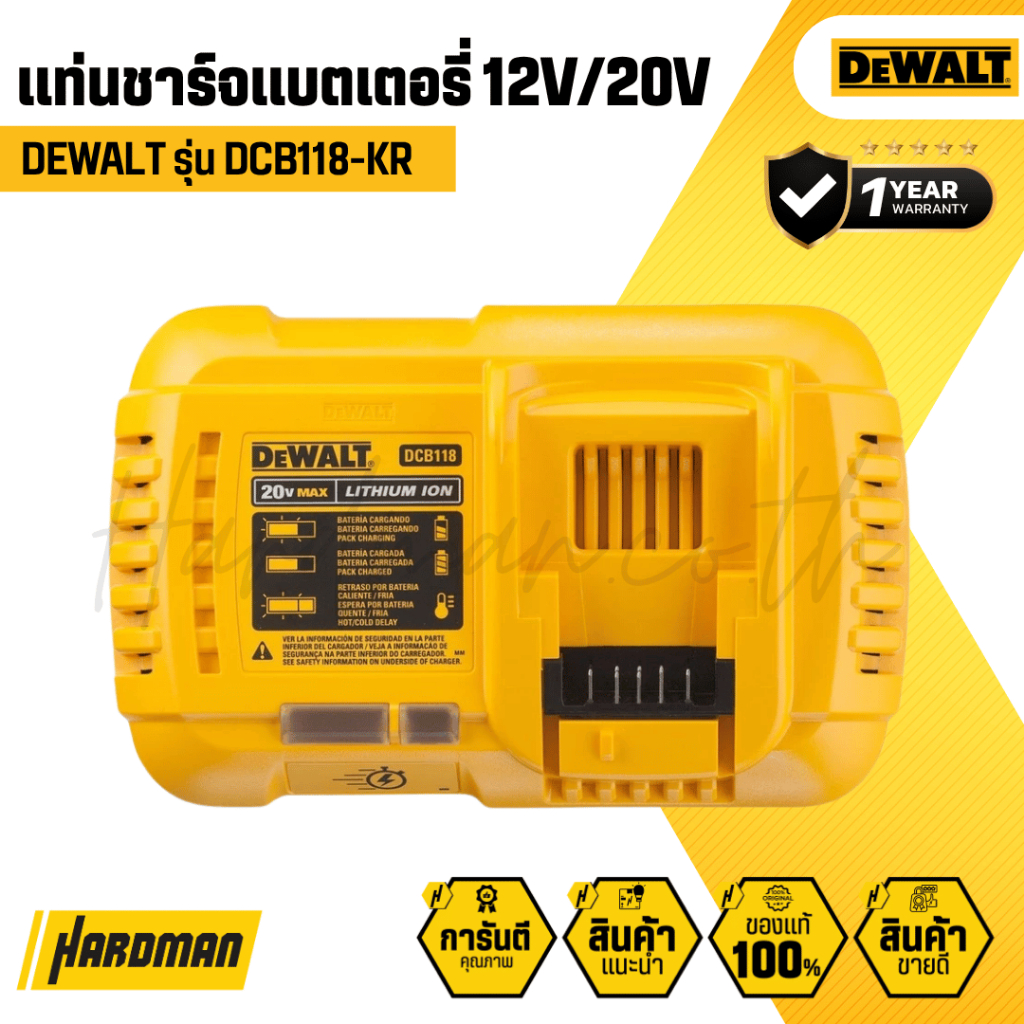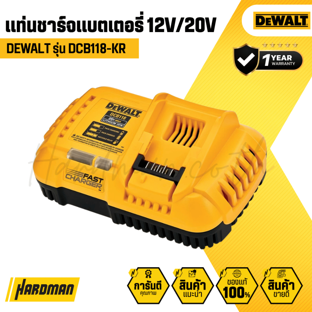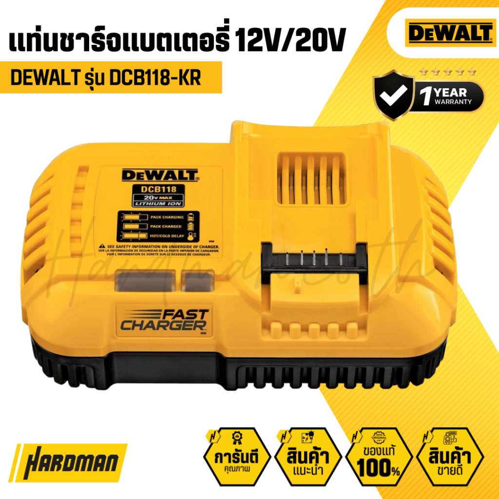 DCB118-KR เป็นแท่นชาร์จแบบชาร์จเร็ว (Fast Charger) สำหรับแบตเตอรี่ DEWALT 20V Max และ Flexvolt 60V Max ที่สามารถชาร์จแบตเตอรี่ลิเธียมไอออนความจุสูงได้อย่างรวดเร็วและปลอดภัย เหมาะสำหรับมืออาชีพที่ต้องการลดเวลาหยุดพักงานระหว่างชาร์จ