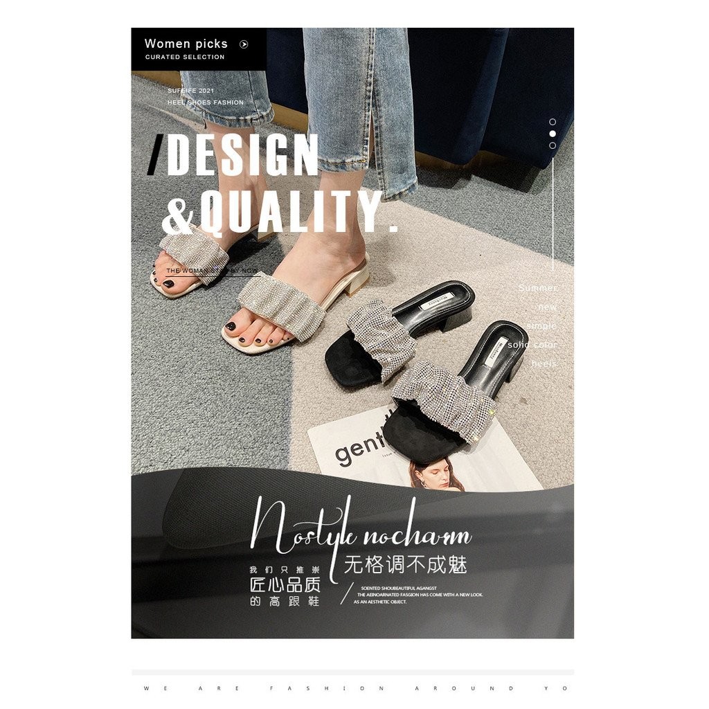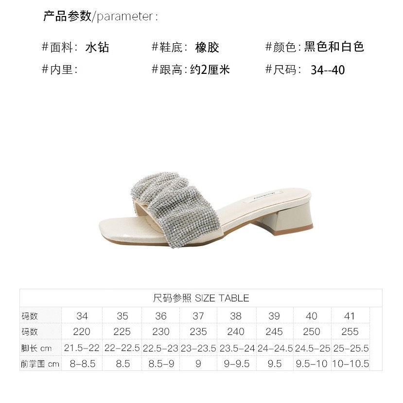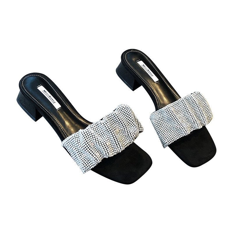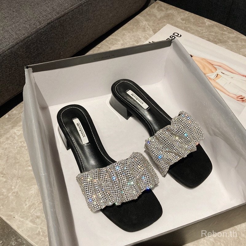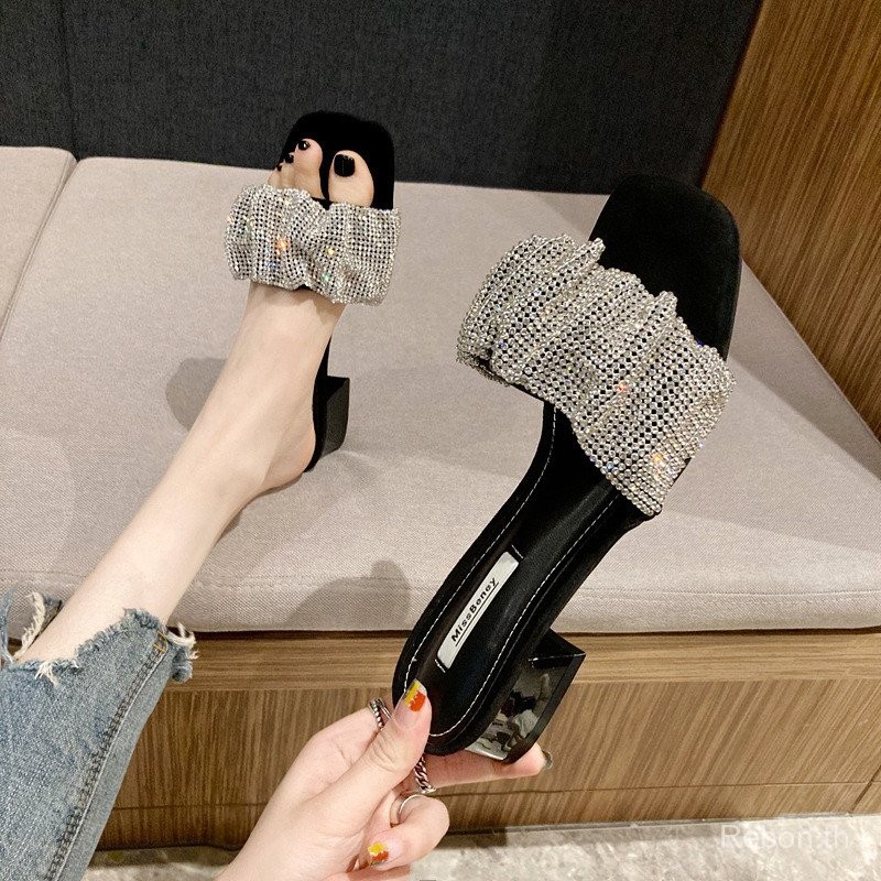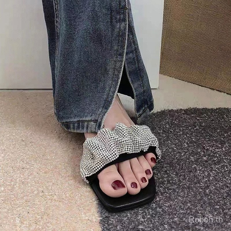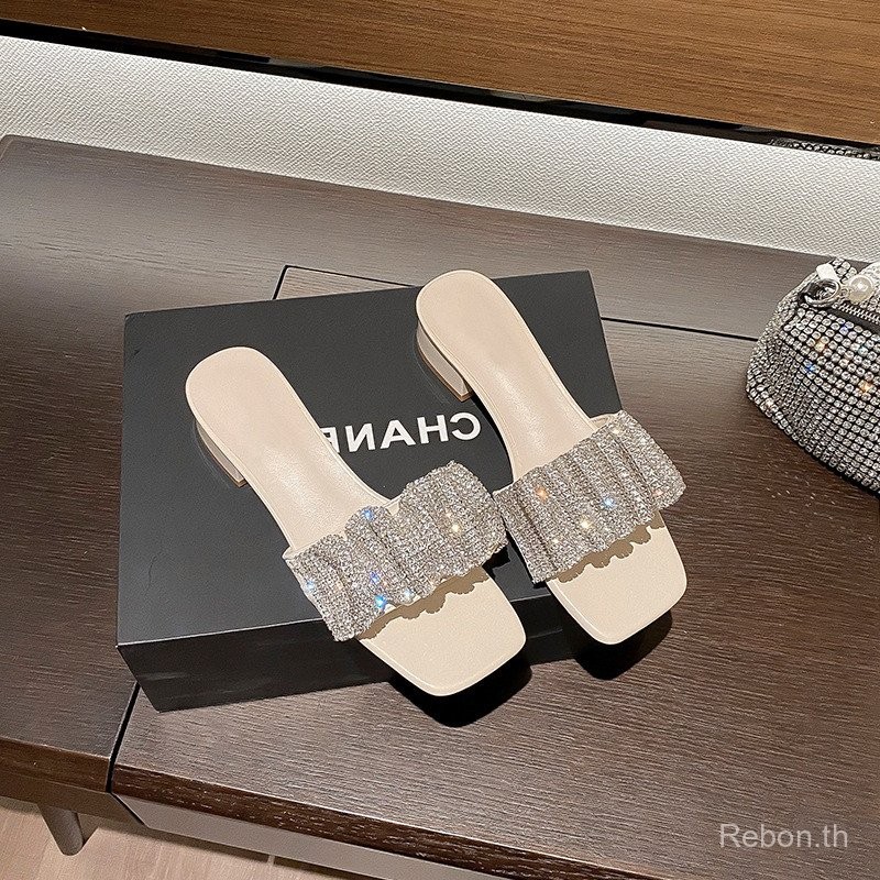 รองเท้าแตะฤดูร้อนผู้หญิงแฟชั่นใส่ด้านนอกสไตล์นางฟ้ารองเท้าแตะ rhinestone รุ่นใหม่ปี2023รองเท้าแตะส้นเตี้ยเปิดนิ้วเท้าส้นหนา cle9