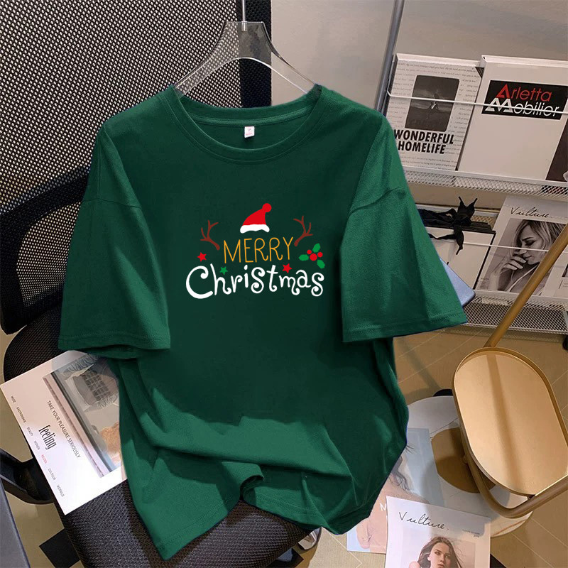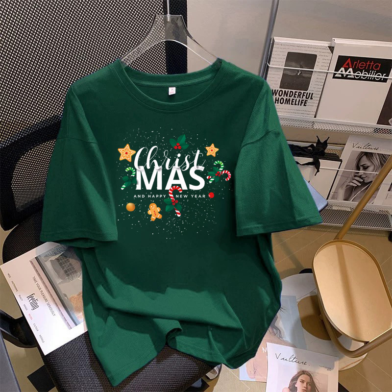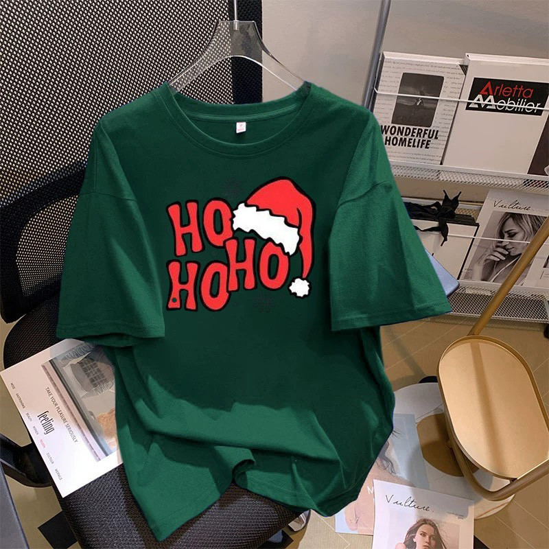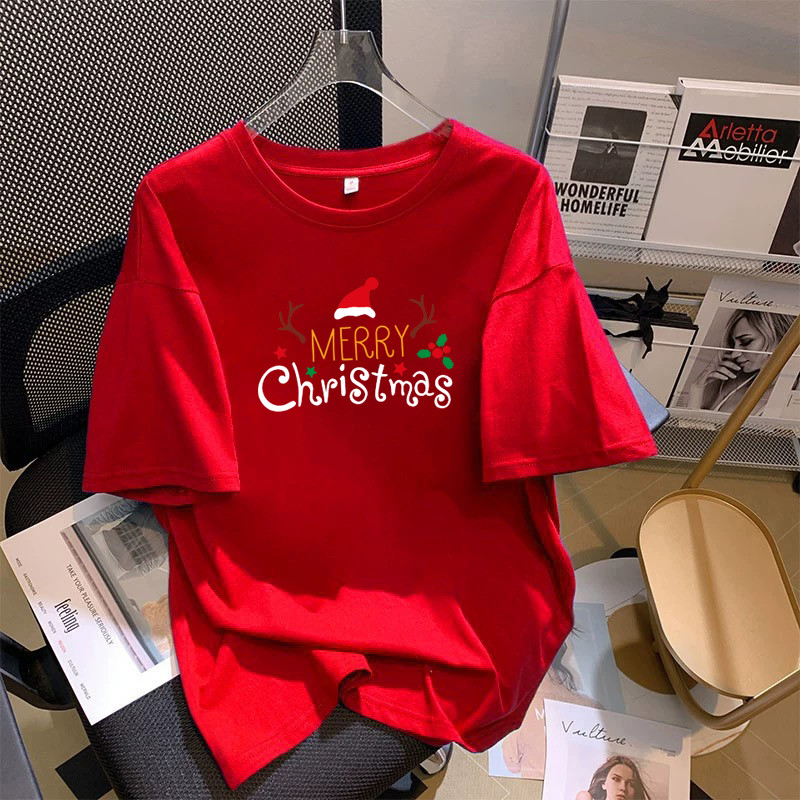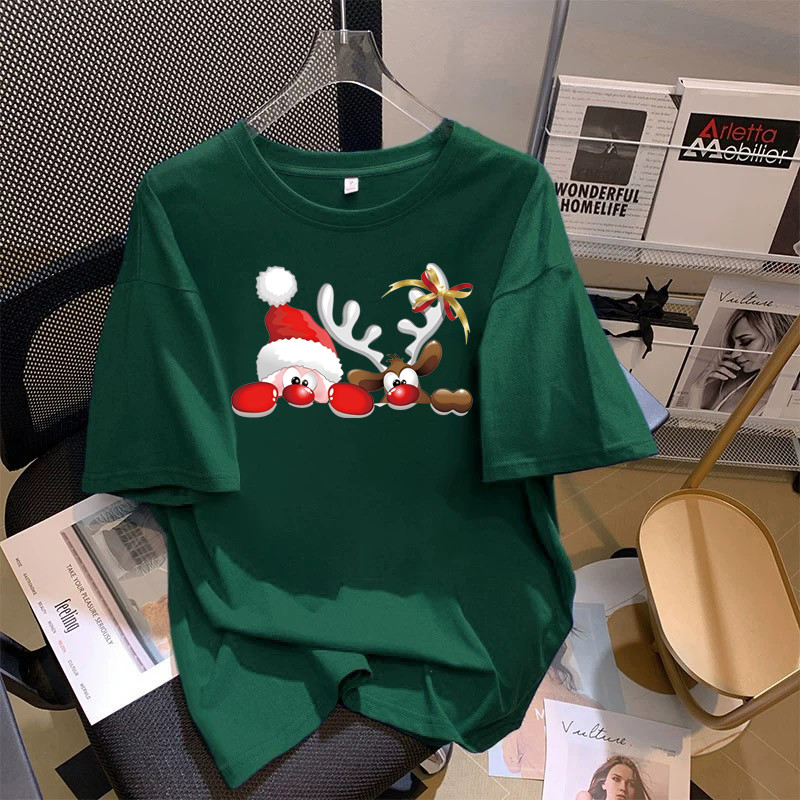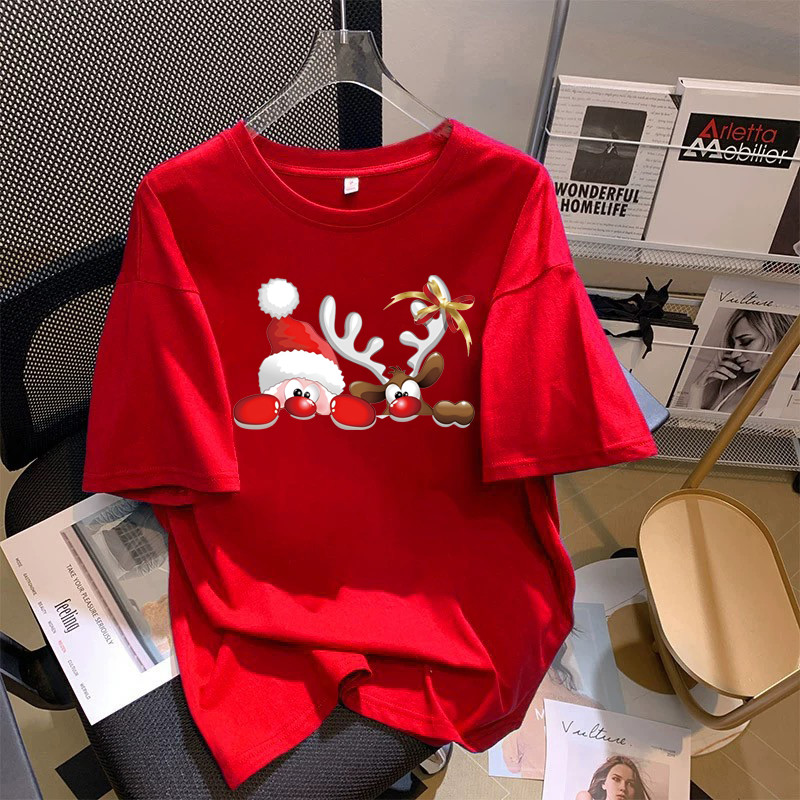 COD✅ (ส่งจากกรุงเทพ)BOOM Shop สีแดงสบาย ๆ ผ้าฝ้ายแขนสั้นคริสมาสต์ธีมเสื้อยืดซานตาคลอสกวางพิมพ์เสื้อ cotton 100#1