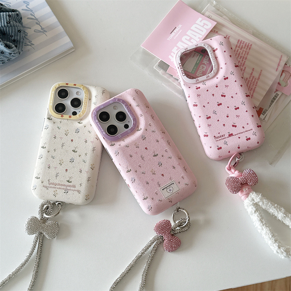 เต็มหน้าจอขนาดเล็กเชอร์รี่ดอกไม้ด้านข้างพิมพ์เคสโทรศัพท์สําหรับiphone 14 15 16 13 Pro Maxหรูหรา 3Dโบว์สายคล้องมือกันกระแทกกรณีปก