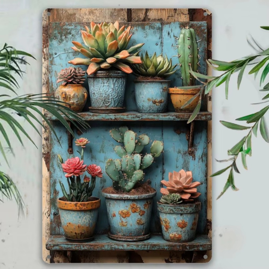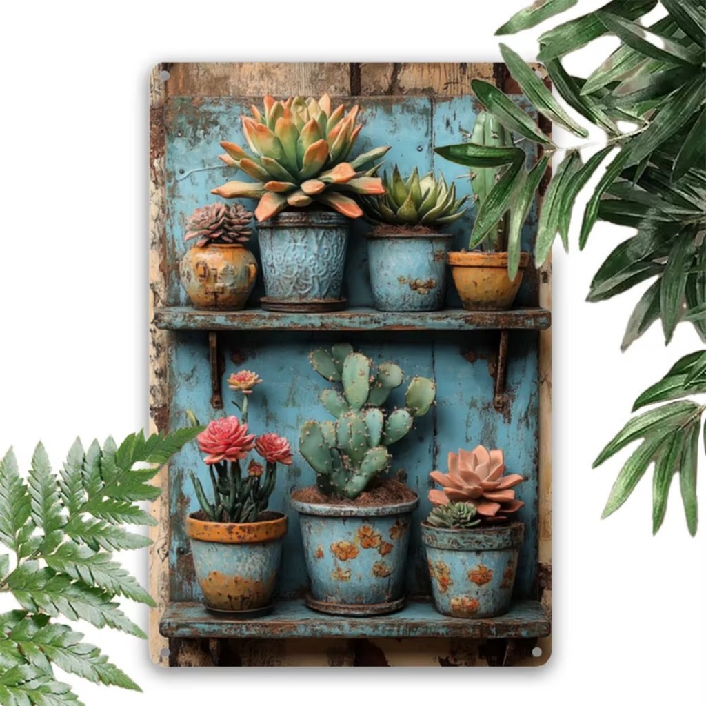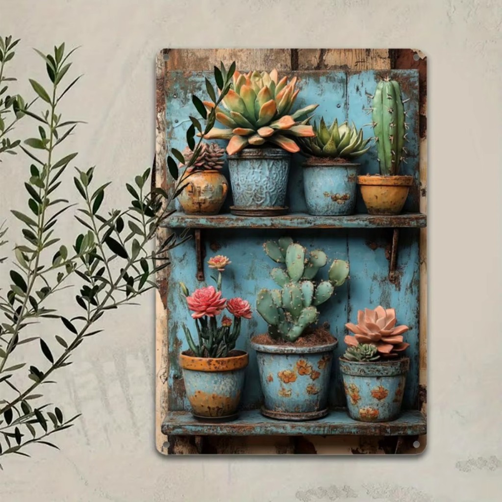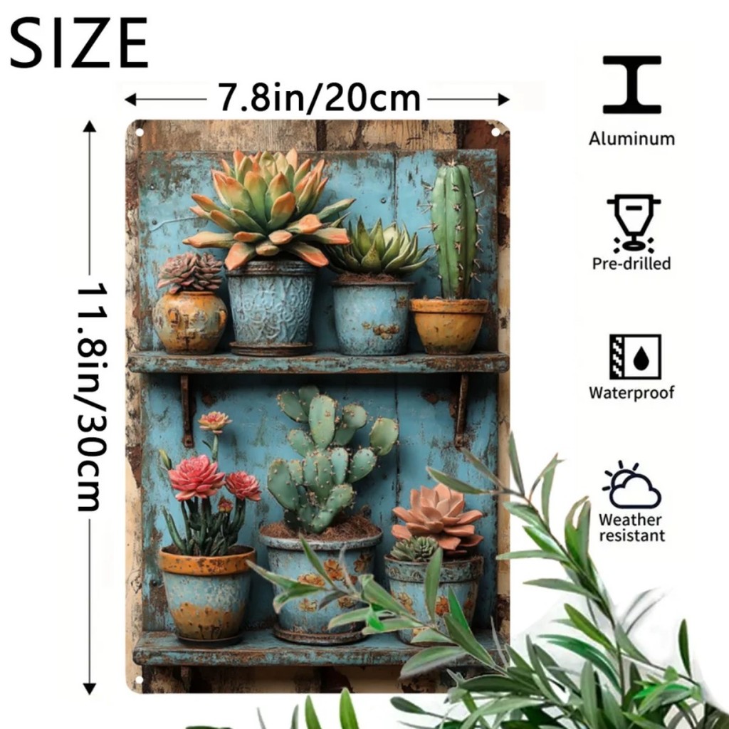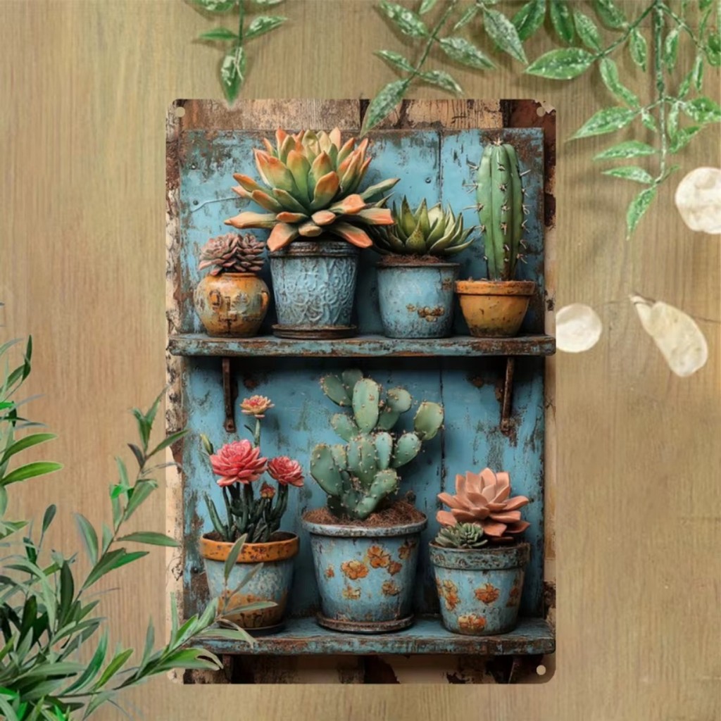 Charming 7.8×11.8″ Vintage ป้ายโลหะ Rustic Blue ชั้นวาง Potted Succulents กระบองเพชรสําหรับ Home Bar Cafe ในร่ม/กลางแจ้ง Decor