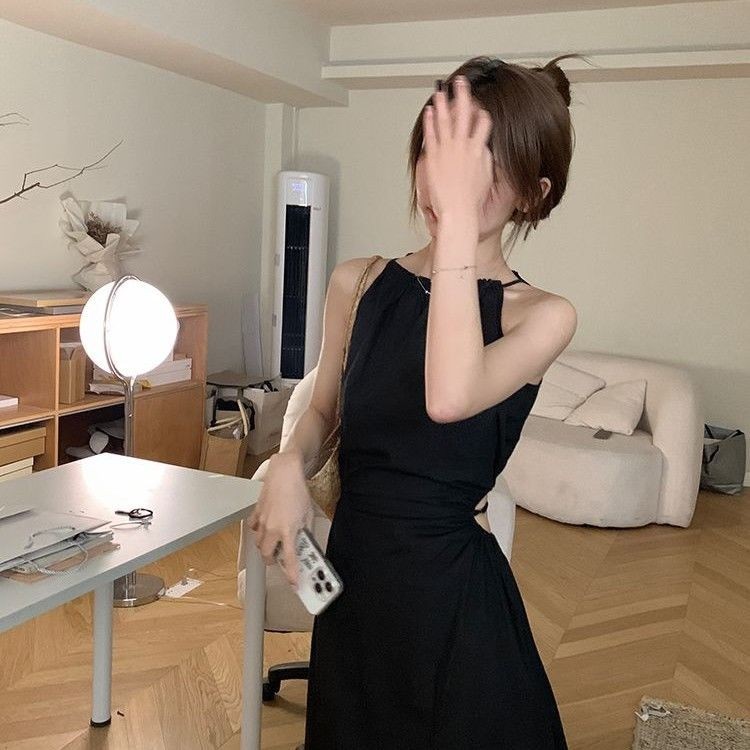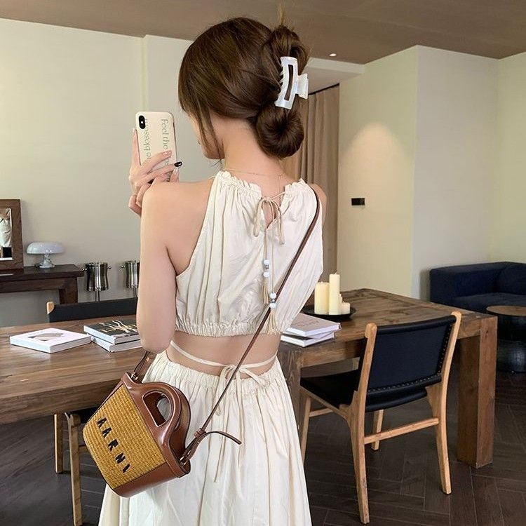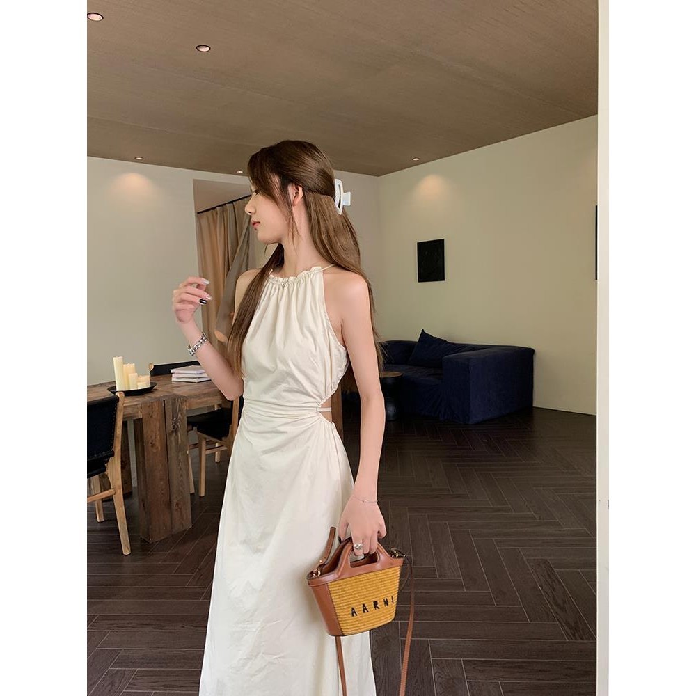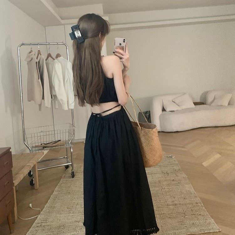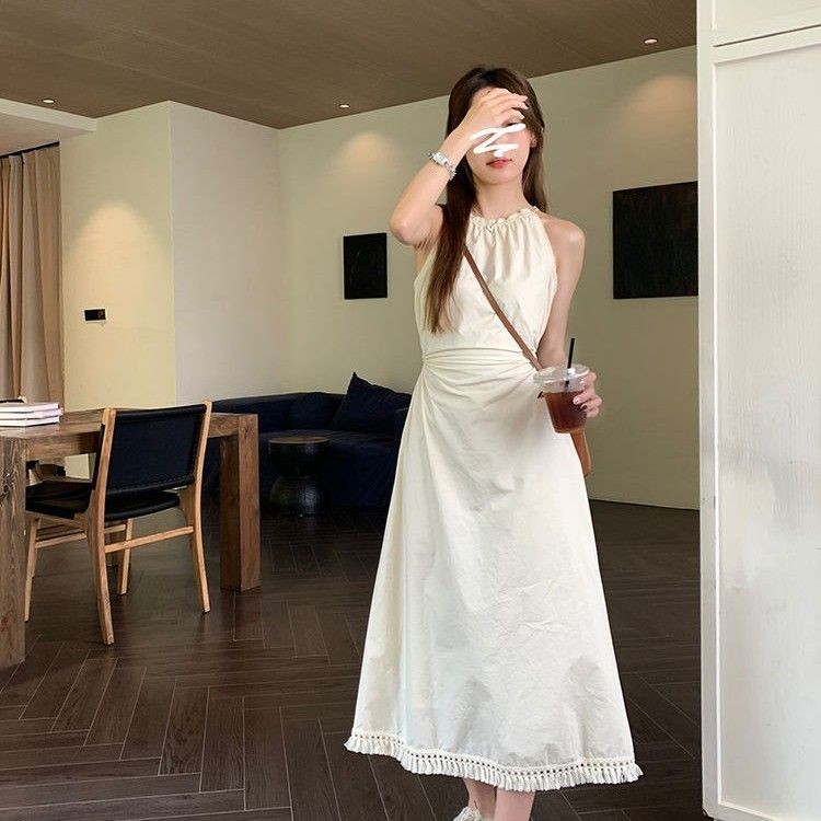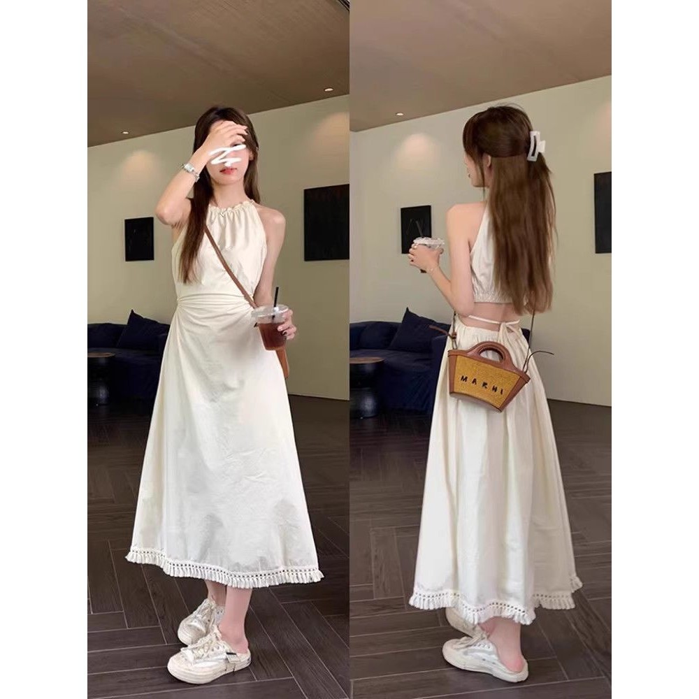 ออกแบบเอวกลวงออกแขวนคอสลิงชุดสําหรับผู้หญิงฤดูใบไม้ผลิและฤดูร้อนลูกไม้เอวปิดวันหยุดลดความอ้วนสไตล์พู่ชุดยาว