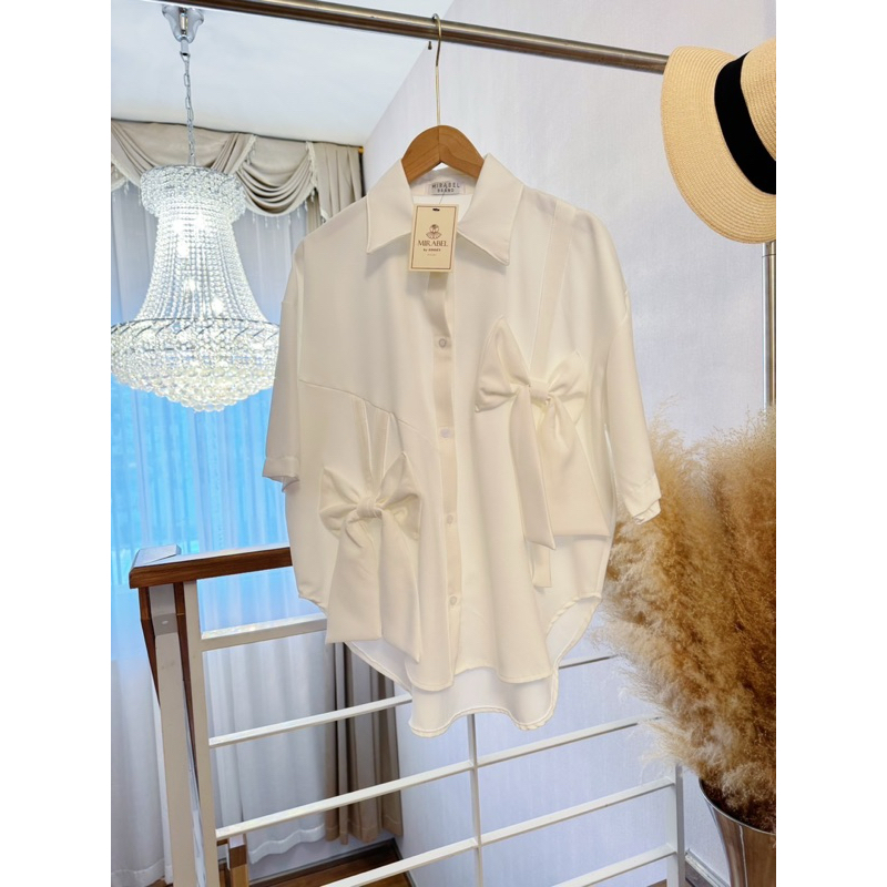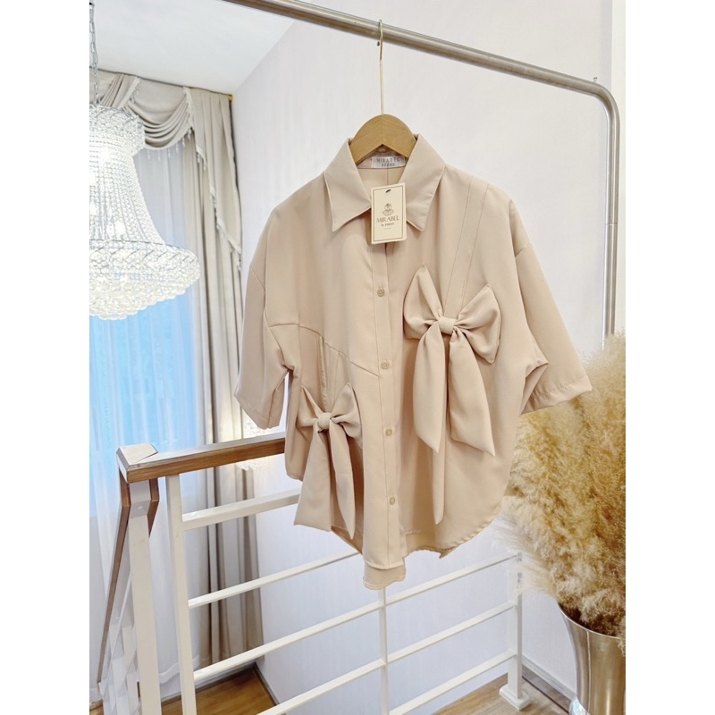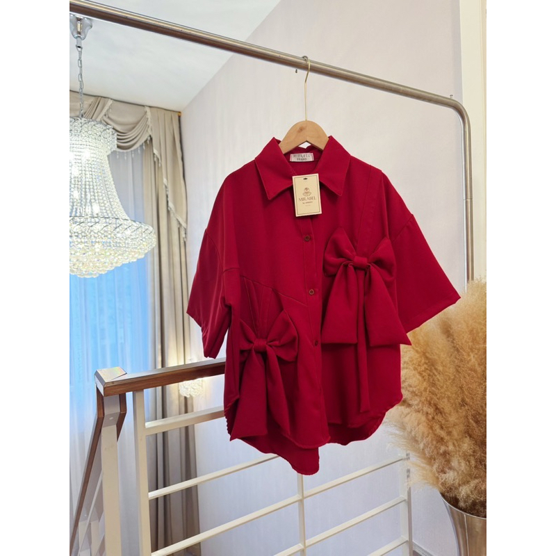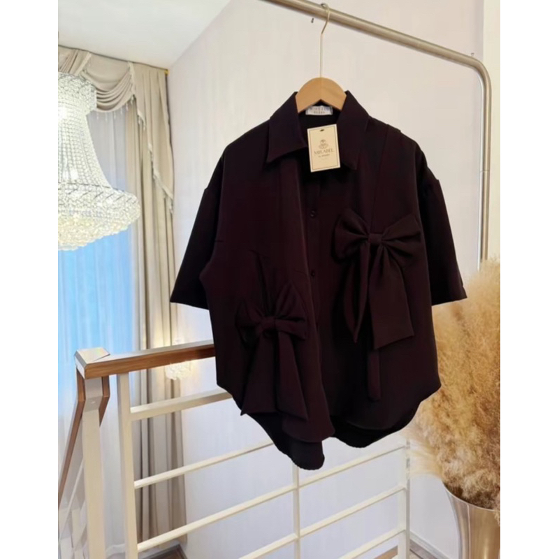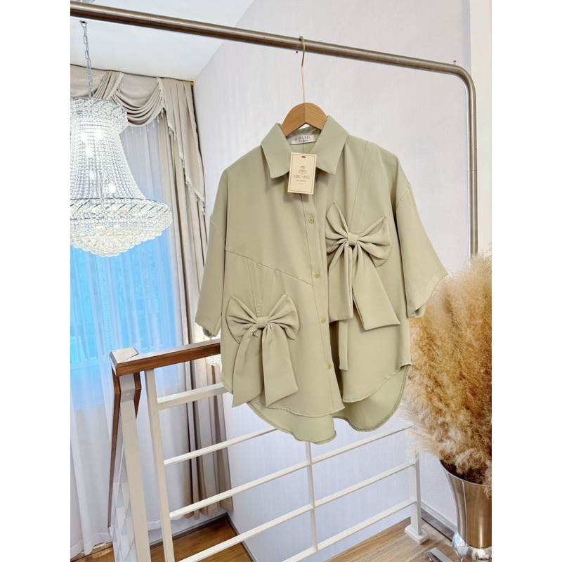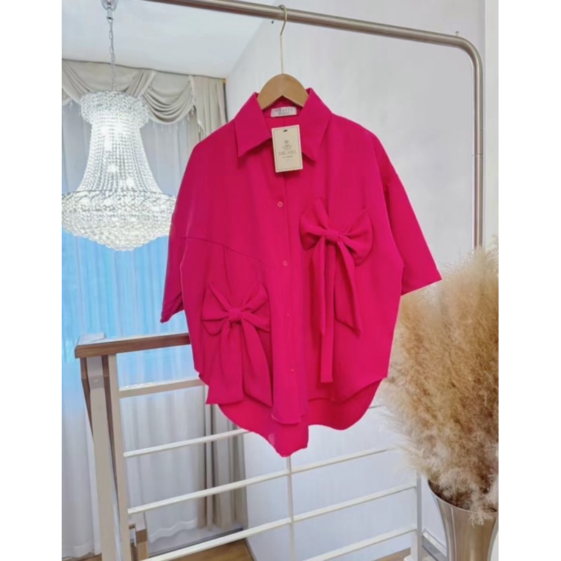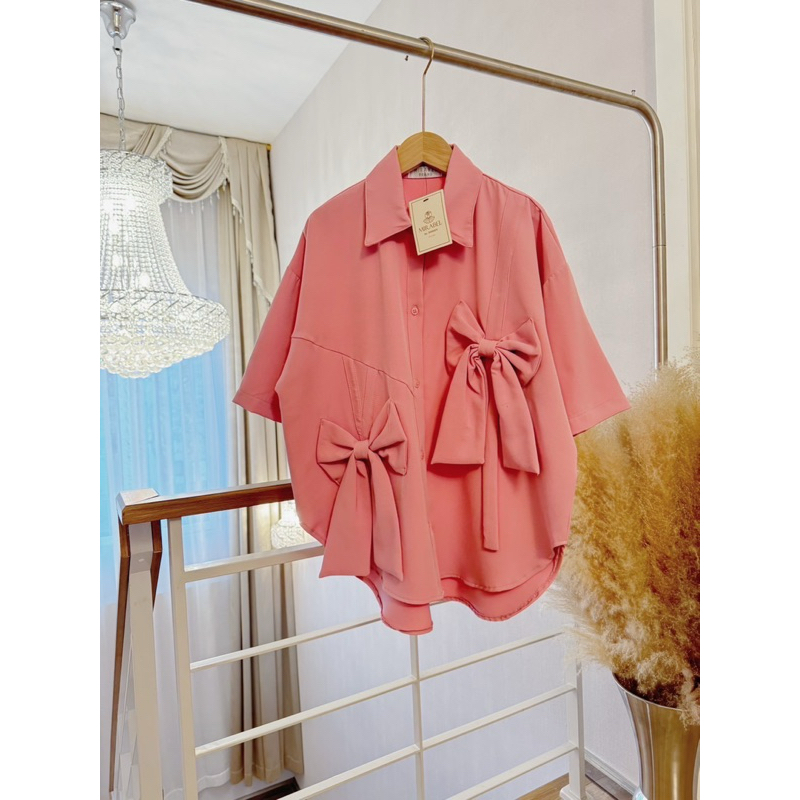 Z08.เสื้อเชิ้ตโอเวอร์ไซส์ เชิ้ตสีพื้นแขนสั้นโบว์ใหญ่ผ้าใส่สบาย อก50“