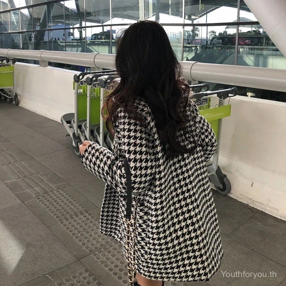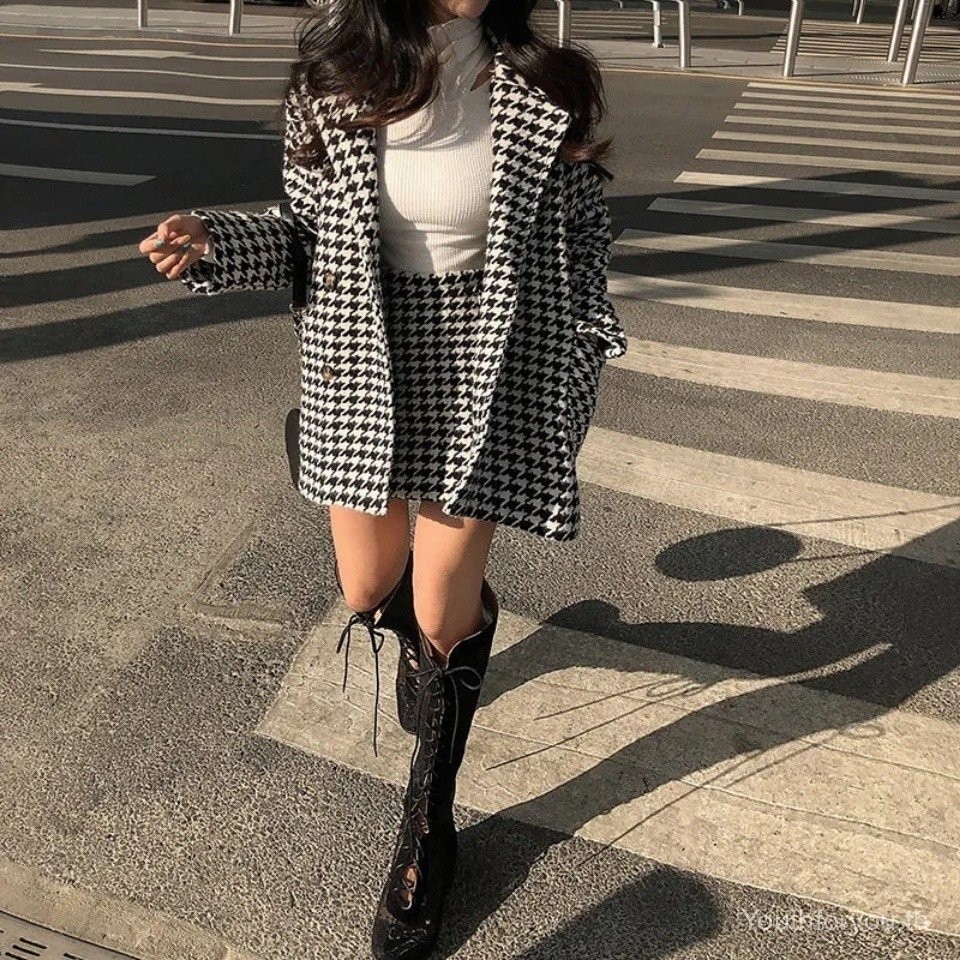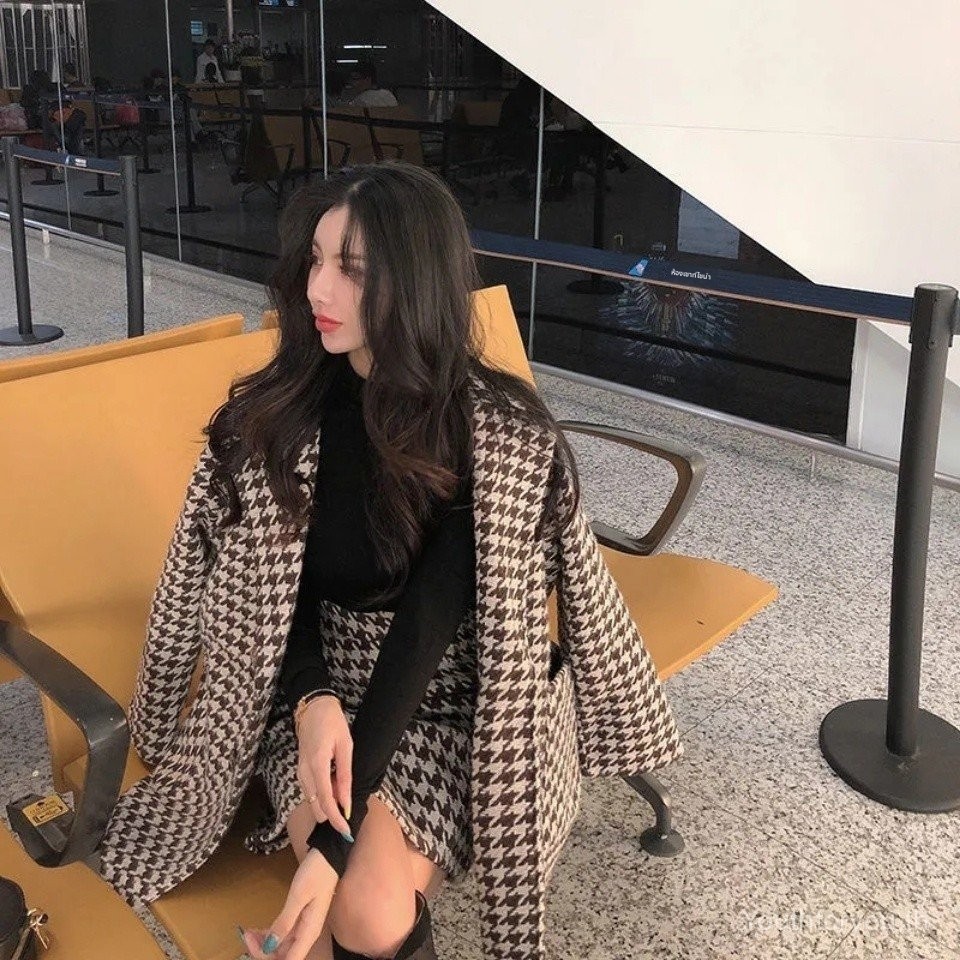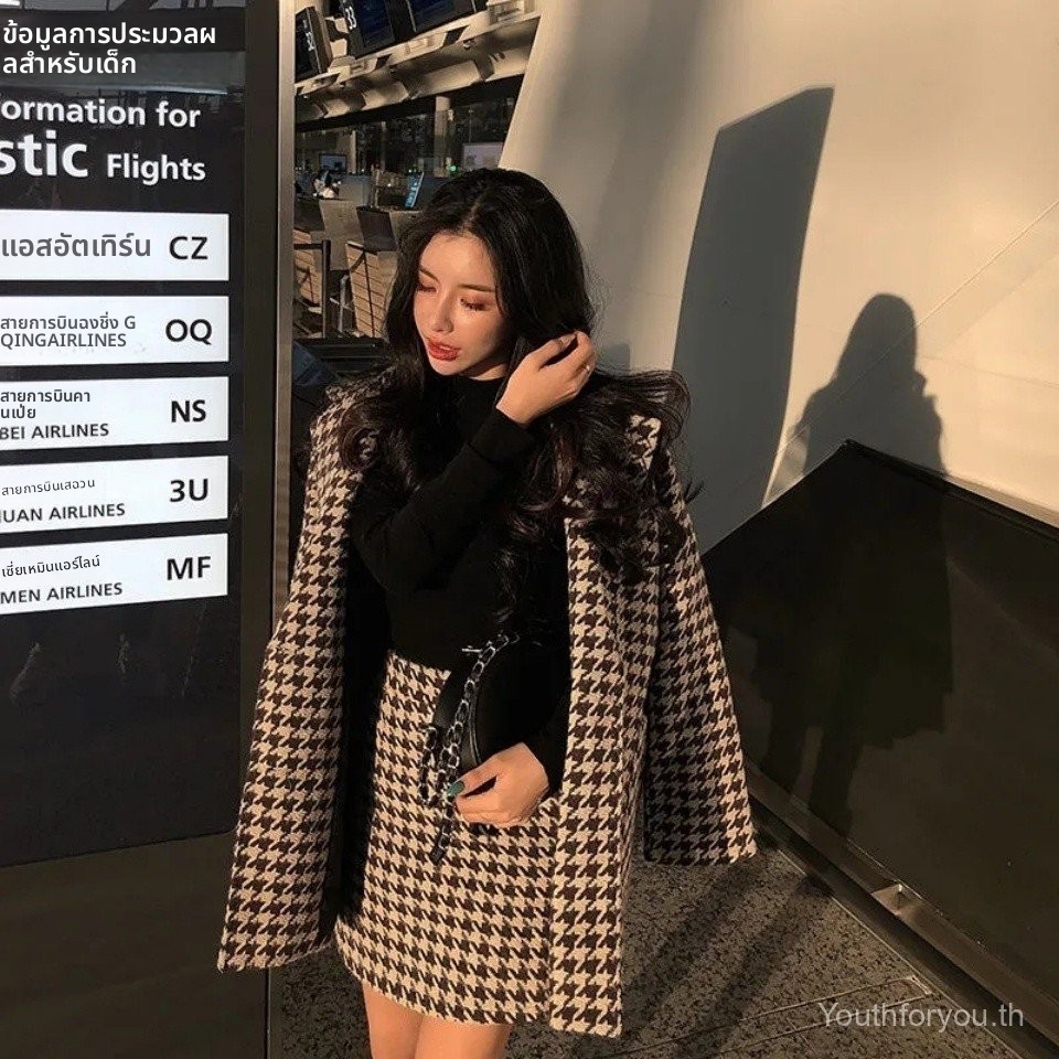 ชุดสูทไซส์ใหญ่สไตล์เกาหลีสไตล์ญี่ปุ่นเสื้อโค้ทผู้หญิงชุดฤดูหนาวเสื้อโค้ทผ้าวูลผ้าวูลลายฮานส์กระโปรงเอวสูงชุดสองชิ้น