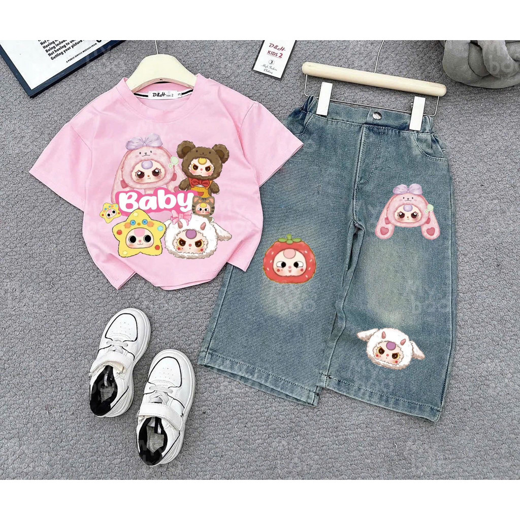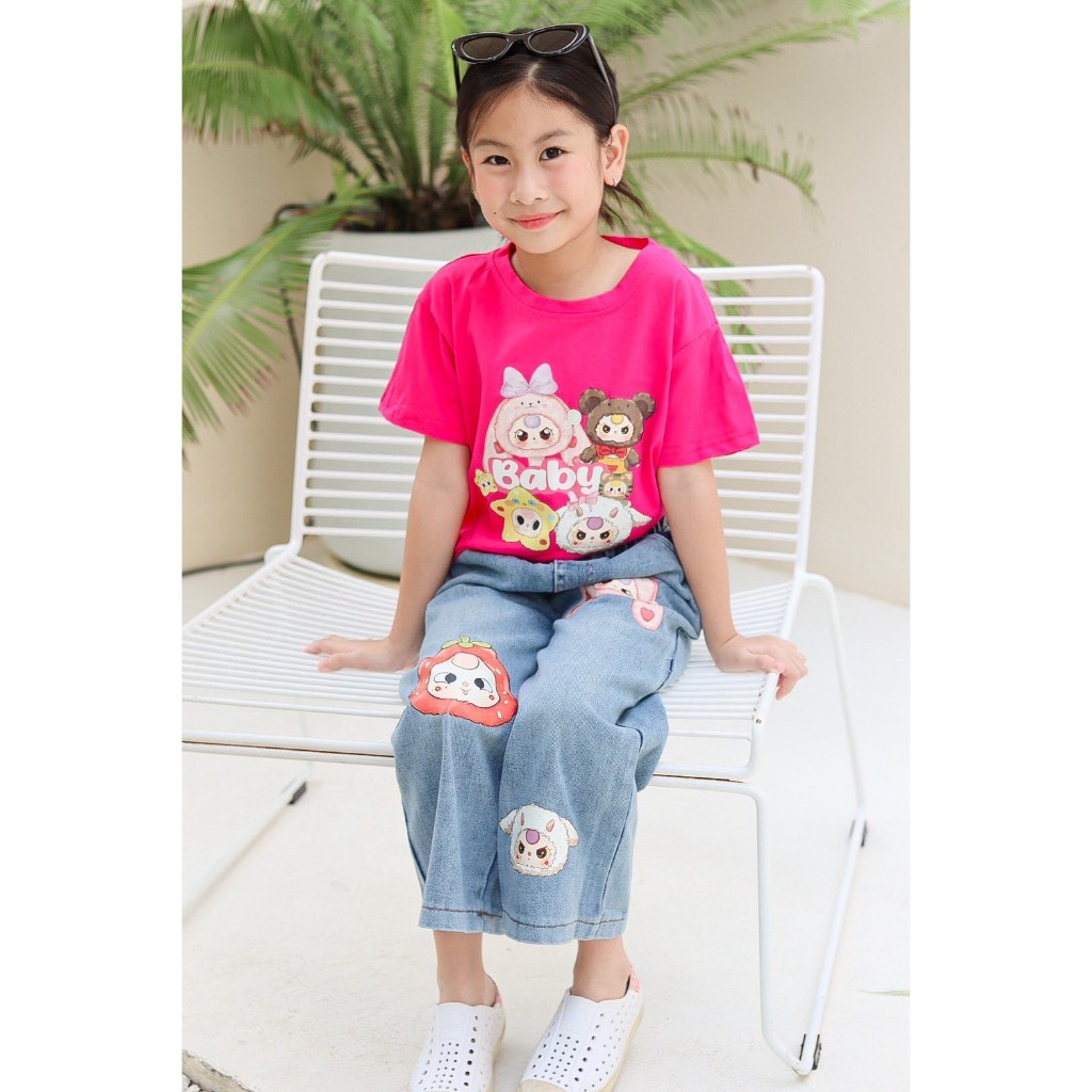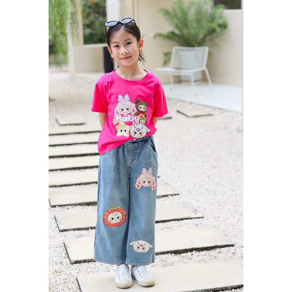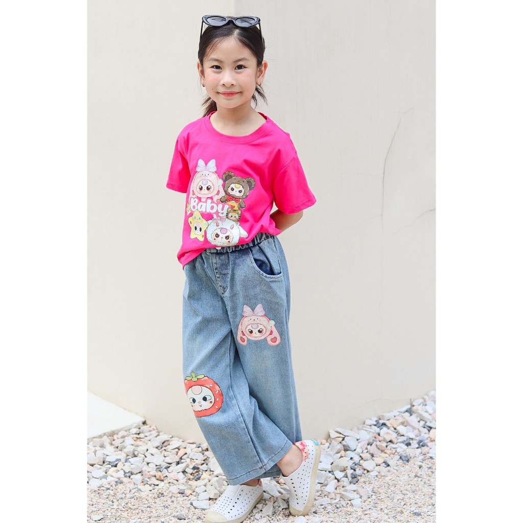 ชุดเซตลูกสาวกางเกงยีนแท้ขายาว + เสื้อผ้าคอตตอนพิมลาย baby three งานดีค่า