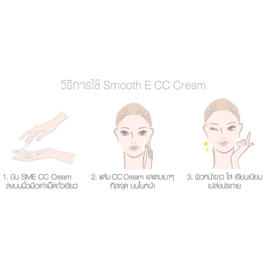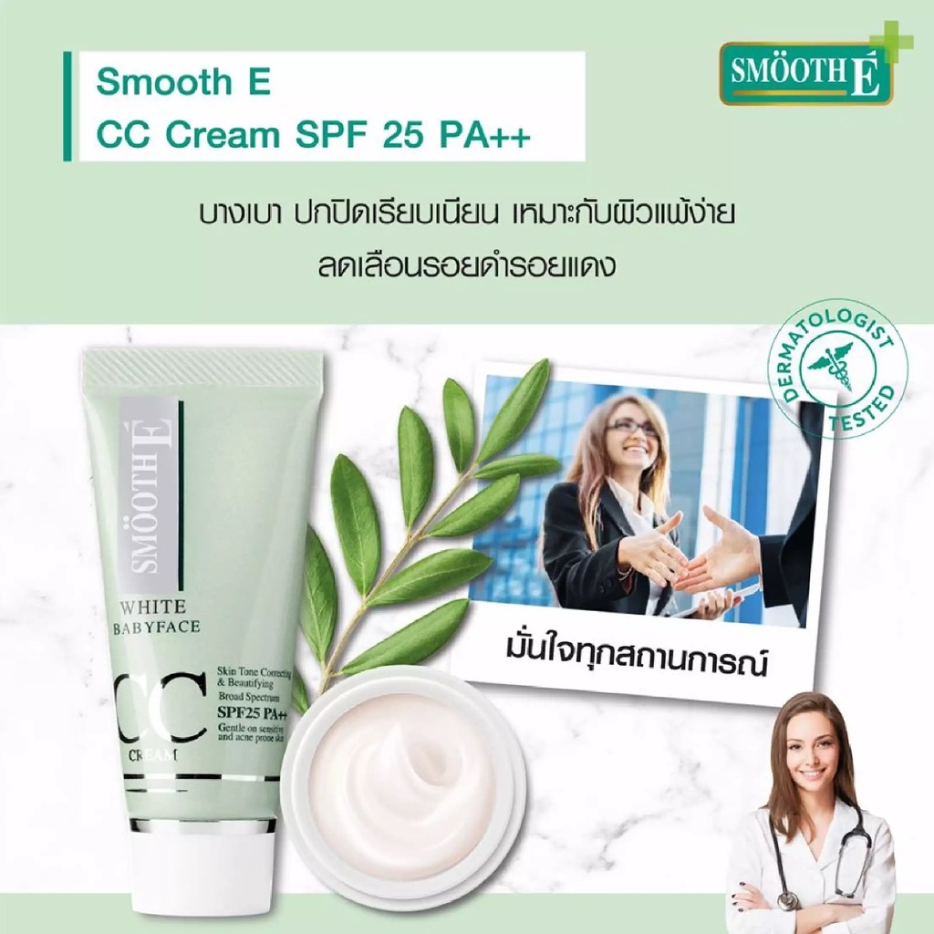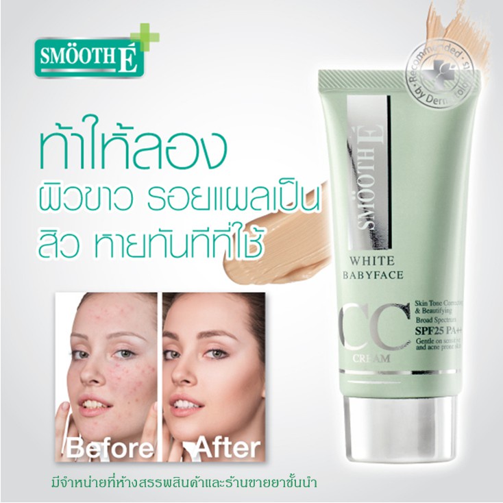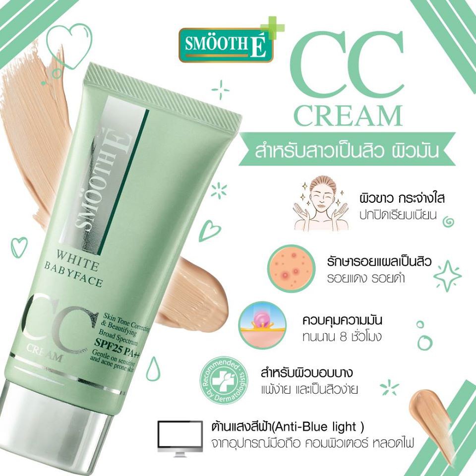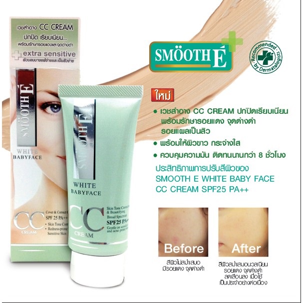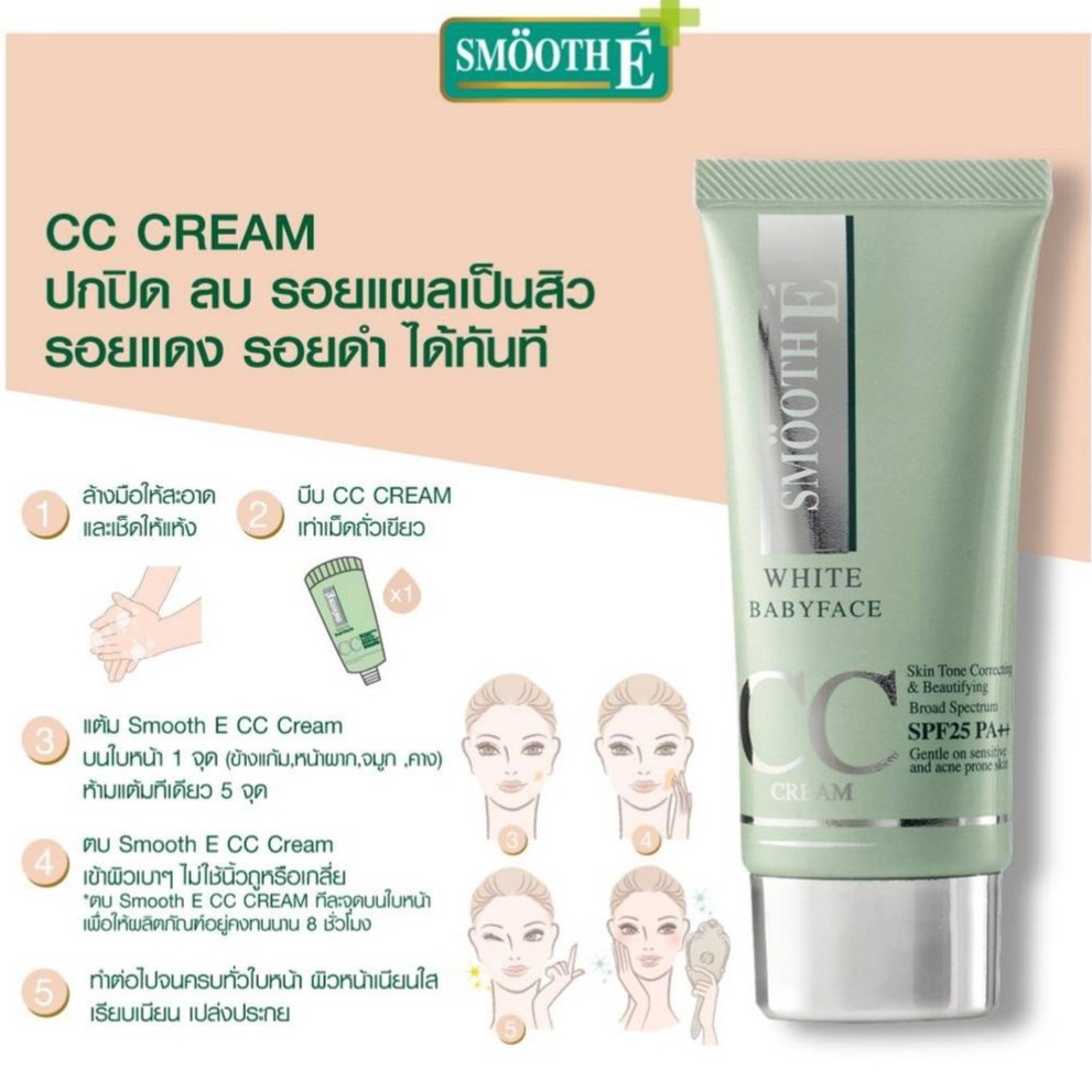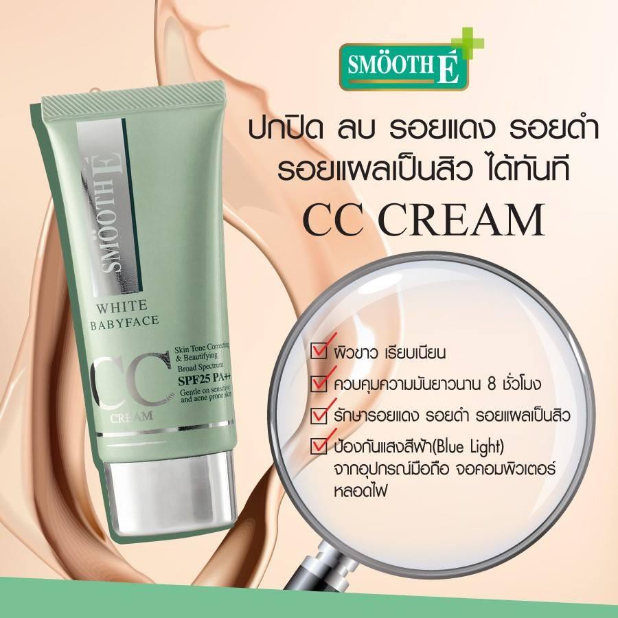 -สมูท อี ไวท์ เบบี้เฟส ซีซี ครีม เอสพีเอฟ 50 พีเอ ++++ เป็นครีมบำรุงผิวหน้าผสมสารกันแดด และมีคุณสมบัติในการปกปิดรอยแดง จุดด่างดำ ช่วยให้ผิวดูเรียบเนียน จากคุณสมบัติของ CC Cream ช่วยลดฝ้ากระ จ