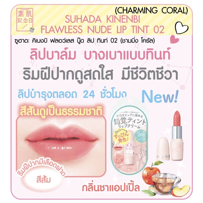 SUHADA KINENBI FLAWLESS NUDE LIP TINT 02 (CHARMINGCORAL) 3.1 G / ลิปทินต์บำรุงริมฝีปาก สีแสด กลิ่นชาแอปเปิ้ล