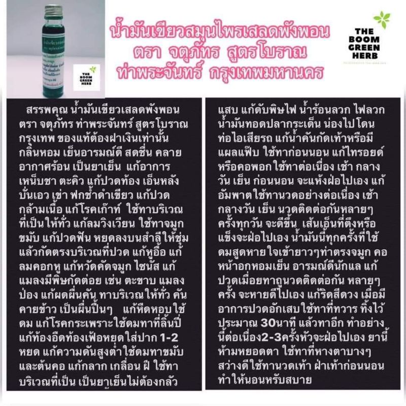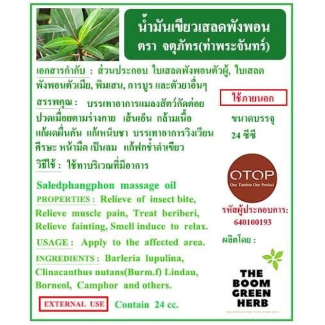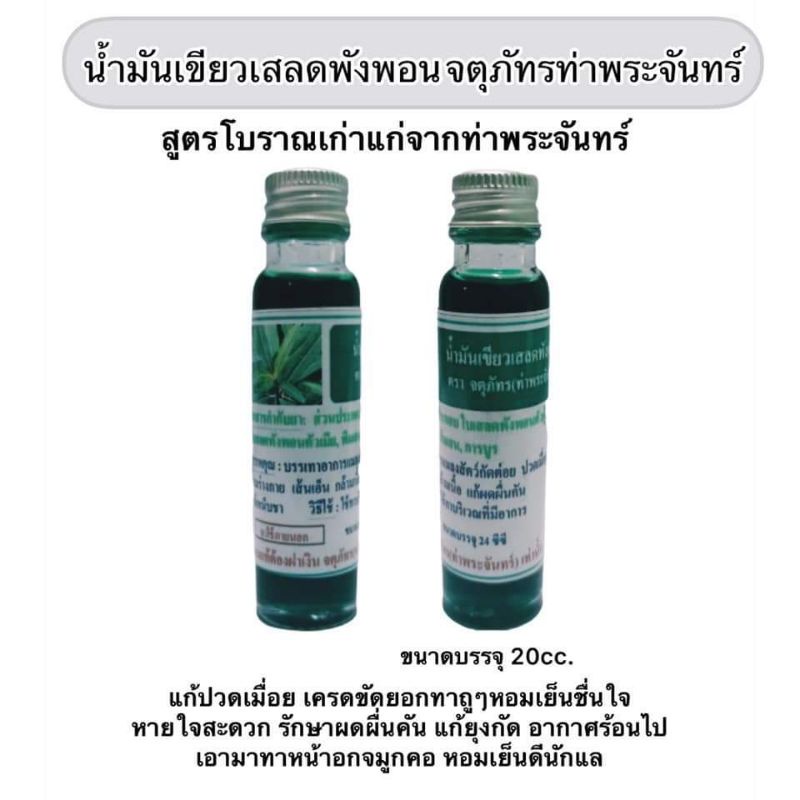 น้ำมันเขียวเสลดพังพอนตราจตุภัทรท่าพระจันทร์ เป็นสูตรโบราณเก่าแก่ที่สืบทอดบอกต่อกันมาจากรุ่นสู่รุ่น มีกลิ่นหอมสดชื่นกลิ่นเอกลักษณ์เฉพาะตัวตราจตุภัทรท่าพระจันทร์เท่านั้น สรรพคุณ แก้ปวดเมื่อย เครดขัดยอก แมลงสัตว์กัดต่อ ใช้ถูนวดผ่อนค