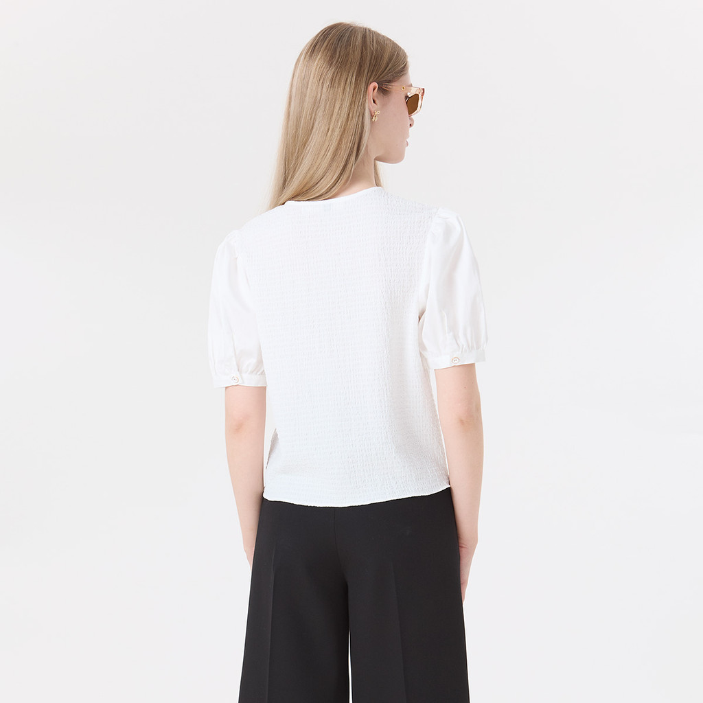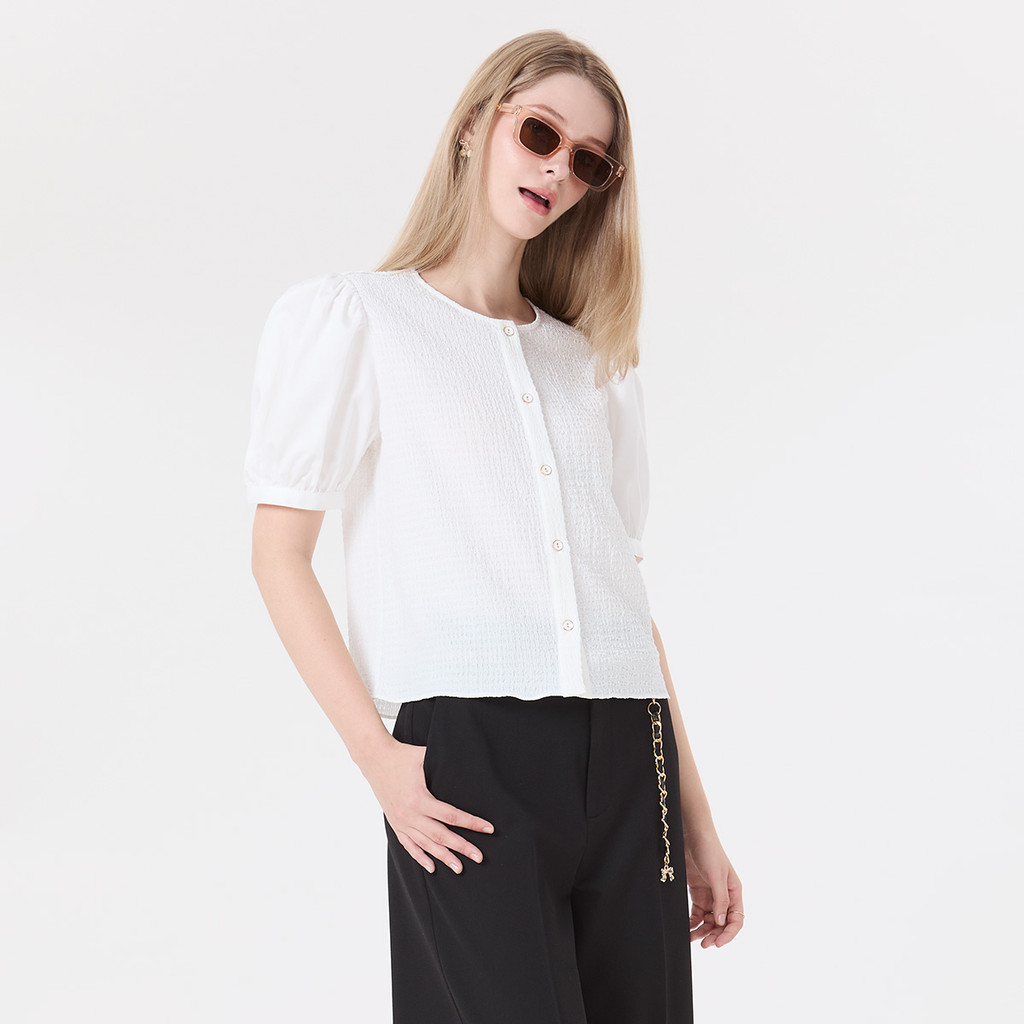 คีย์ลุคความเนี้ยบอย่างมีสไตล์ด้วย เสื้อเบลาส์แขนสั้น ทรงพอง (Puff Sleeves) สีออฟไวท์ โดดเด่นด้วยผ้าเท็กซ์เจอร์สุดพรีเมียมและกระดุมขอบทอง เพิ่มความหวานแบบเรียบหรูในลุคเดียว เนื้อผ้าผสม Cotton Polyester และ Fancy Spandex ช่วยให้ใส่สบาย ยืดหยุ่นเล็กน้อย และไ