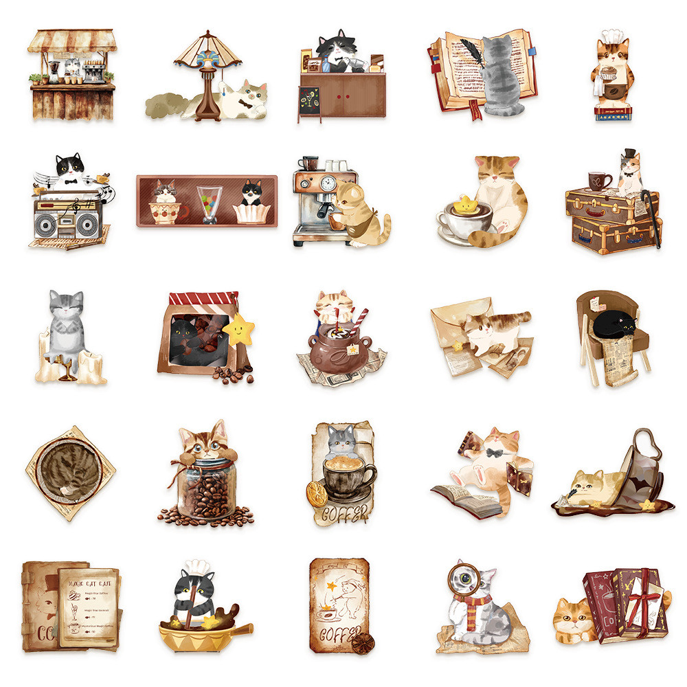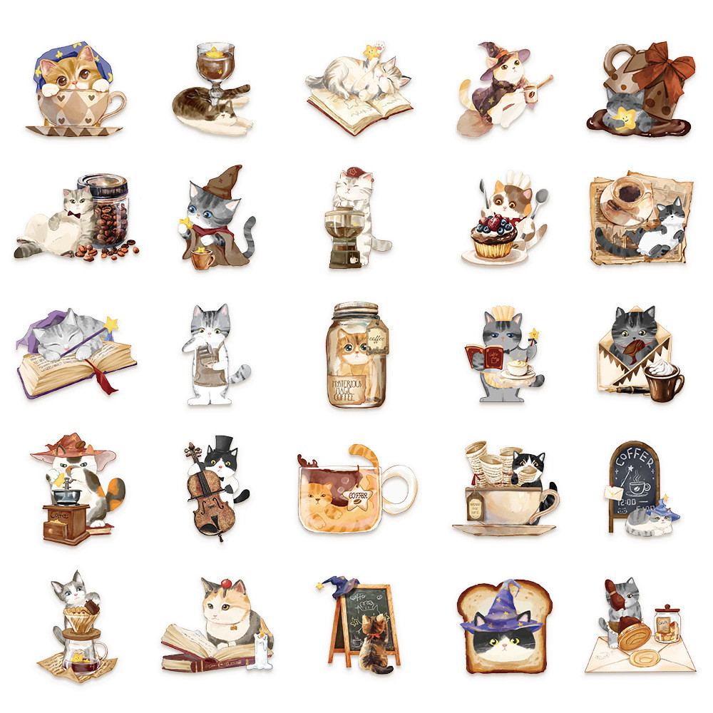 50 ชิ้นน่ารัก Cat Cafe PET พลาสติกสติกเกอร์ Transpanrent