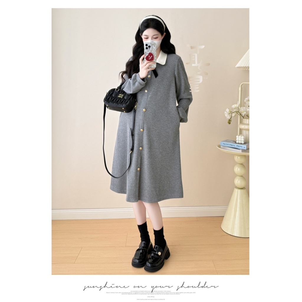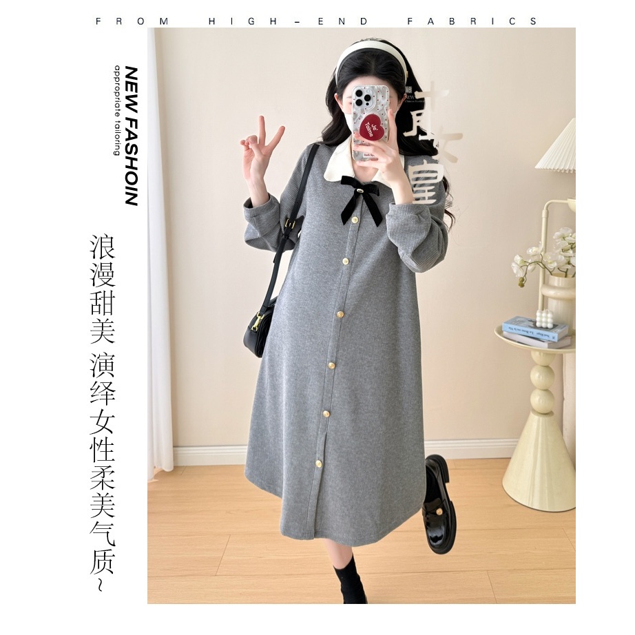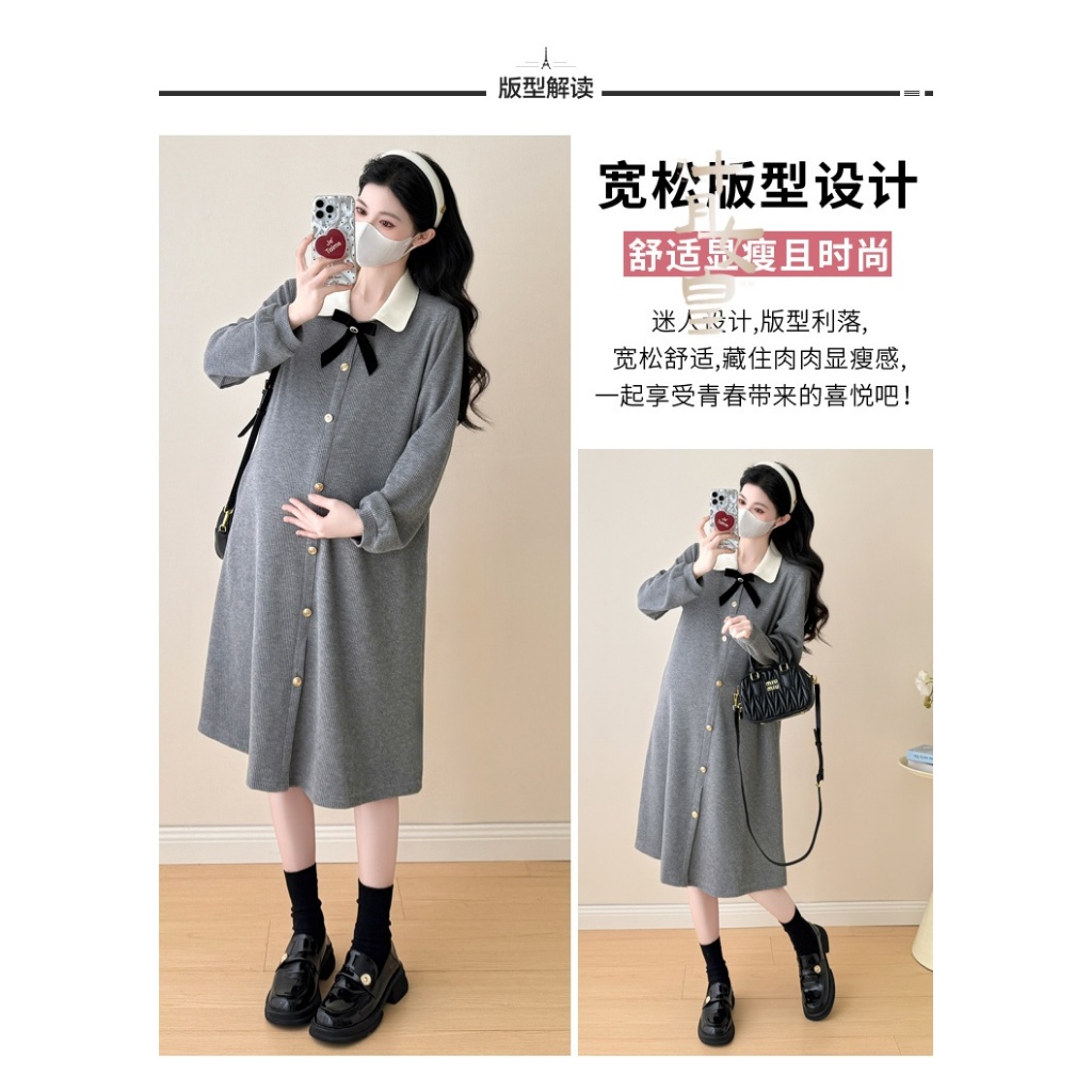 ฤดูใบไม้ร่วงฤดูหนาวชุดคลุมท้องแขนยาวLapel BowknotคลอดบุตรชุดยาวOver-the-KneeชุดSlimmerดูAll-Match A @