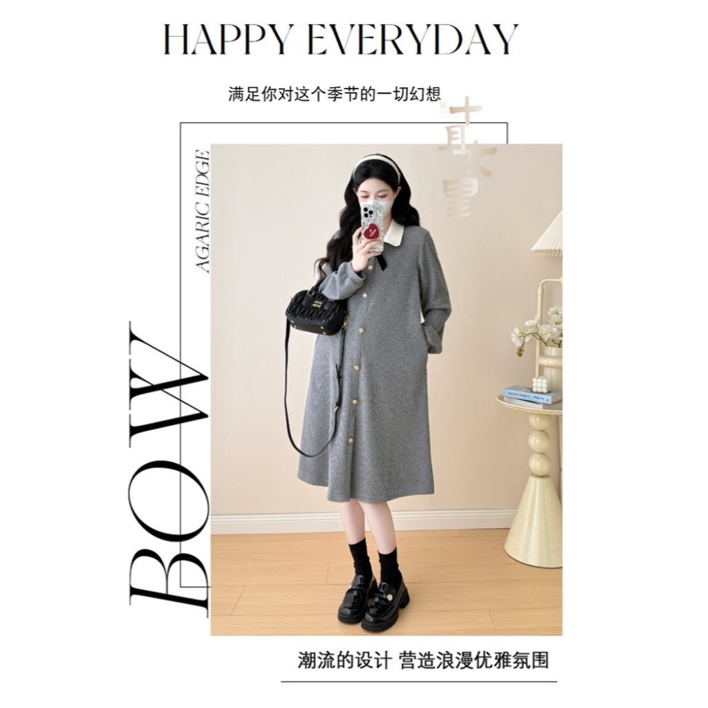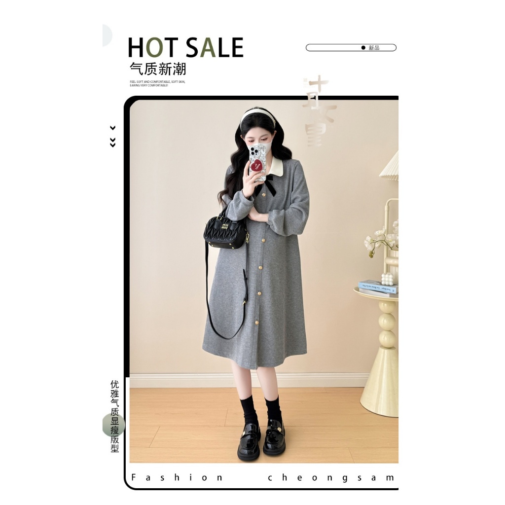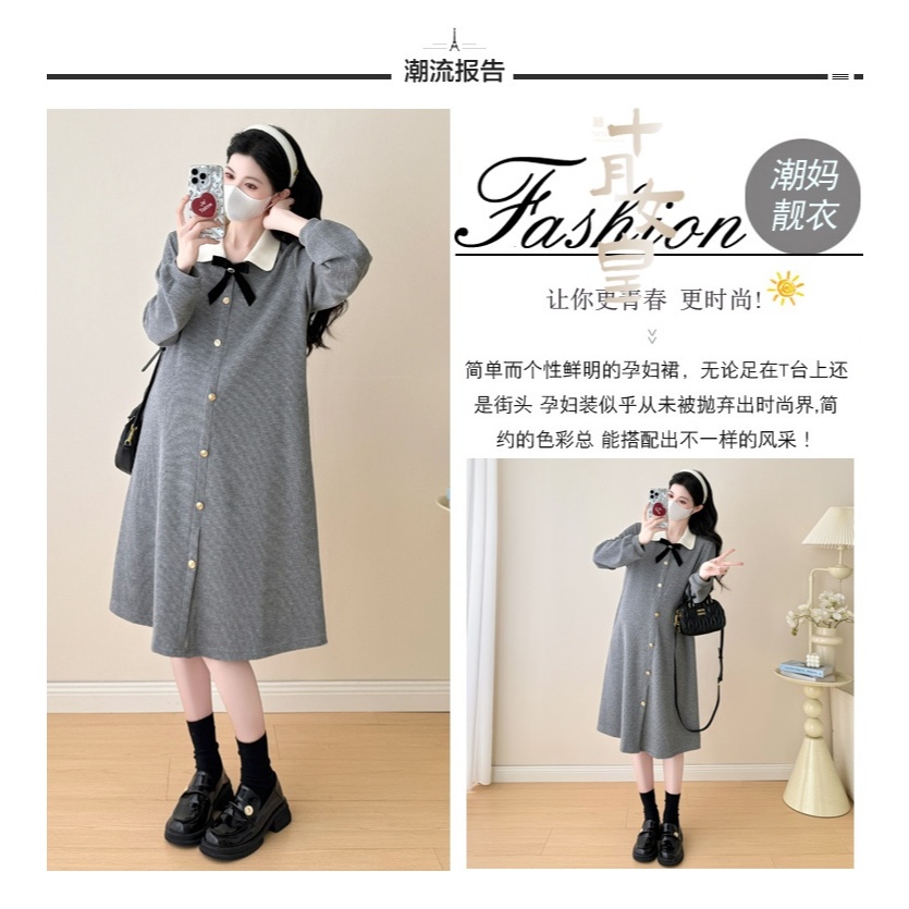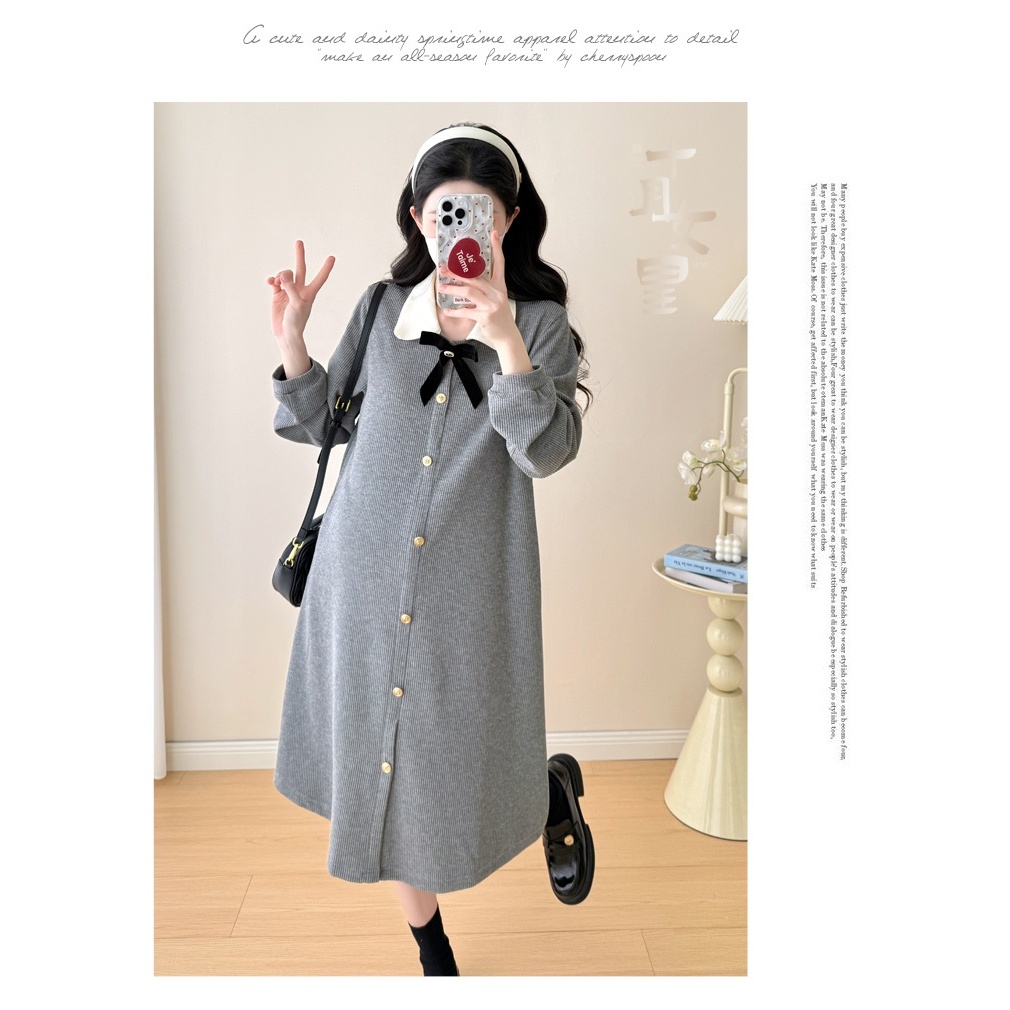 ฤดูใบไม้ร่วงฤดูหนาวชุดคลุมท้องแขนยาวLapel BowknotคลอดบุตรชุดยาวOver-the-KneeชุดSlimmerดูAll-Match A @