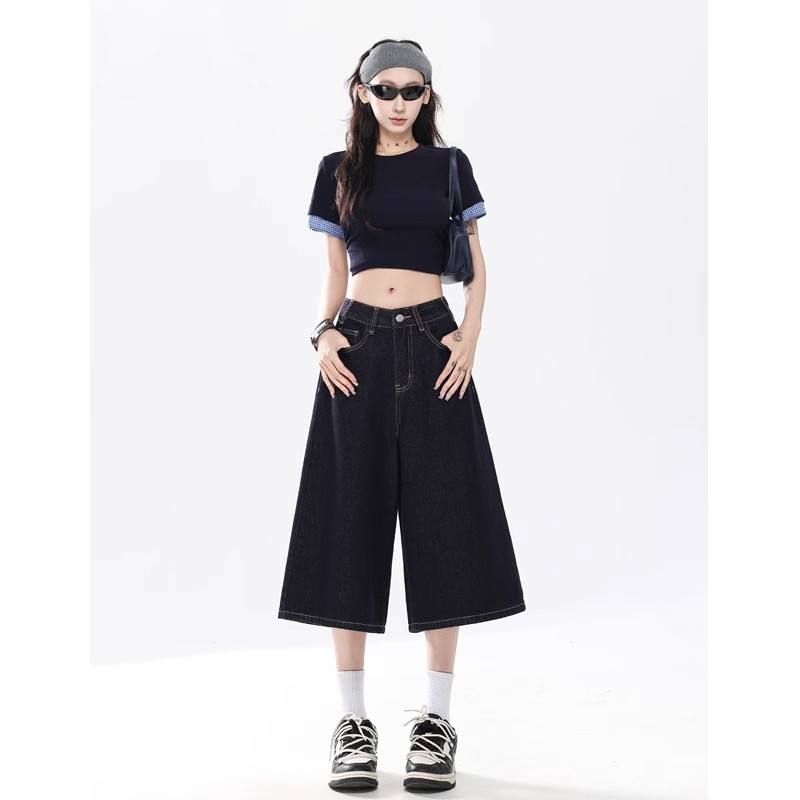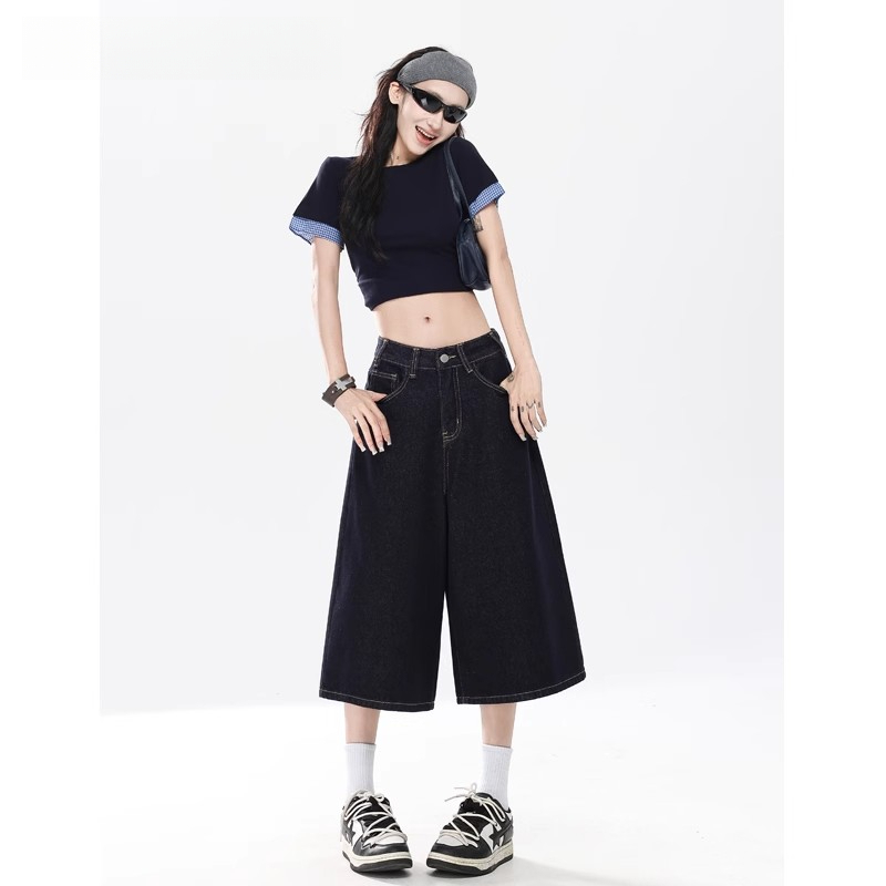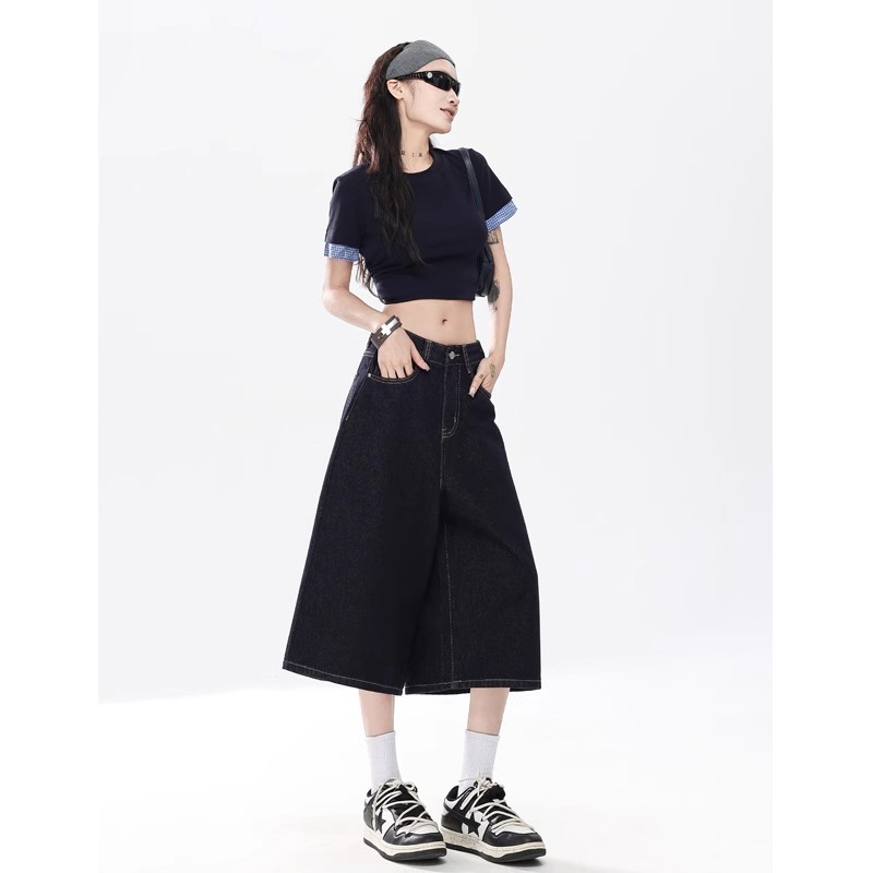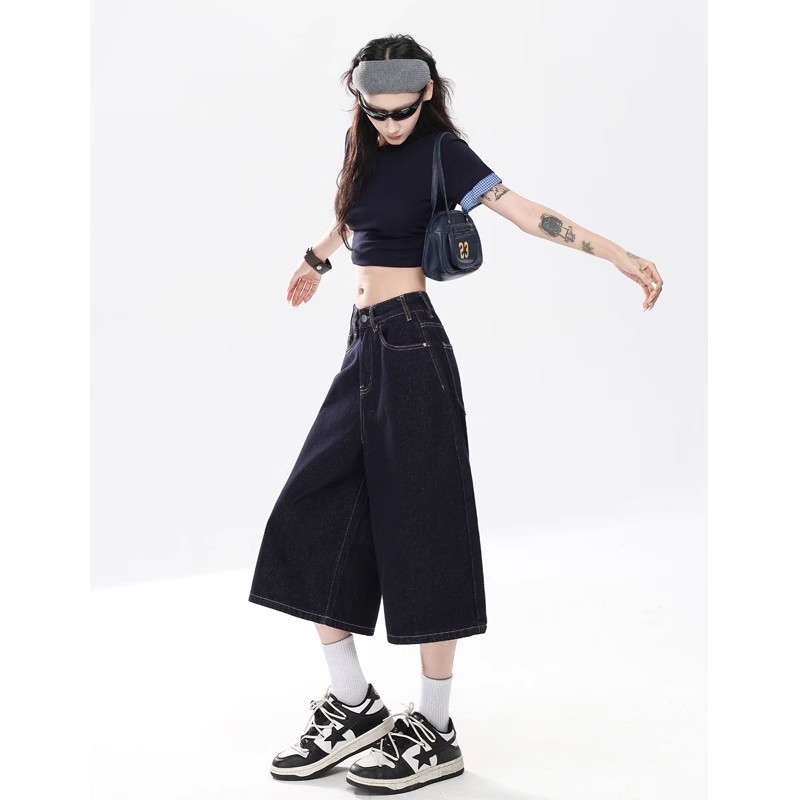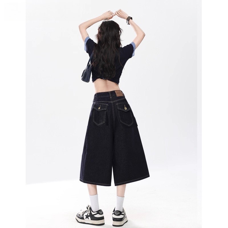 กางเกงขาสั้นผ้ายีนส์สีดําขนาดใหญ่กางเกงขายาวเอวสูงสไตล์อเมริกันและกางเกงขาสั้นฤดูร้อนหลวมกว้าง