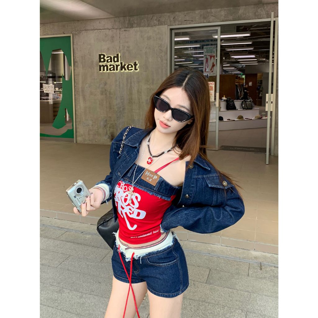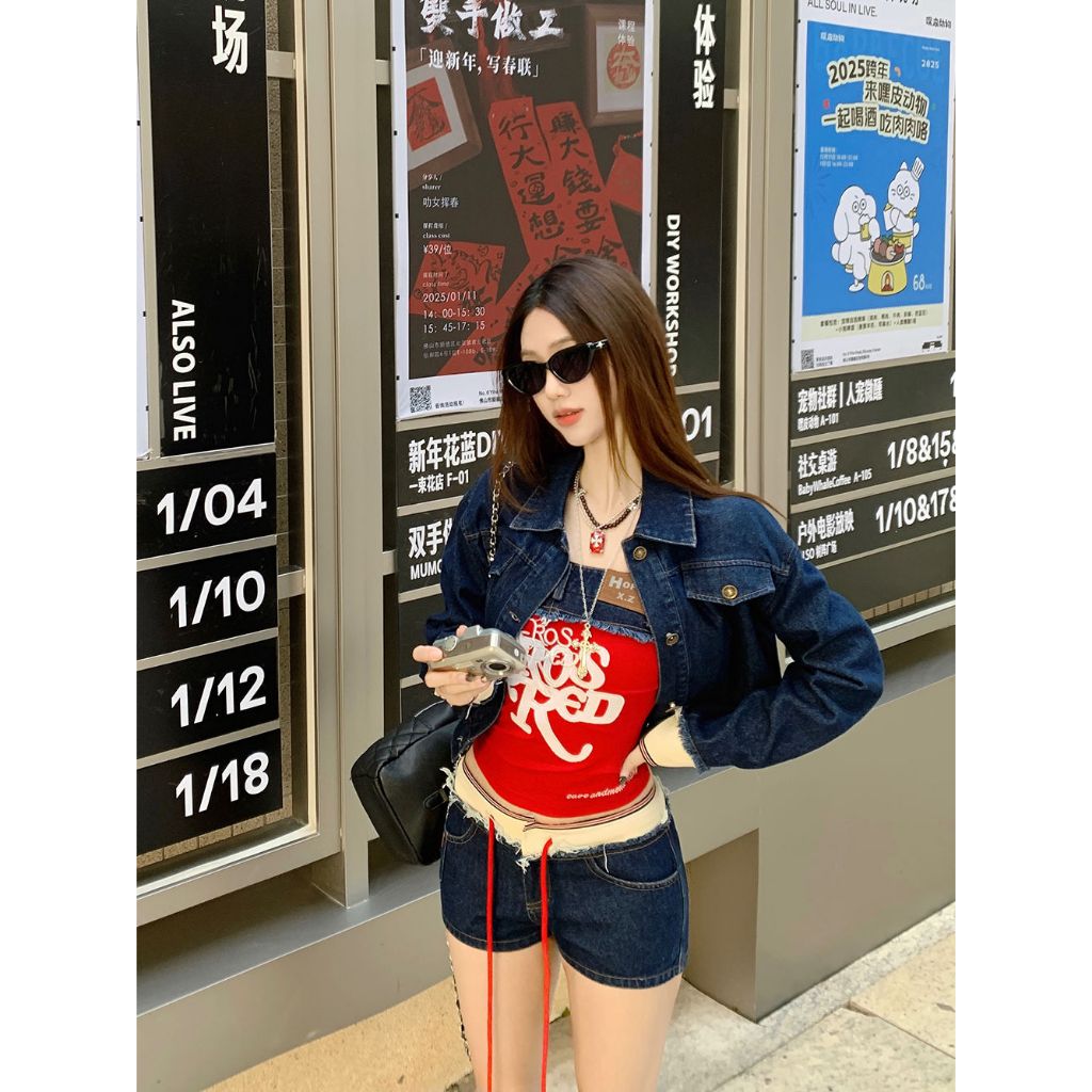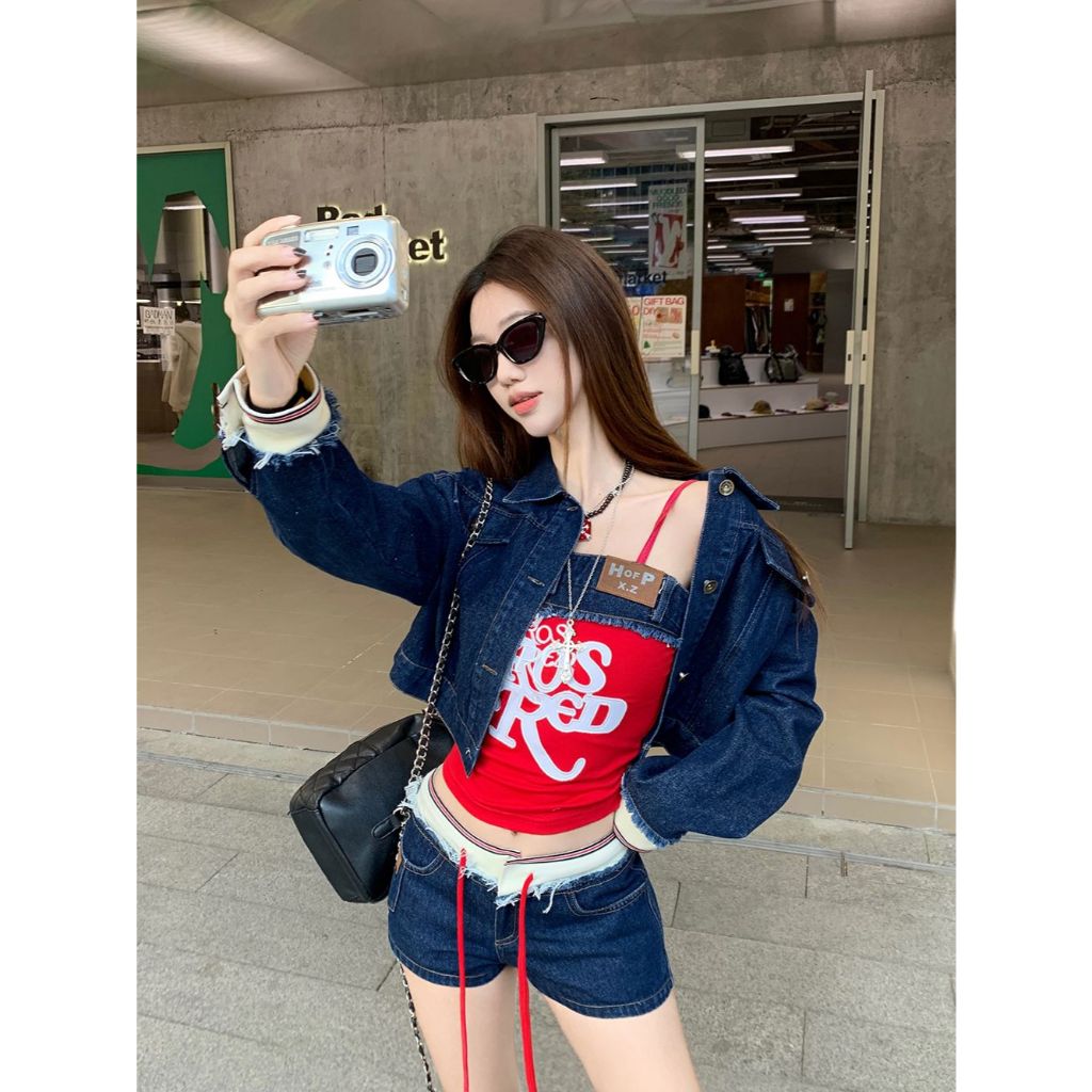 กางเกงขาสั้นผู้หญิง กางเกงยีนส์ขาสั้น ทรงเข้ารูป มีเชือกที่เอว สไตล์Y2K ดูเอวผอม #010286