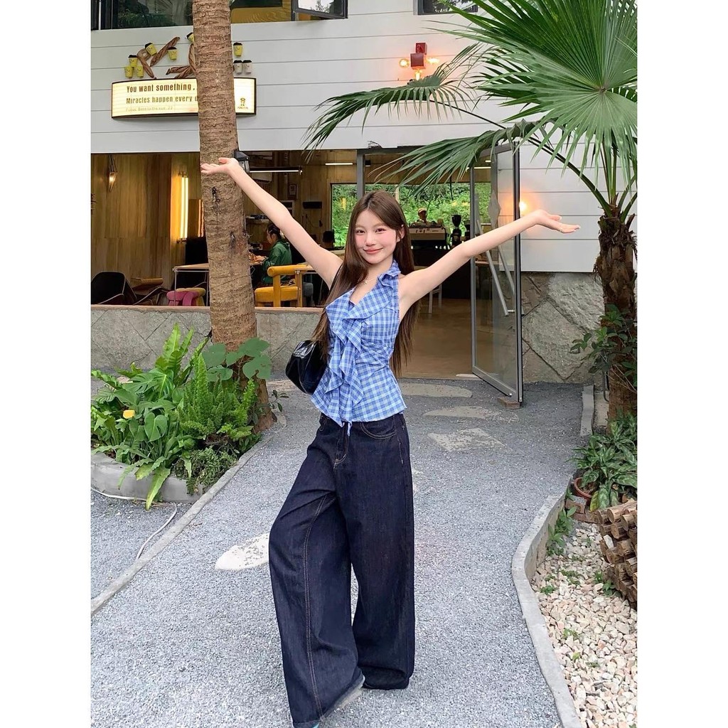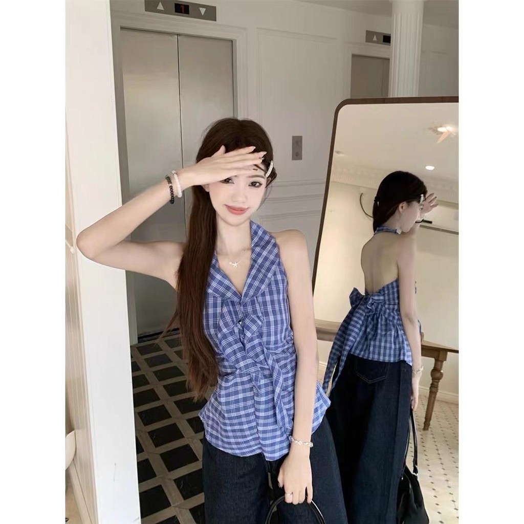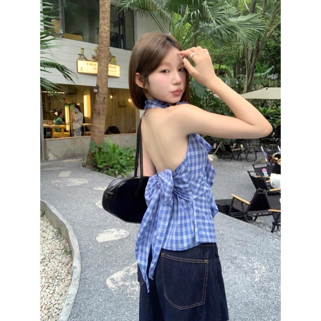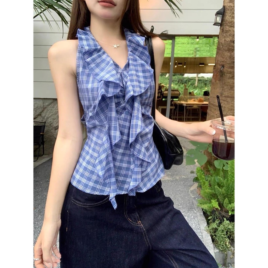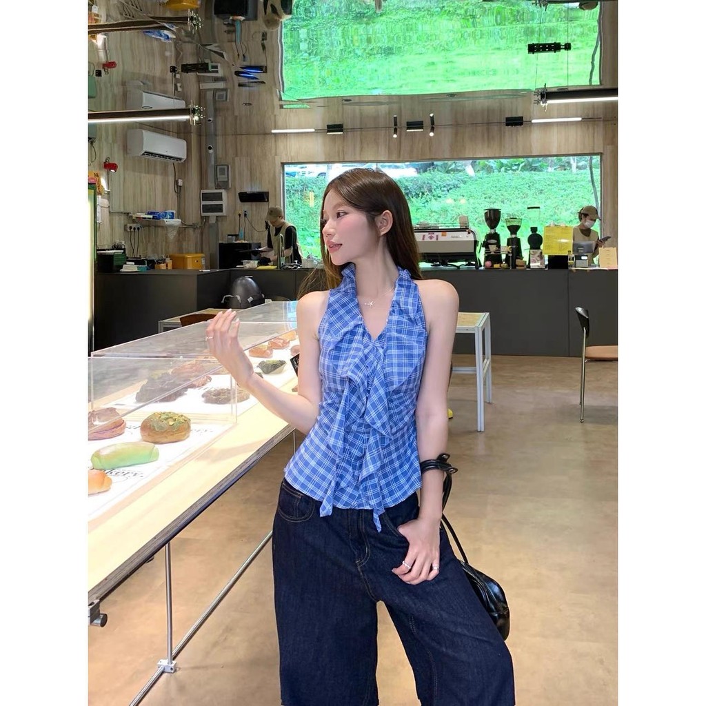 ส่งทันที Cici(NO. Y6336) เสื้อคล้องคอลายตารางสีน้ำเงินคอวี ผ้าฝ้ายผูกหลังสไตล์เรโทร ด้านหน้าแต่งระบาย