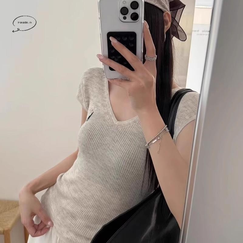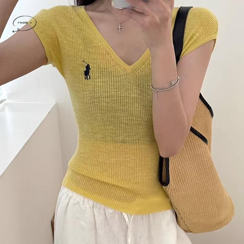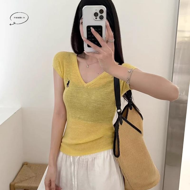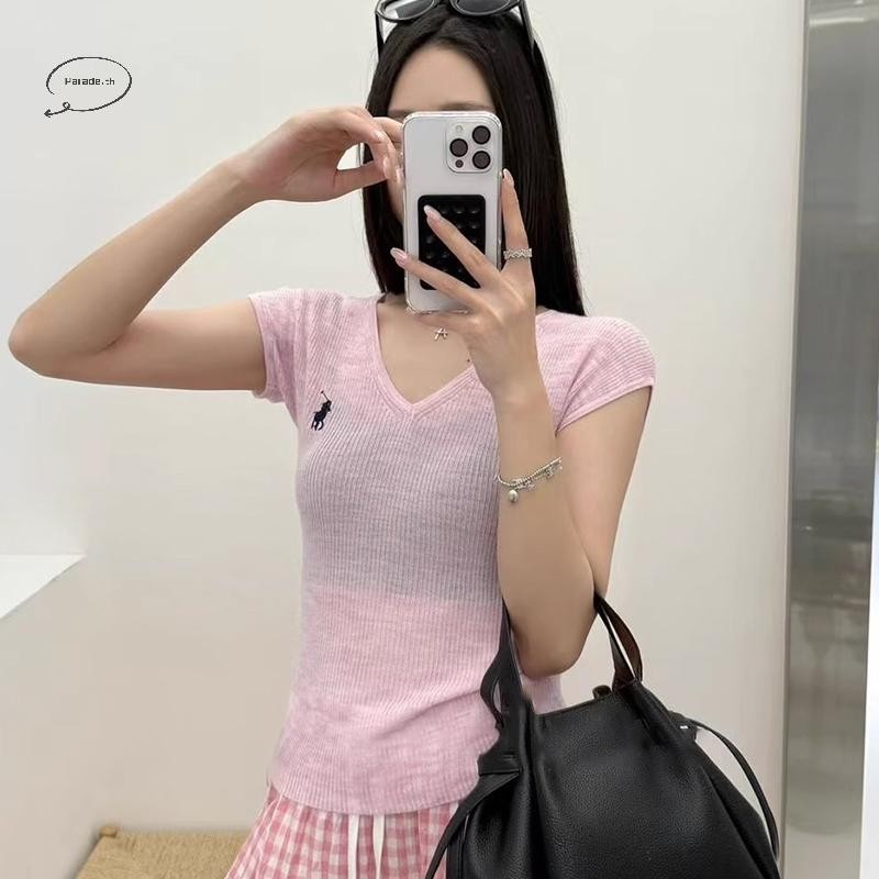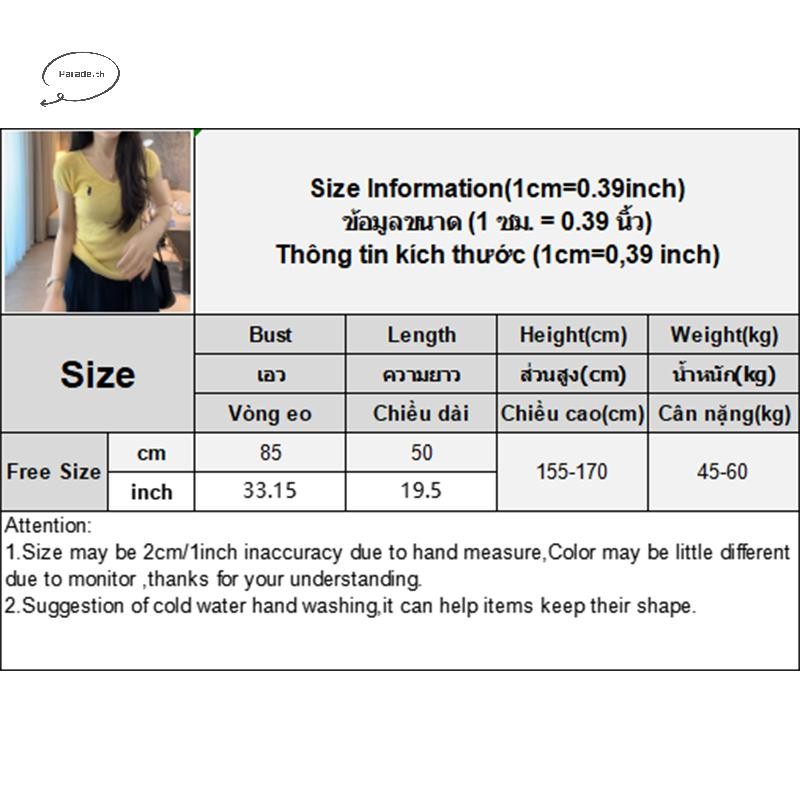 Parade เกาหลีปัก V คอแขนสั้นลําลองถักเสื้อยืดสําหรับผู้หญิง TH