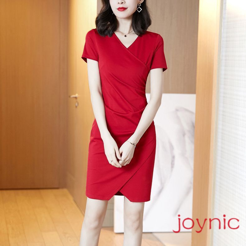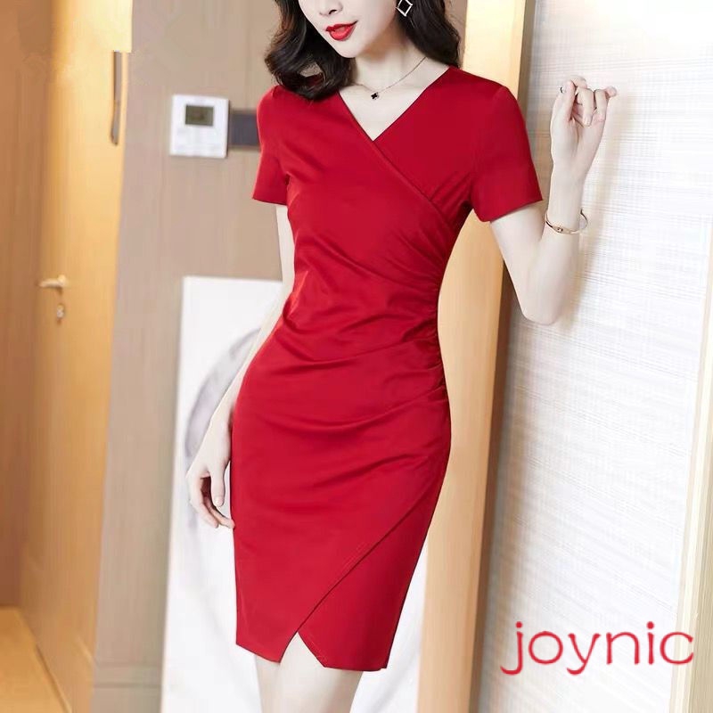 ✨joynic✨ จุด ชุดธุรกิจ ชุดฤดูร้อนใหม่ของผู้หญิง อารมณ์เป็นกระโปรงสะโพกแพคเกจบาง แยกแขนสั้นสีดำกระโปรงขั้นตอนเดียวชุดฤดูร